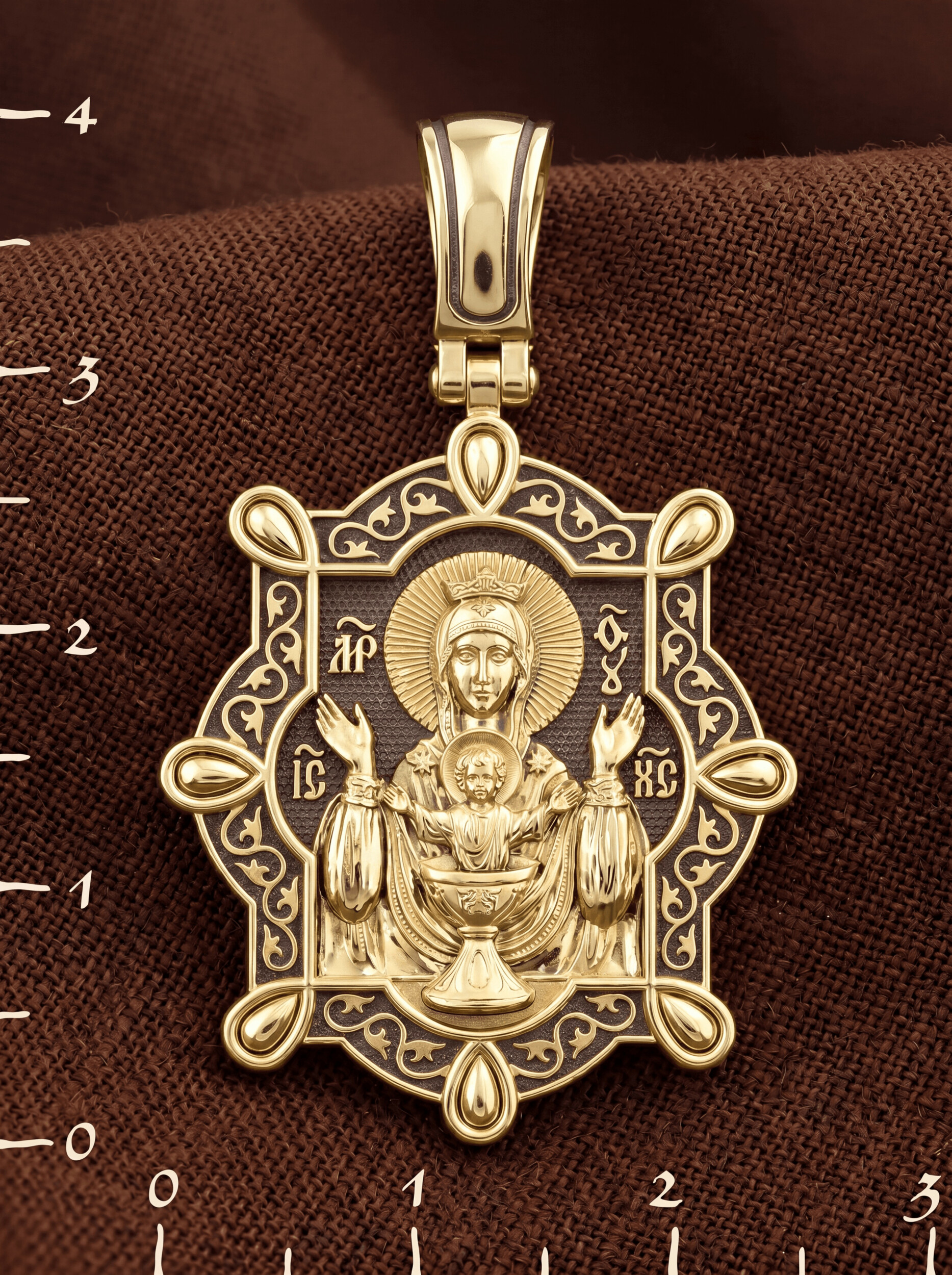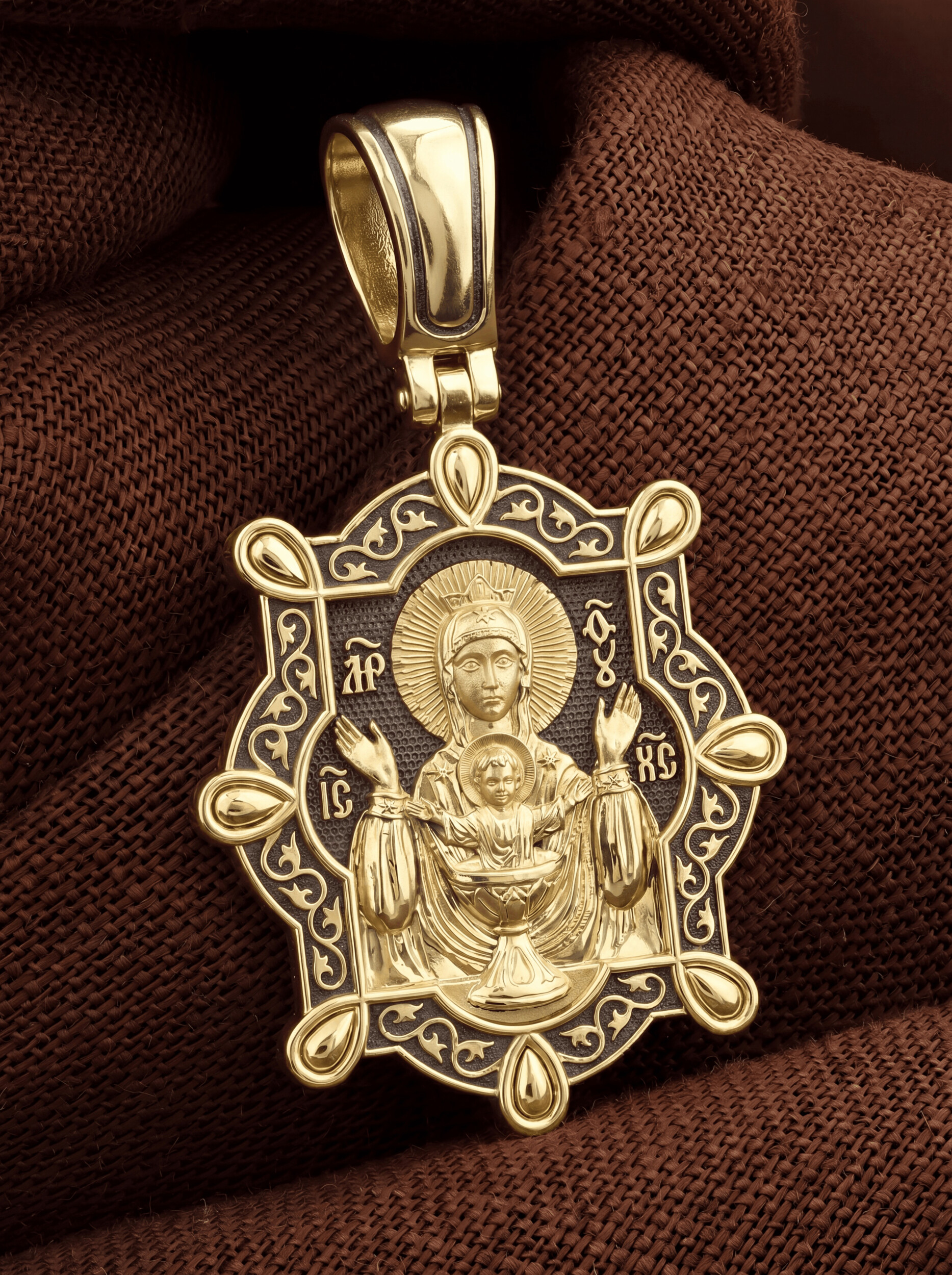 На лицевой части образка изображена икона Божией Матери «Неупиваемая чаша». Икона славится помощью в исцелении зависимостей, помогает людям обрести свободу от греховных страстей.