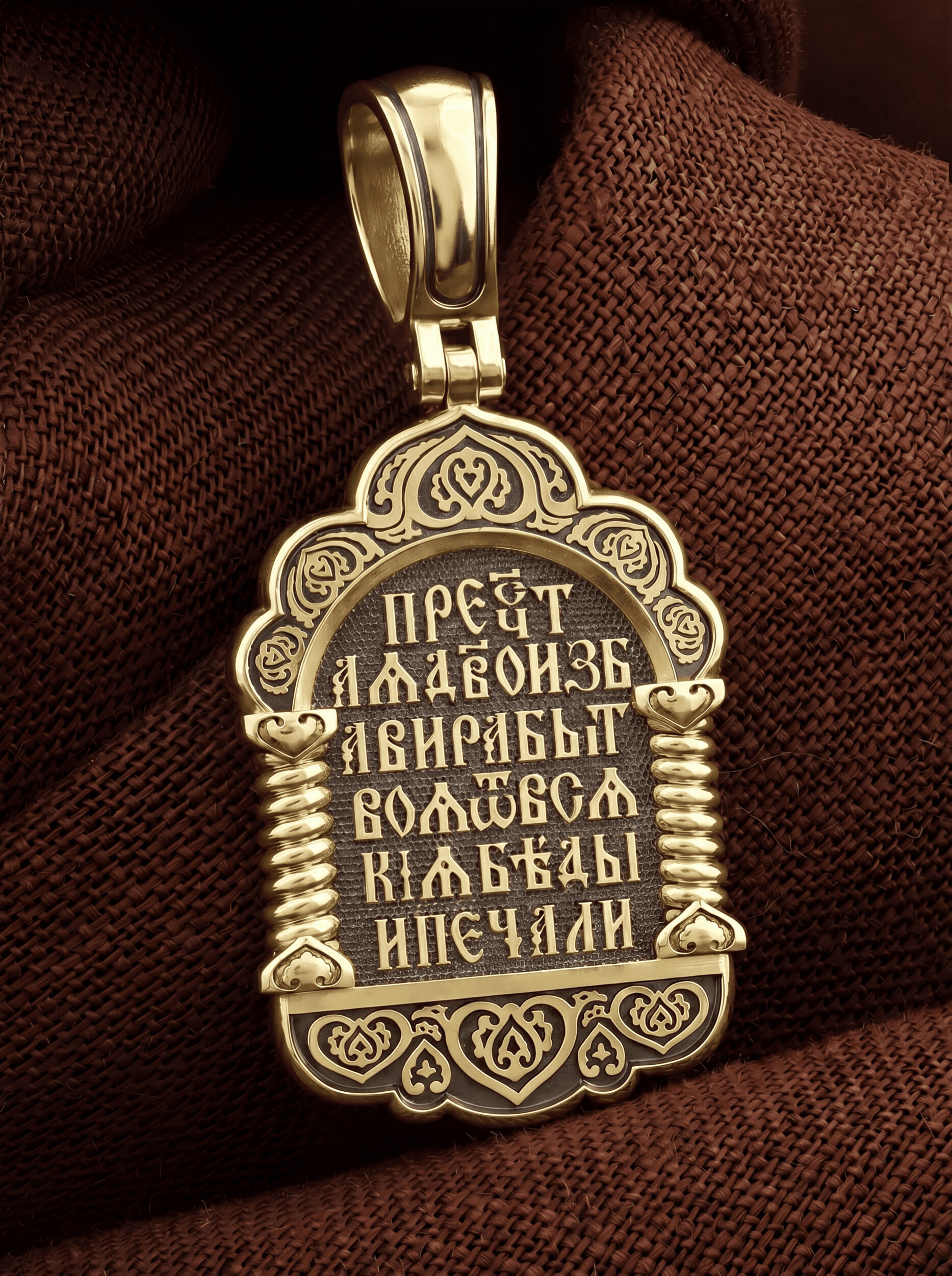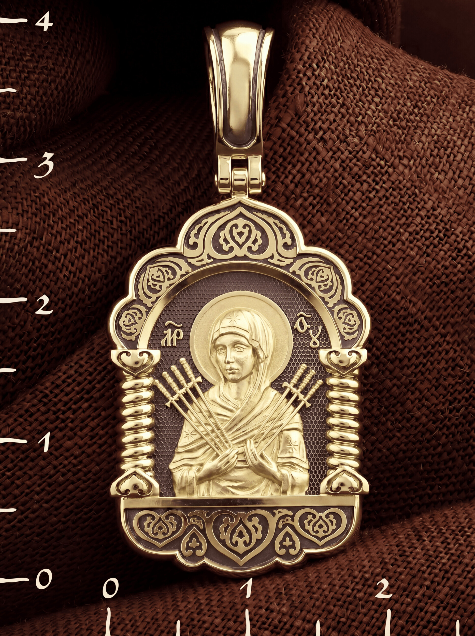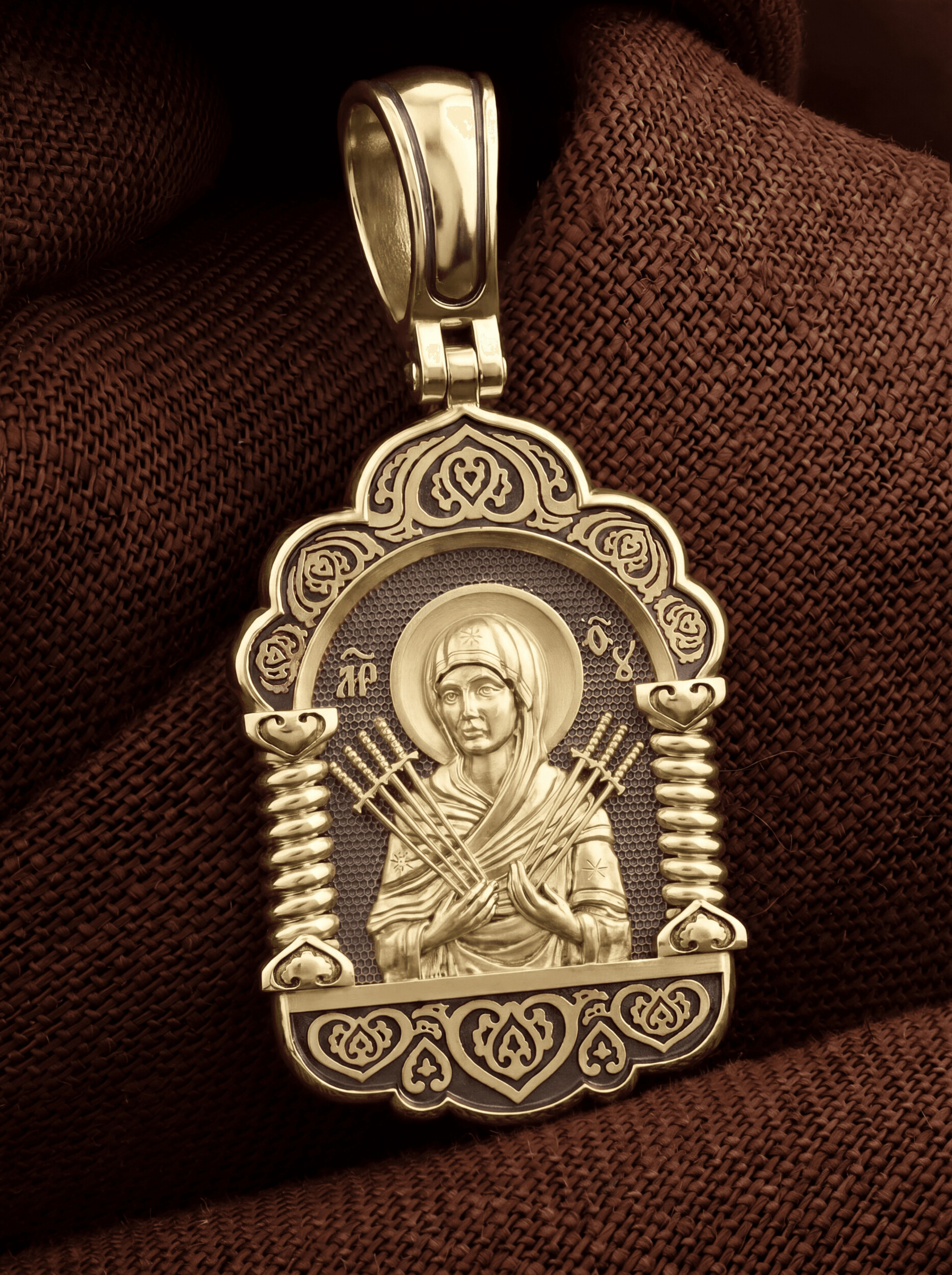 На лицевой стороне образка изображена икона Пресвятой Богородицы «Семистрельная» — одна из самых чудотворных икон на Руси. На протяжении многих веков христиане взывали к Царице Небесной через эту икону, если в стране начинались войны или мятежи.