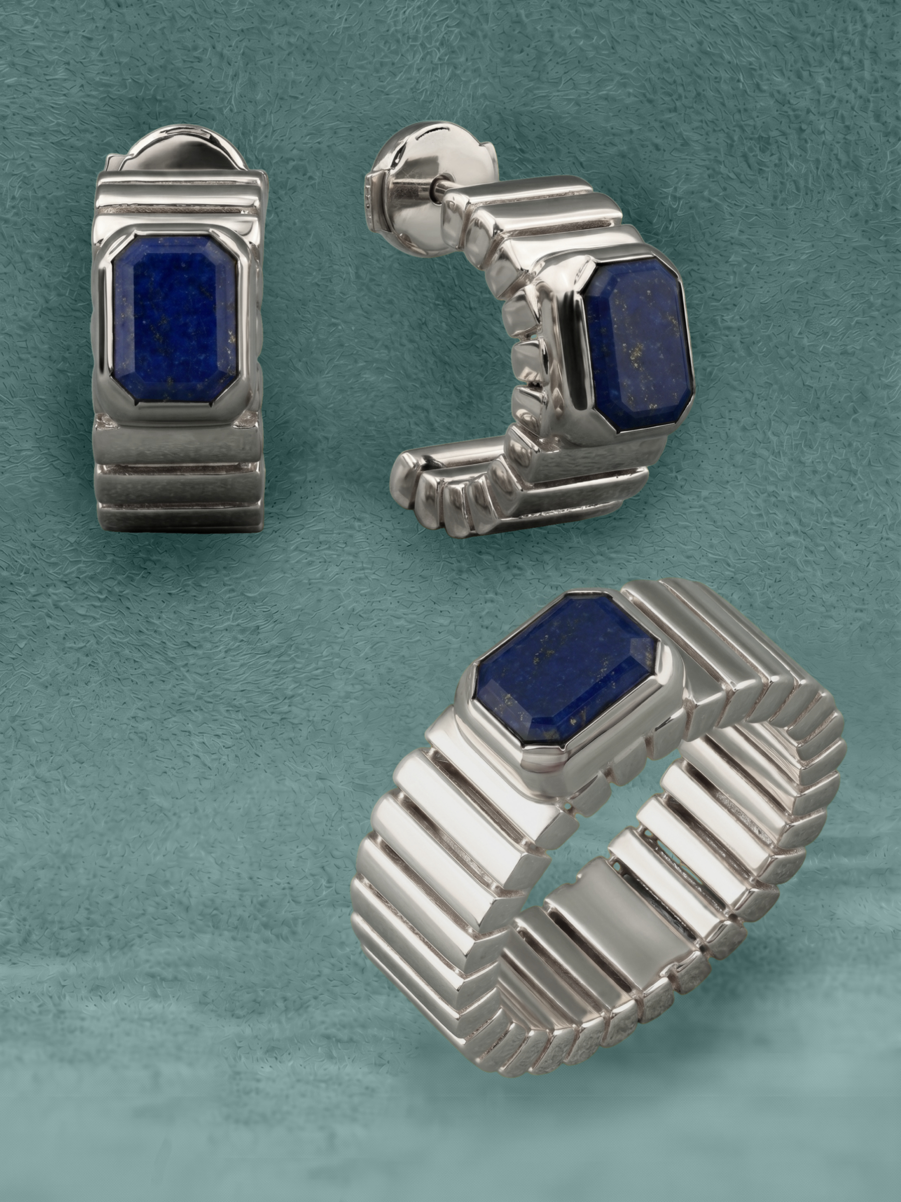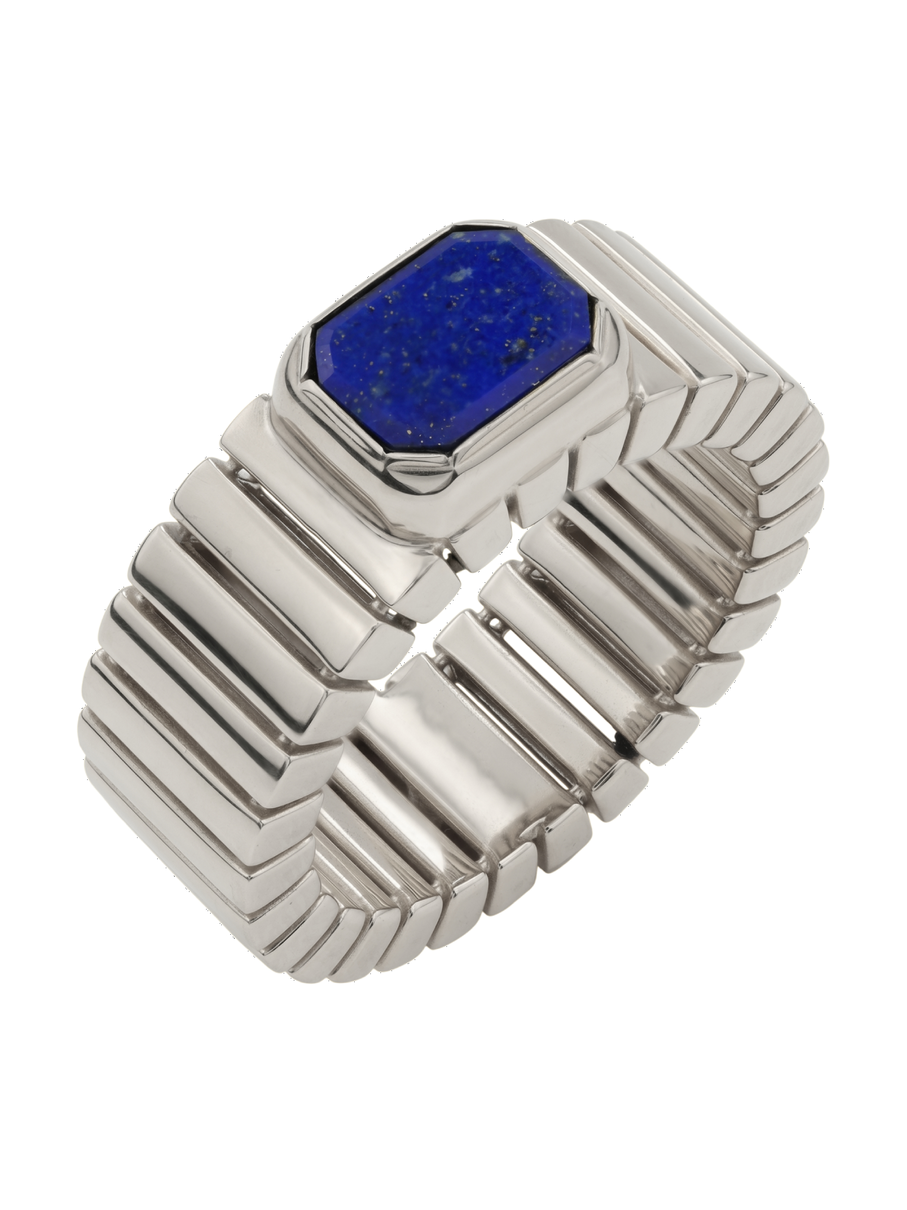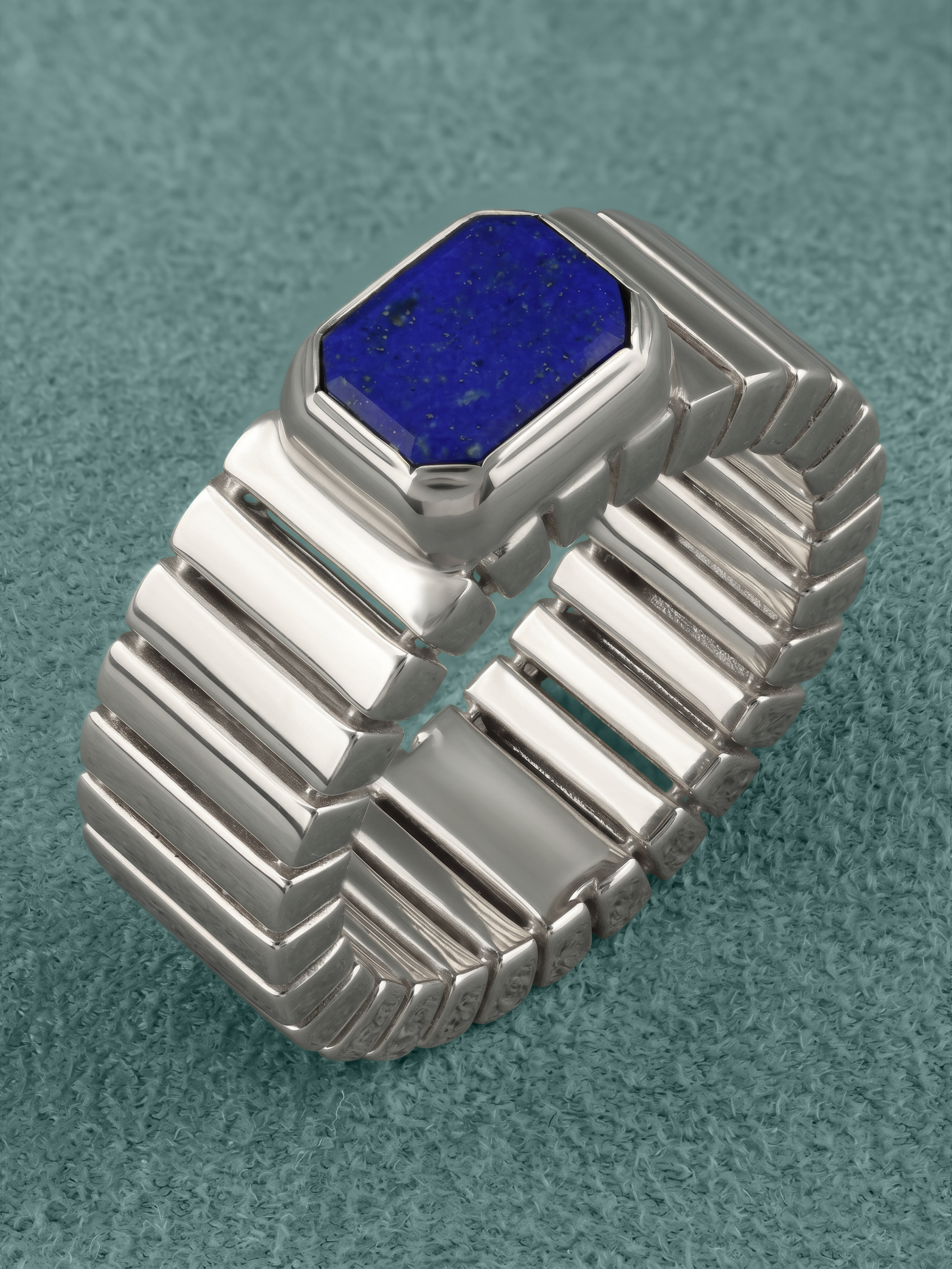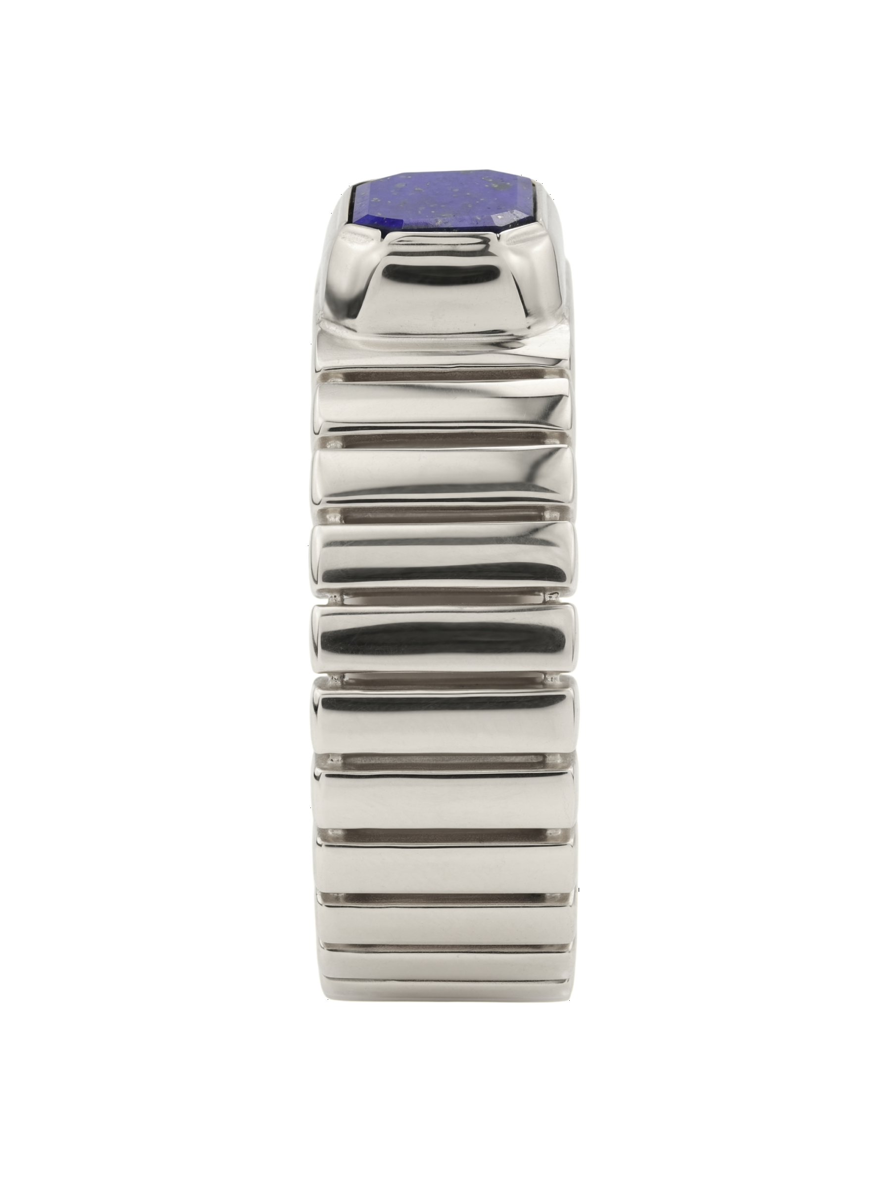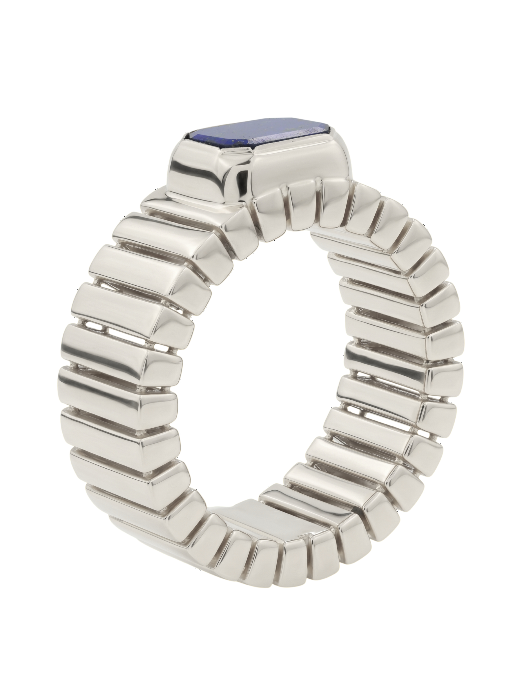 Кольцо из белого золота 585 пробы с глубоким и насыщенным лазуритом — воплощение современной эстетики и строгого стиля. Данное украшение, представленное в коллекции Vioretty — Geometria, отличается архитектурным дизайном: объемная шинка с ярко выраженным рельефным рисунком создает динамичный и запоминающийся образ. В центре композиции расположена одна вставка из натурального лазурита синего цвета, ограненная в форме октагона, что придает изделию статусность и строгую элегантность.