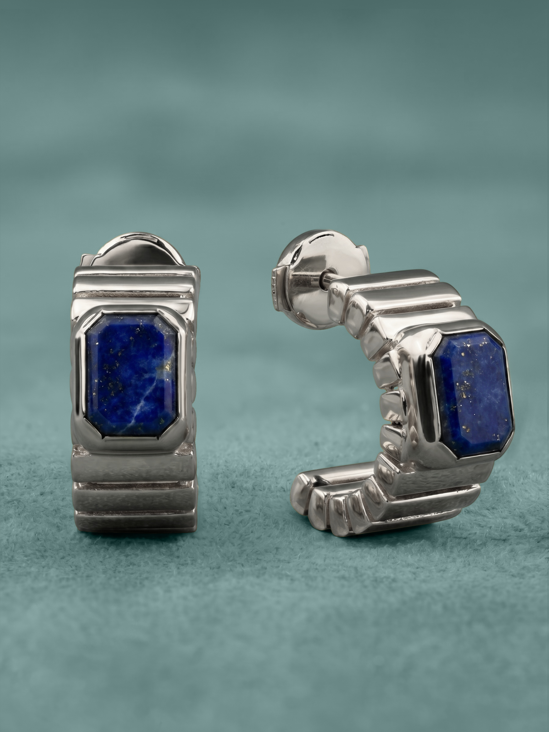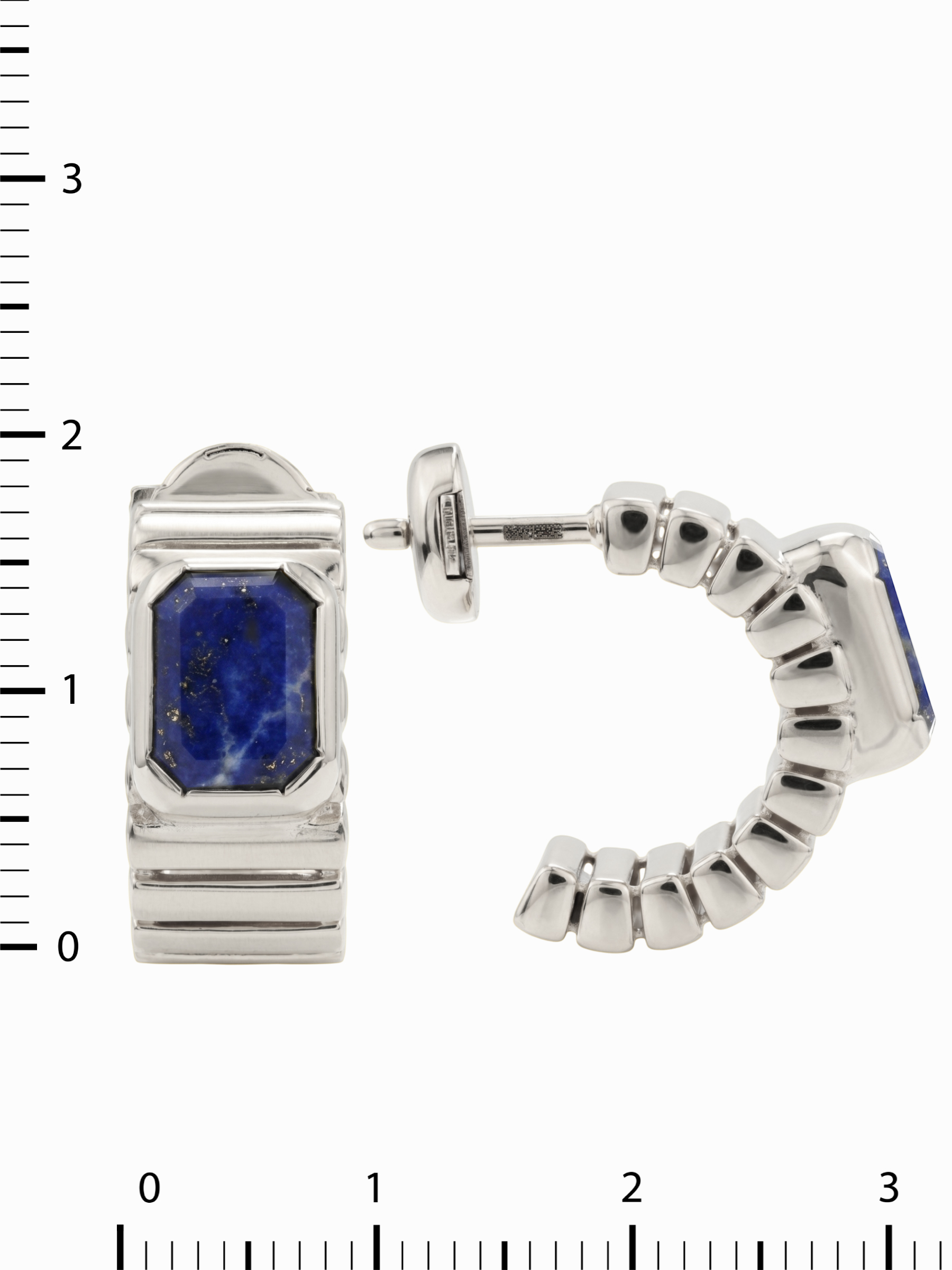 В качестве вставки использован натуральный лазурит насыщенного синего цвета. Камень имеет четкую форму октагон, что придает изделию строгость и геометрическую точность, характерную для серии. Всего в изделии предусмотрено 2 вставки, которые гармонично дополняют архитектурную форму золотого каркаса.