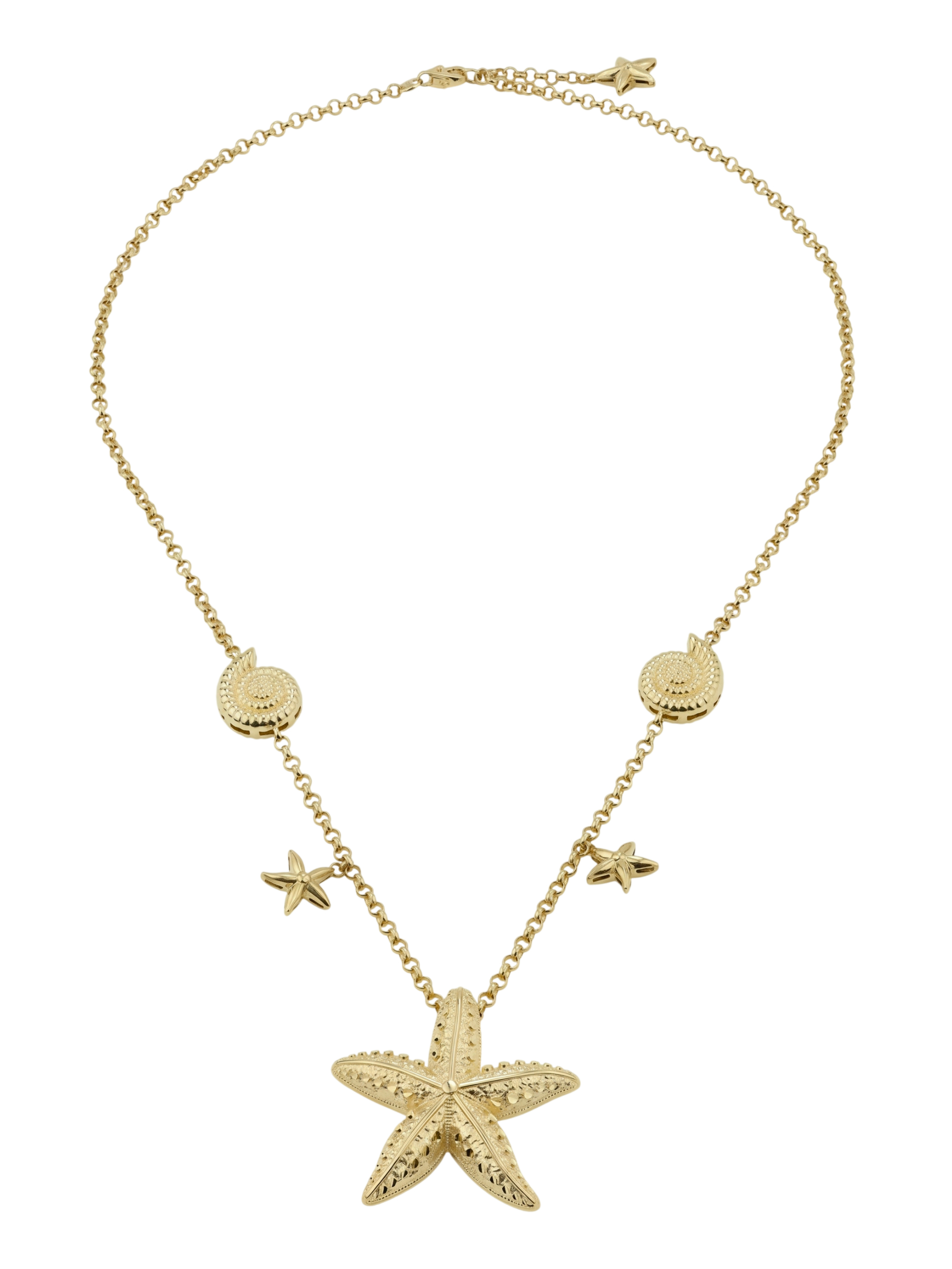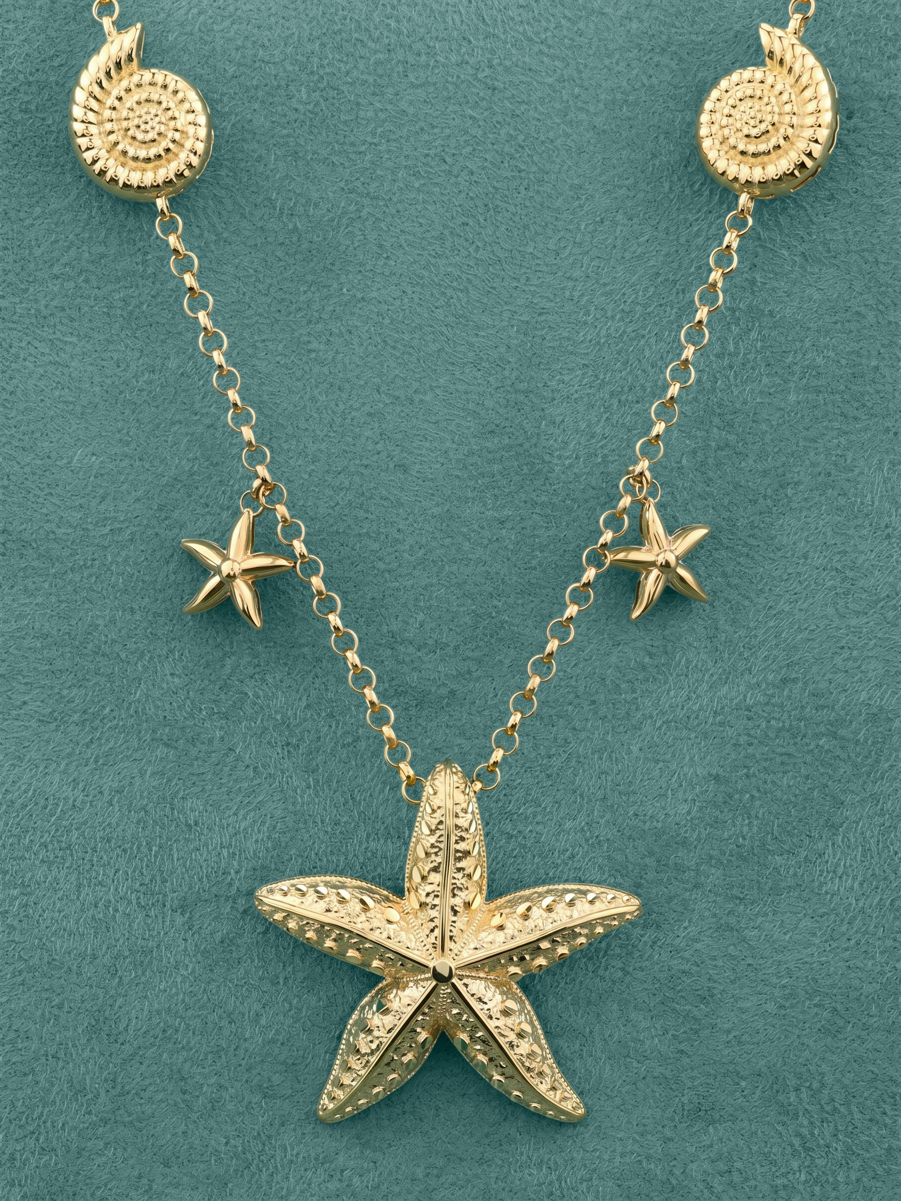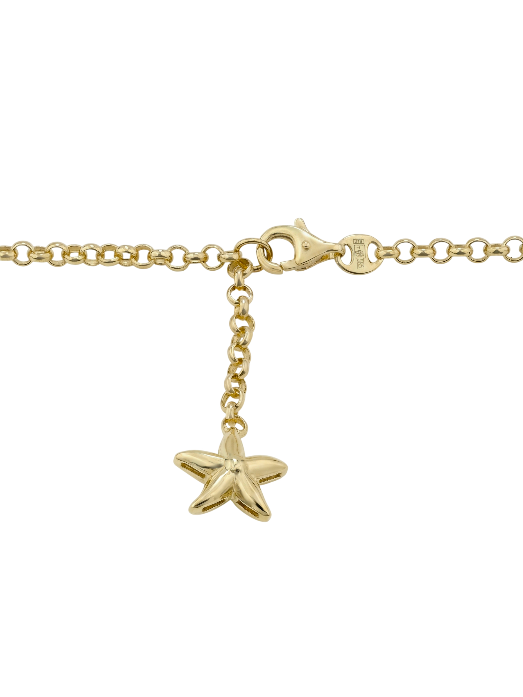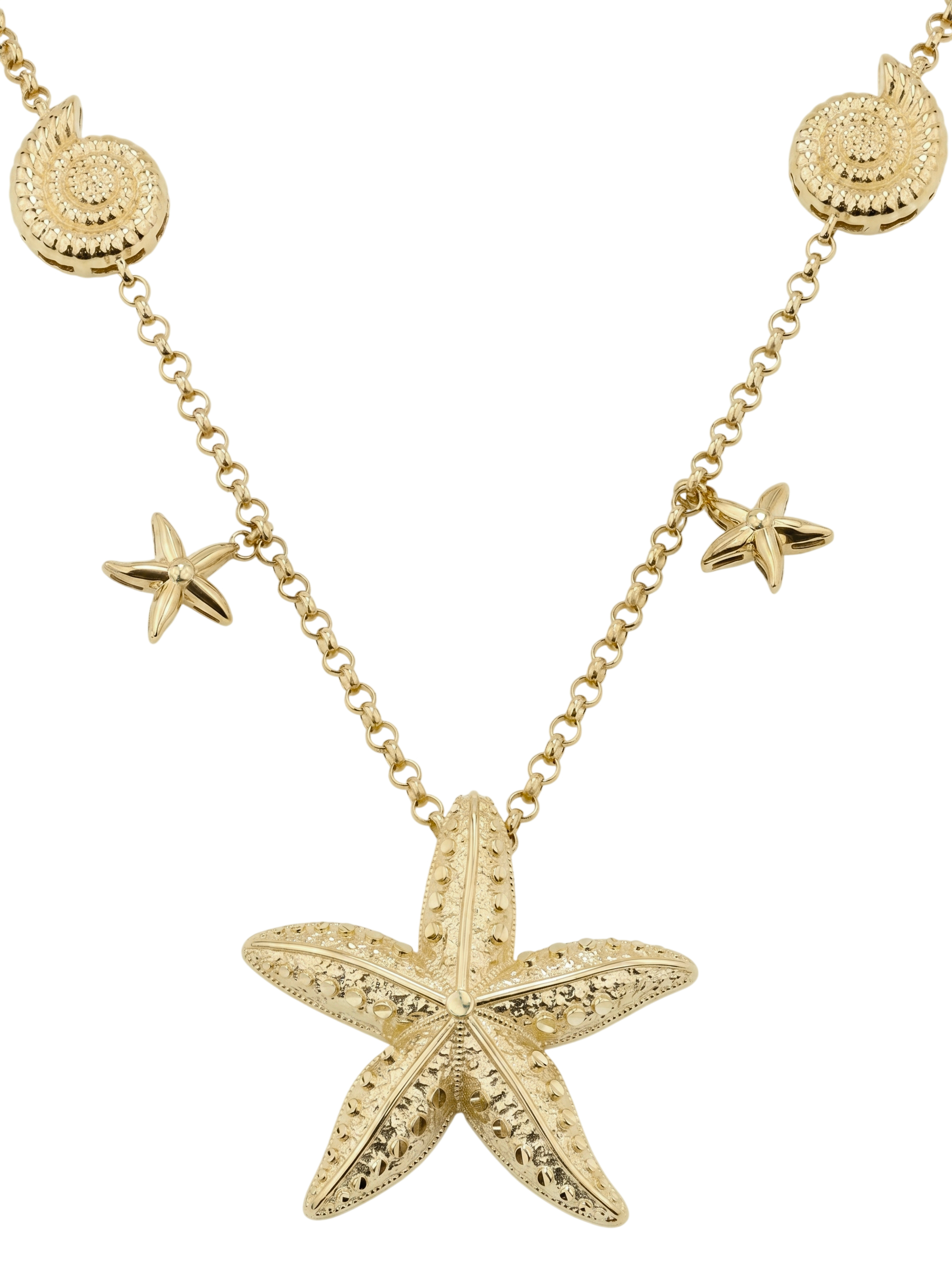Погрузитесь в атмосферу морской эстетики с изысканным колье из лимонного золота, представленным в рамках коллекции Vioretty — Oceano. Это украшение станет воплощением вашего стиля и любви к утонченным деталям. Дизайн изделия вдохновлен красотой океанских глубин: центральным элементом колье выступает детализированная подвеска в форме морской звезды, дополненная лаконичными элементами в виде ракушек и миниатюрных звезд по всей длине цепочки.