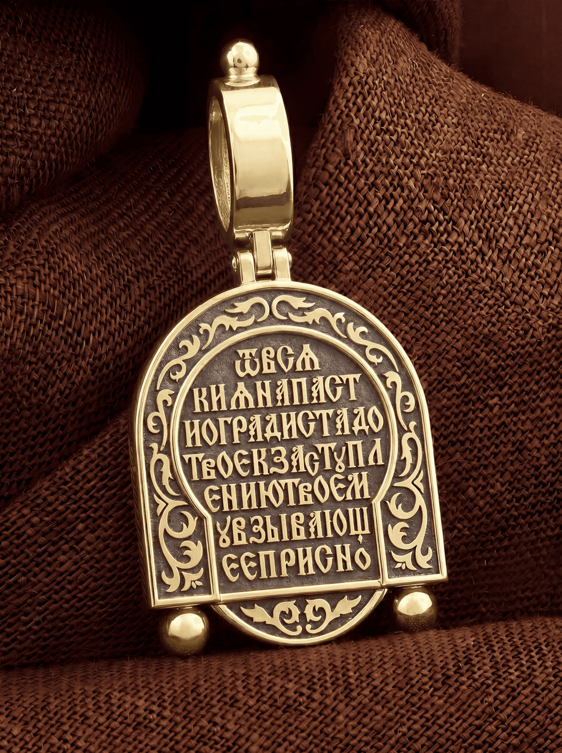 На обороте образка написана молитва Богородице в честь Ее иконы «Всецарица» (Пантанасса): «От всякия напасти огради стадо Твое, к заступлению Твоему взывающее присно».