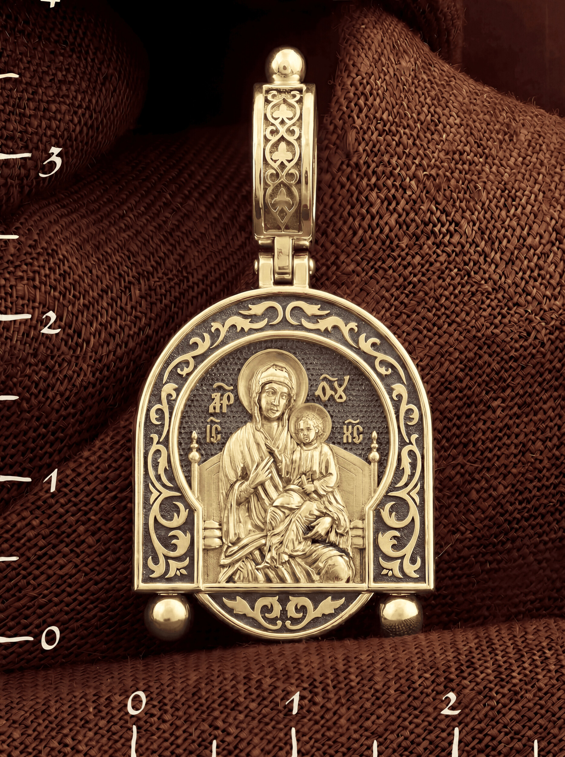 В центр образка помещен образ Божией Матери «Всецарица», восседающая на царском троне. На руках Ее — Богомладенец Иисус Христос со свитком в левой руке. Пальцы Его правой руки сложены в благословляющем жесте.