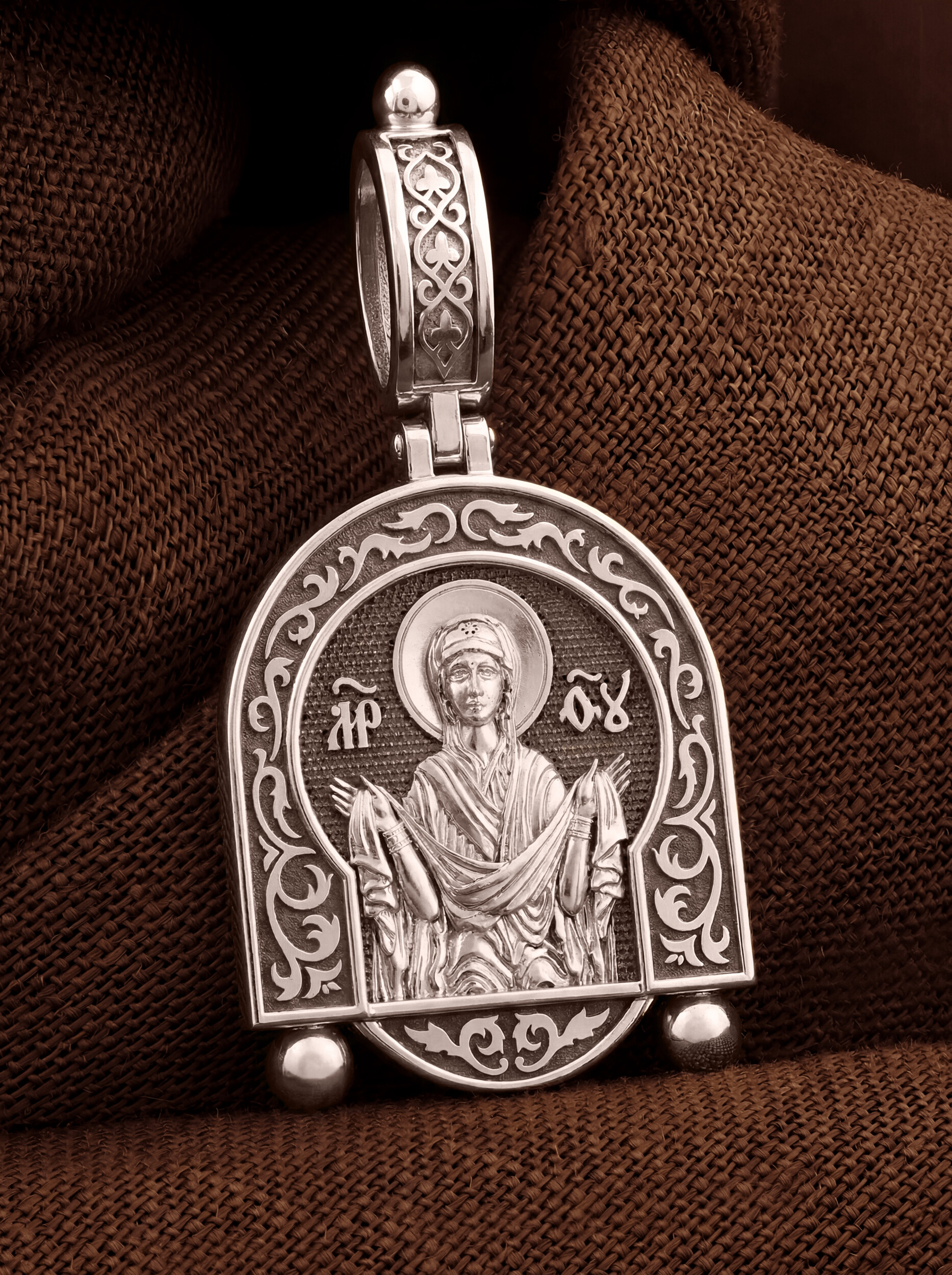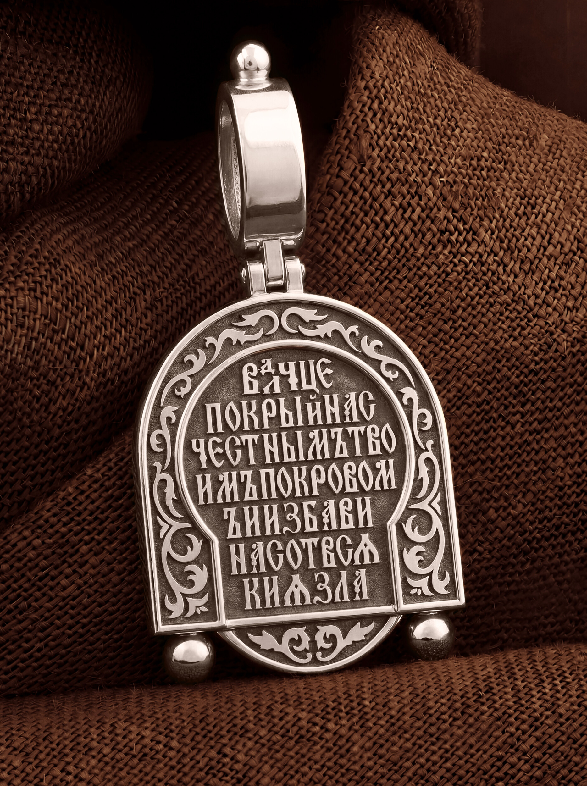 На лицевой части образка изображена икона Покров Пресвятой Богородицы. Праздник Покрова Божией Матери является воспоминанием чуда, которое произошло во Влахнернской церкви 1 (14) октября 910 года: Пресвятая Богородица явилась верующим над алтарем храма и распростерла над ними Свое покрывало. В этот день Божья Матерь открыла людям, что Она является Ходатаицей за них перед Богом. Богородица простирает Свой молитвенный покров над всеми православными христианами и умоляет Сына Своего о даровании вечного спасения каждому человеку.