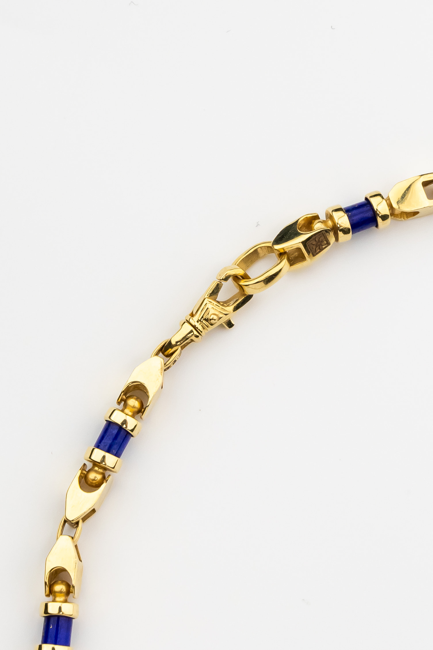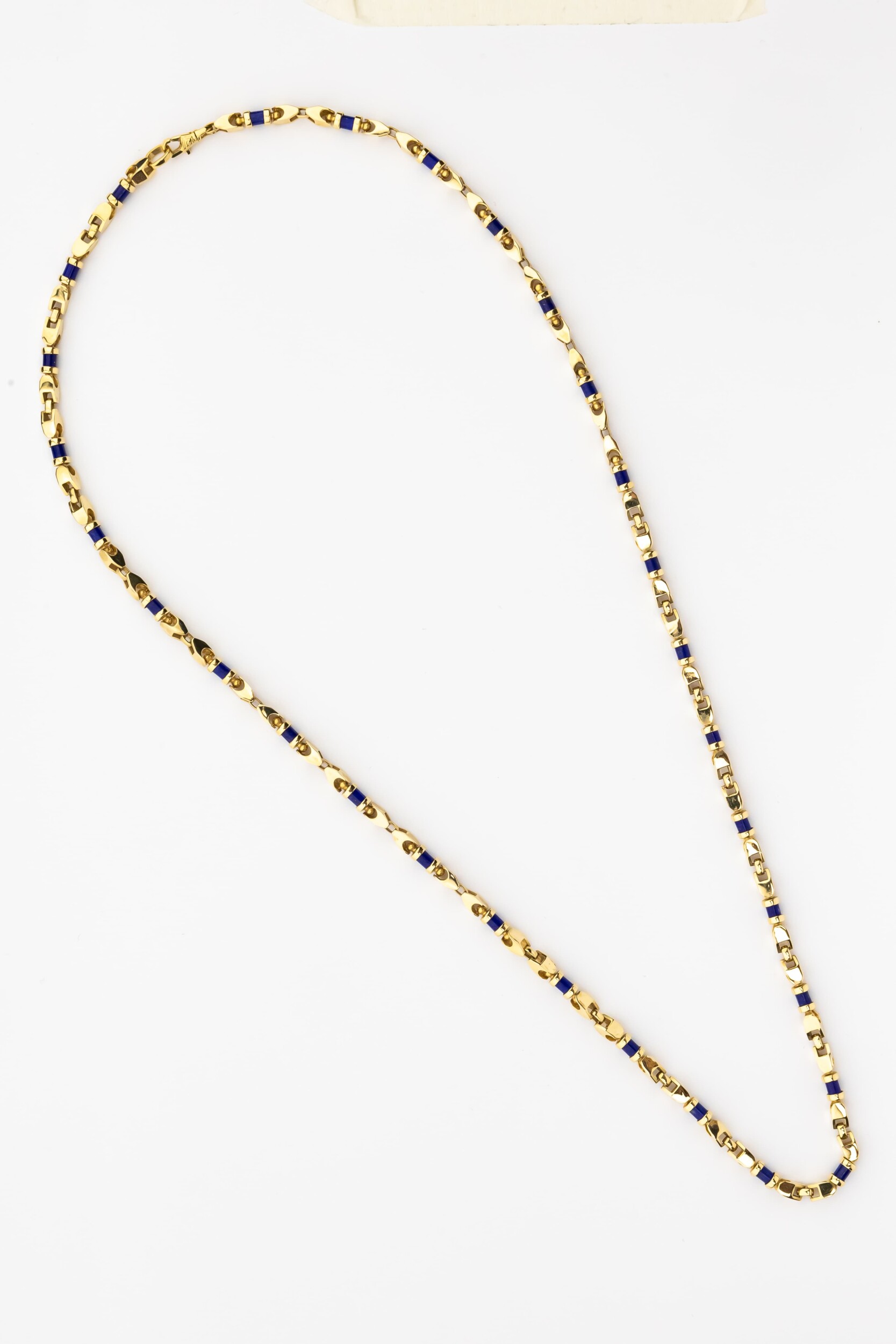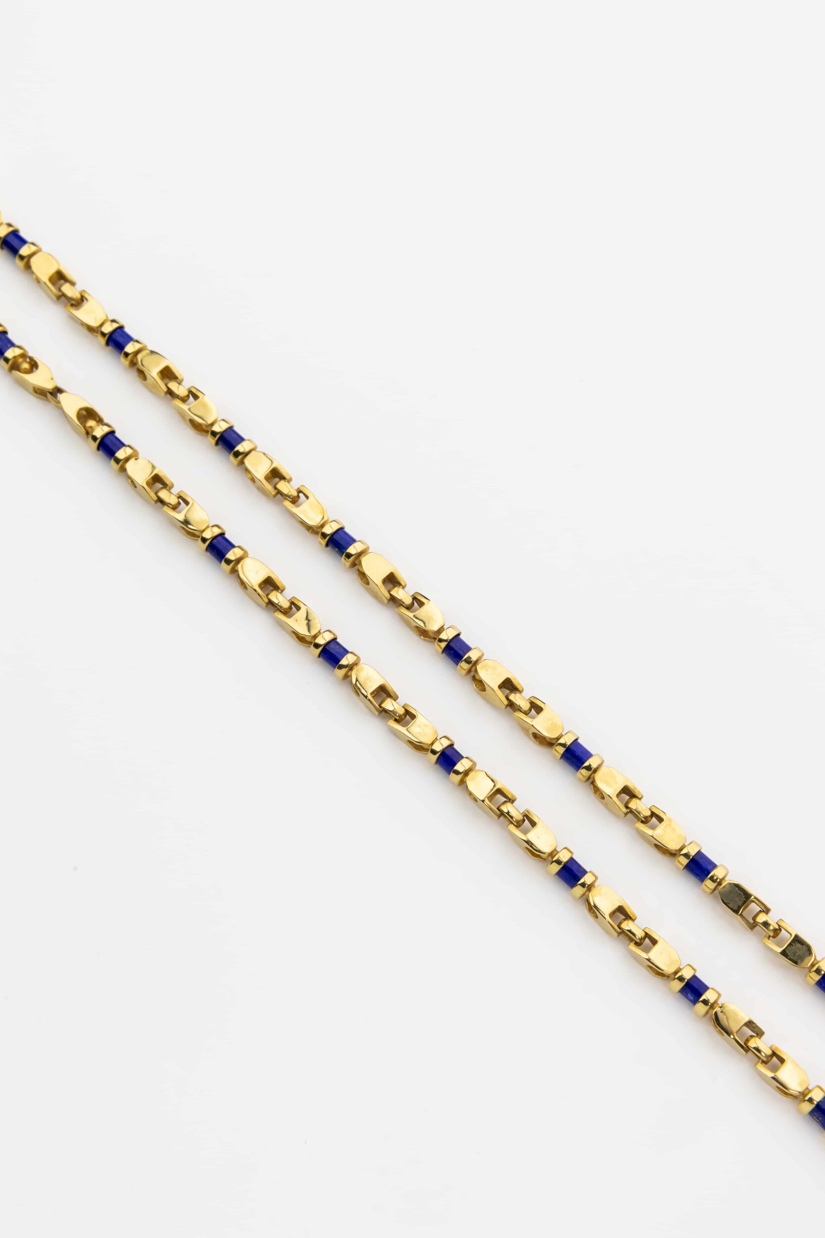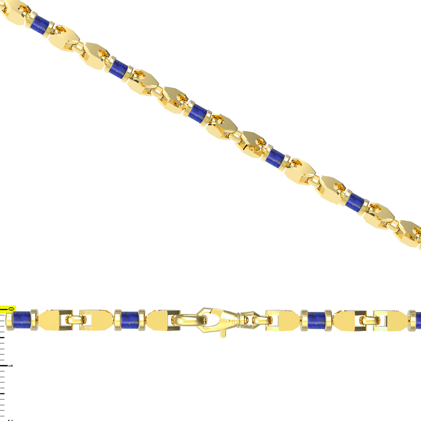 Особую художественную ценность этой цепи придают 175 вставок из натурального лазурита. Камень огранен в форму цилиндра, что придает украшению строгий и геометрически выверенный вид. Чередование золотых звеньев и синих цилиндров создает динамичный рисунок, который притягивает взгляд и делает аксессуар акцентной деталью образа. Дизайн подчеркивает мужской характер изделия, делая его идеальным выбором как для повседневного ношения, так и для особых случаев.