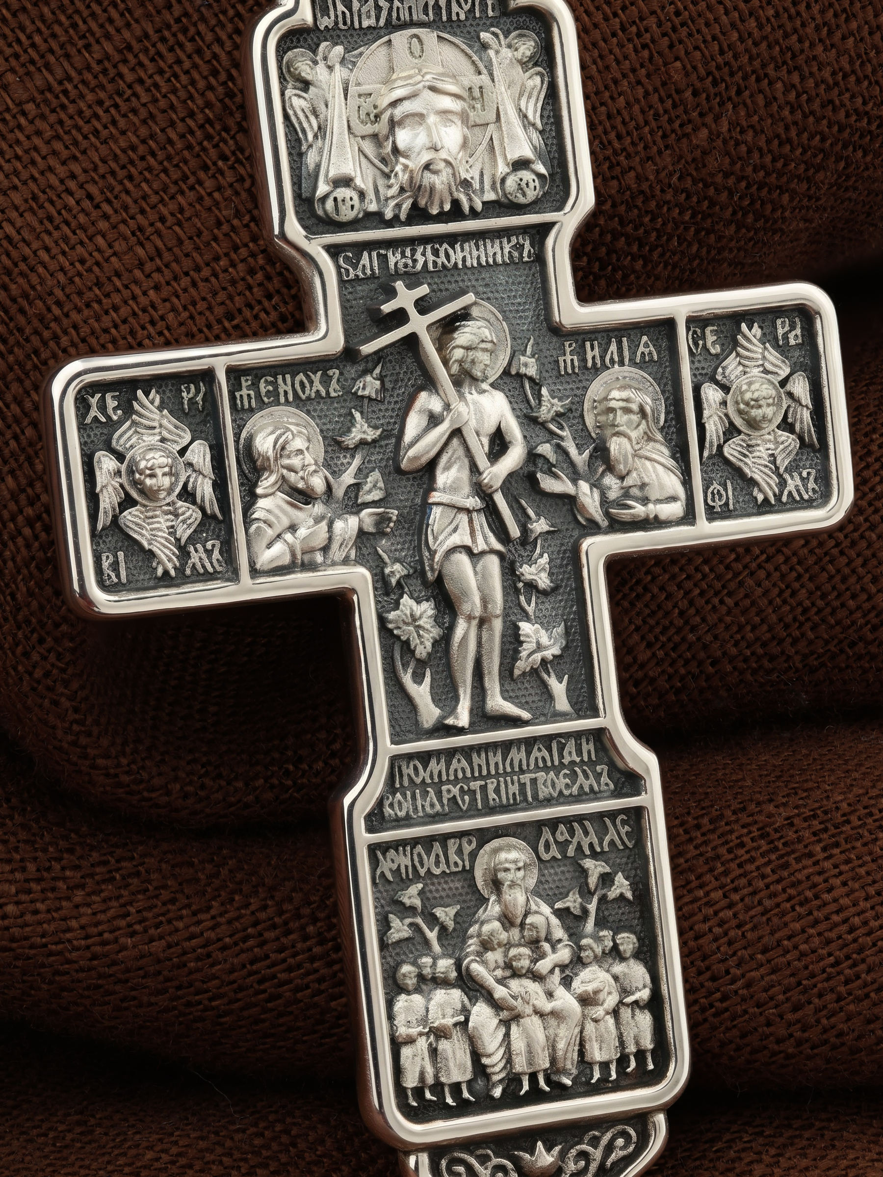 На концах горизонтальной балки креста помещены образы вселенских святителей и творцов литургии Василия Великого и Иоанна Златоуста. В кулонном кольце изображены райские врата с их стражем — Херувимом. Врата, которые открылись благодаря крестной жертве Христа.