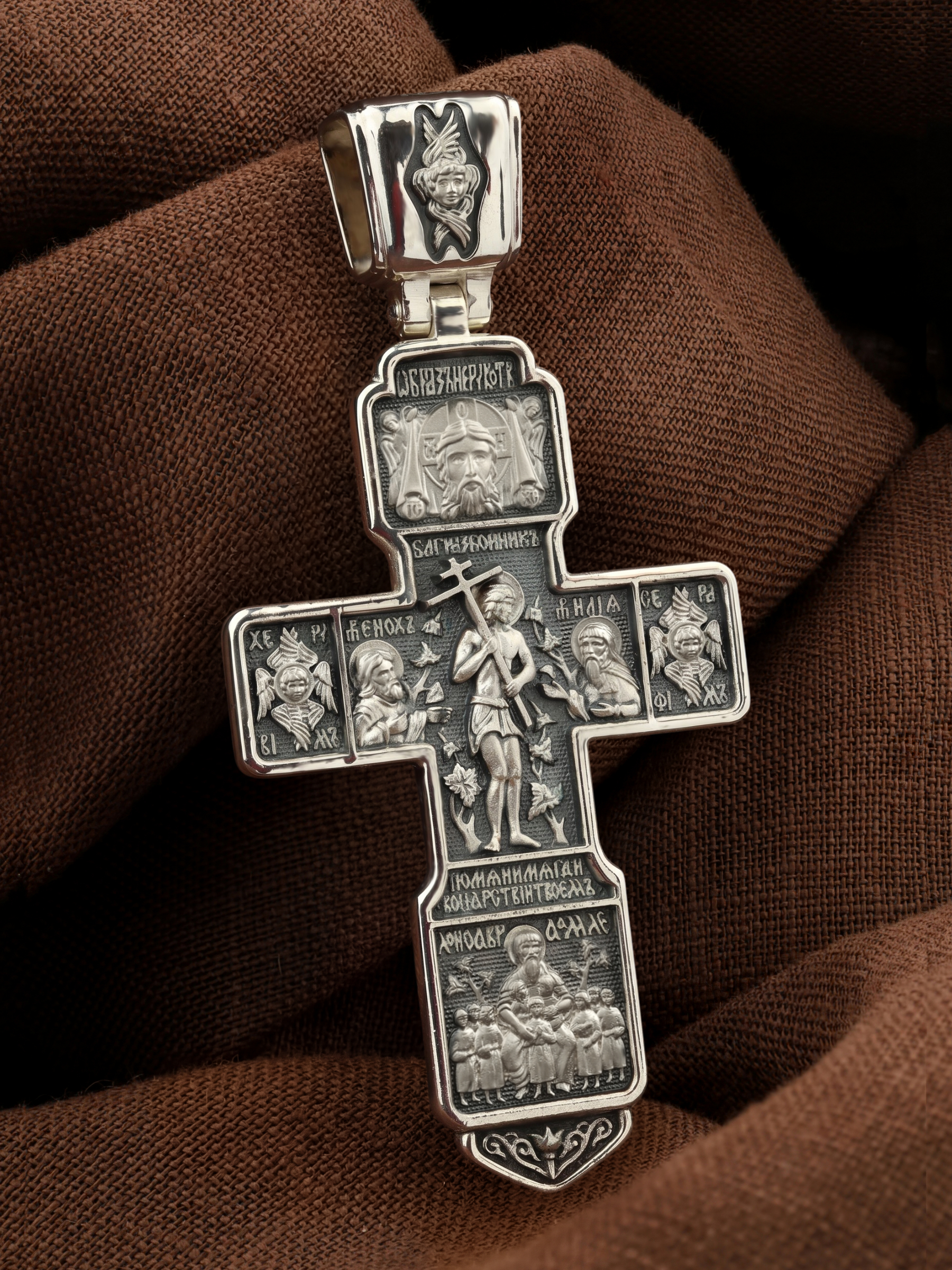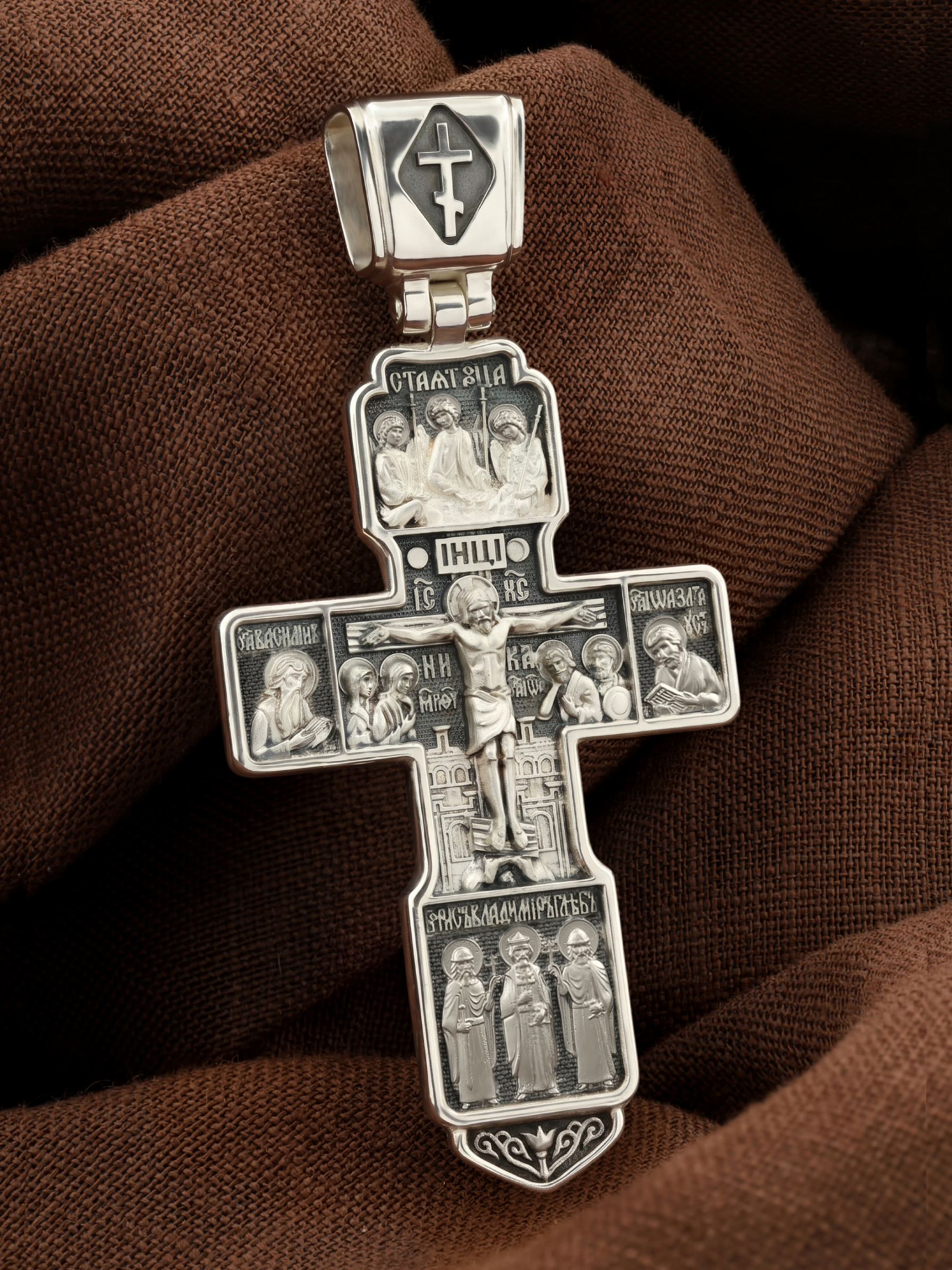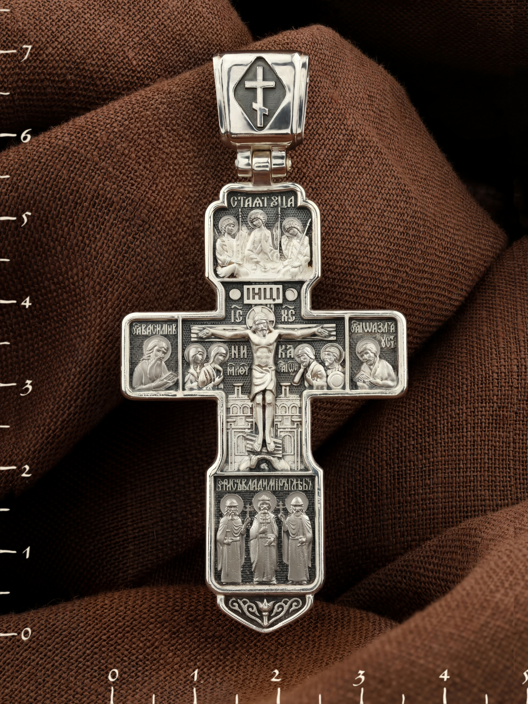 В нижней части креста изображены образы первых русских святых князей-мучеников — Бориса (князь ростовский) и Глеба (князь муромский) и святого равноапостольного князя Владимира. Страстотерпцам Борису и Глебу молятся об умиротворении Отечества, о добром нраве властей и правителей, о сохранении от междоусобицы, о даровании мужества перед лицом смертельной опасности. С Борисом и Глебом неразрывно связан образ их отца — святого равноапостольного князя Владимира, который также почитается как защитник и покровитель Русской Земли и Церкви. В молитвах его называют «отец русский» или «отец всея Руси».