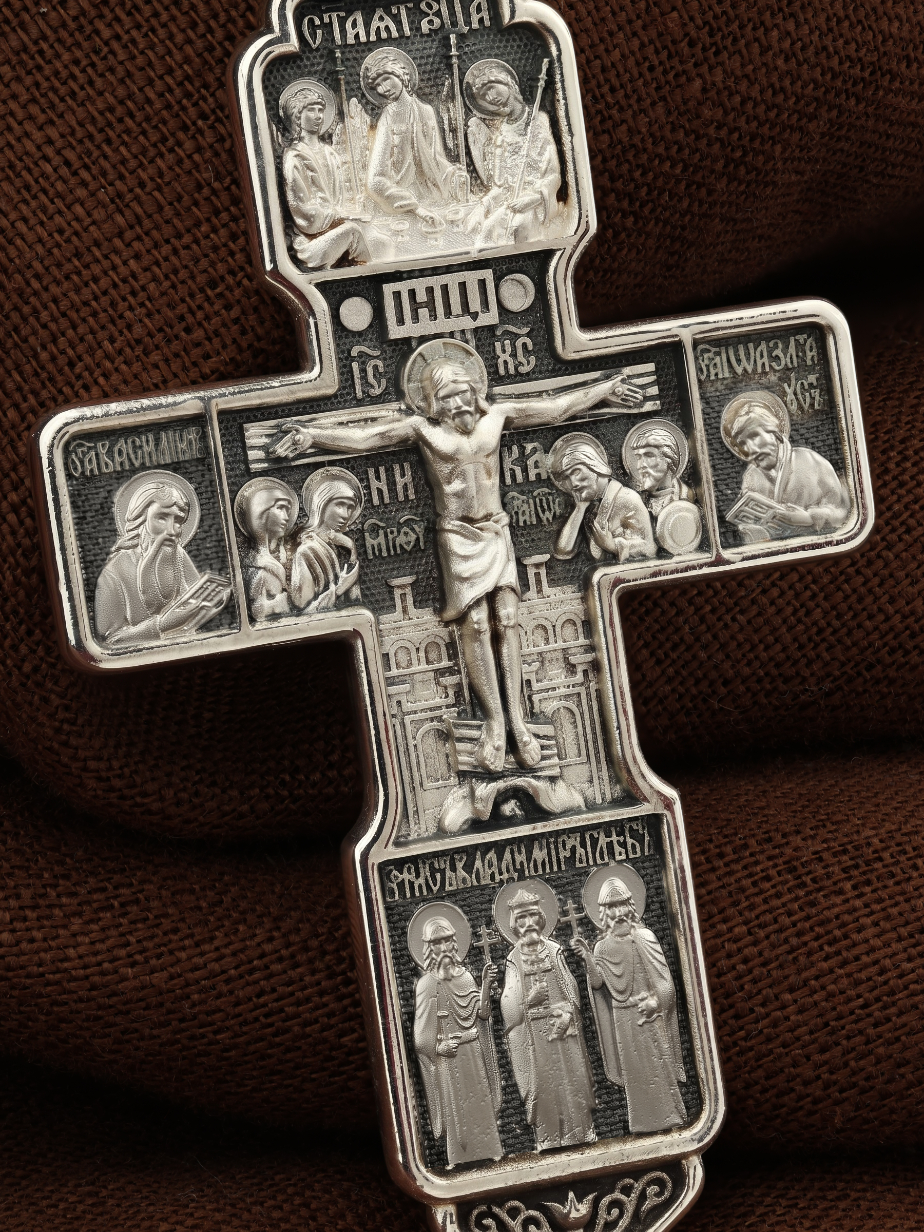 В центре лицевой стороны изображена фигура Спасителя на восьмиконечном кресте, на фоне Иерусалимской стены. Ему предстоят скорбящие Богородица, Иоанн Богослов, Мария Магдалина и сотник Лонгин. Над крестом — солнце и луна. Крест стоит на горе камней, символизирующих Голгофу, в основании которой различается череп. Это голова Адама. Распятие сопровождается каноническими надписями. Над Распятием в оглавии изображен образ Пресвятой Троицы. Это образ Триединого Бога явившегося в виде трех Ангелов праотцу Аврааму. Ангелы сидят за трапезным столом вокруг чаши, которая символизирует грядущую жертву Второго Лица Пресвятой Троицы, Бога Сына.