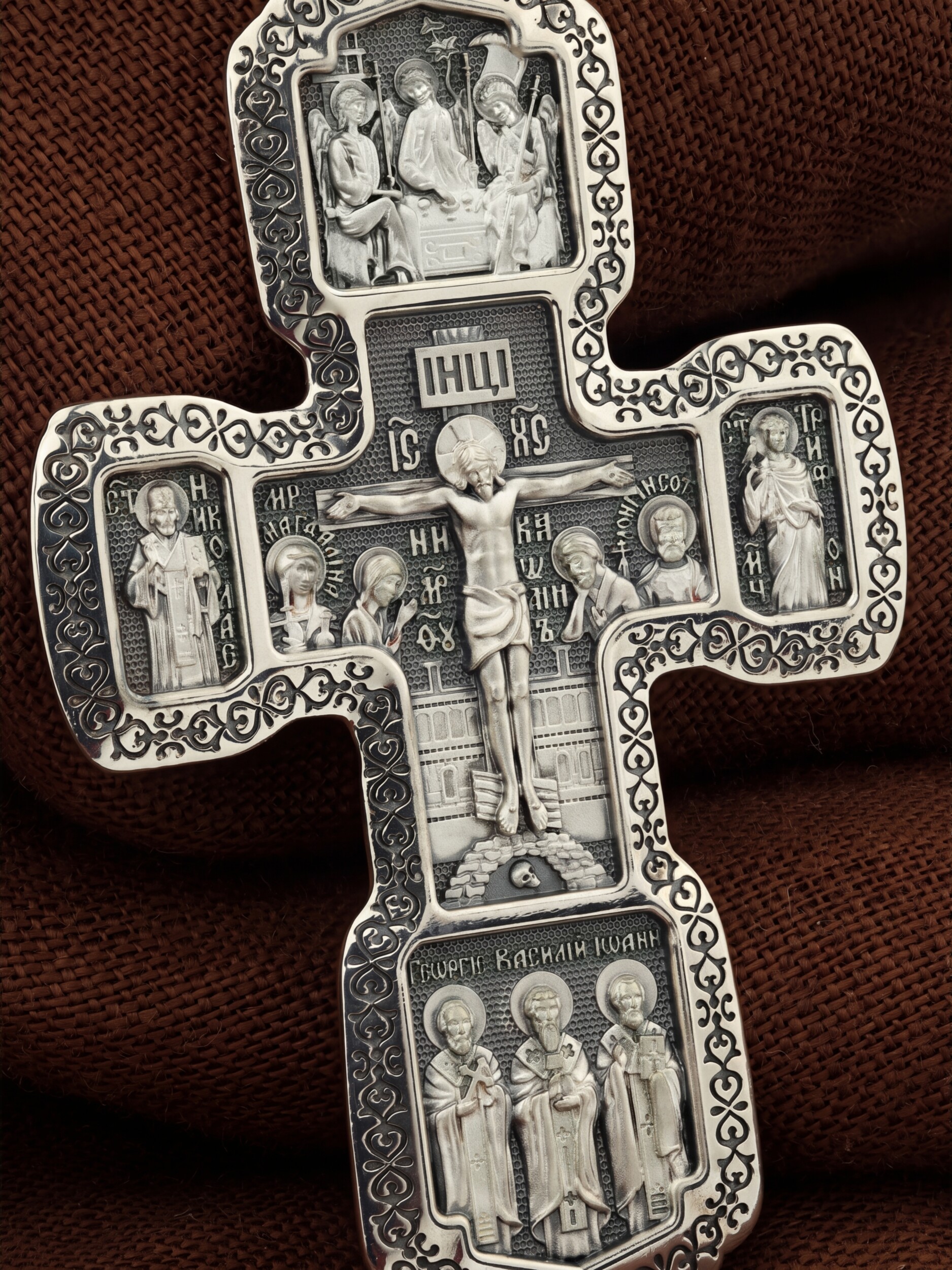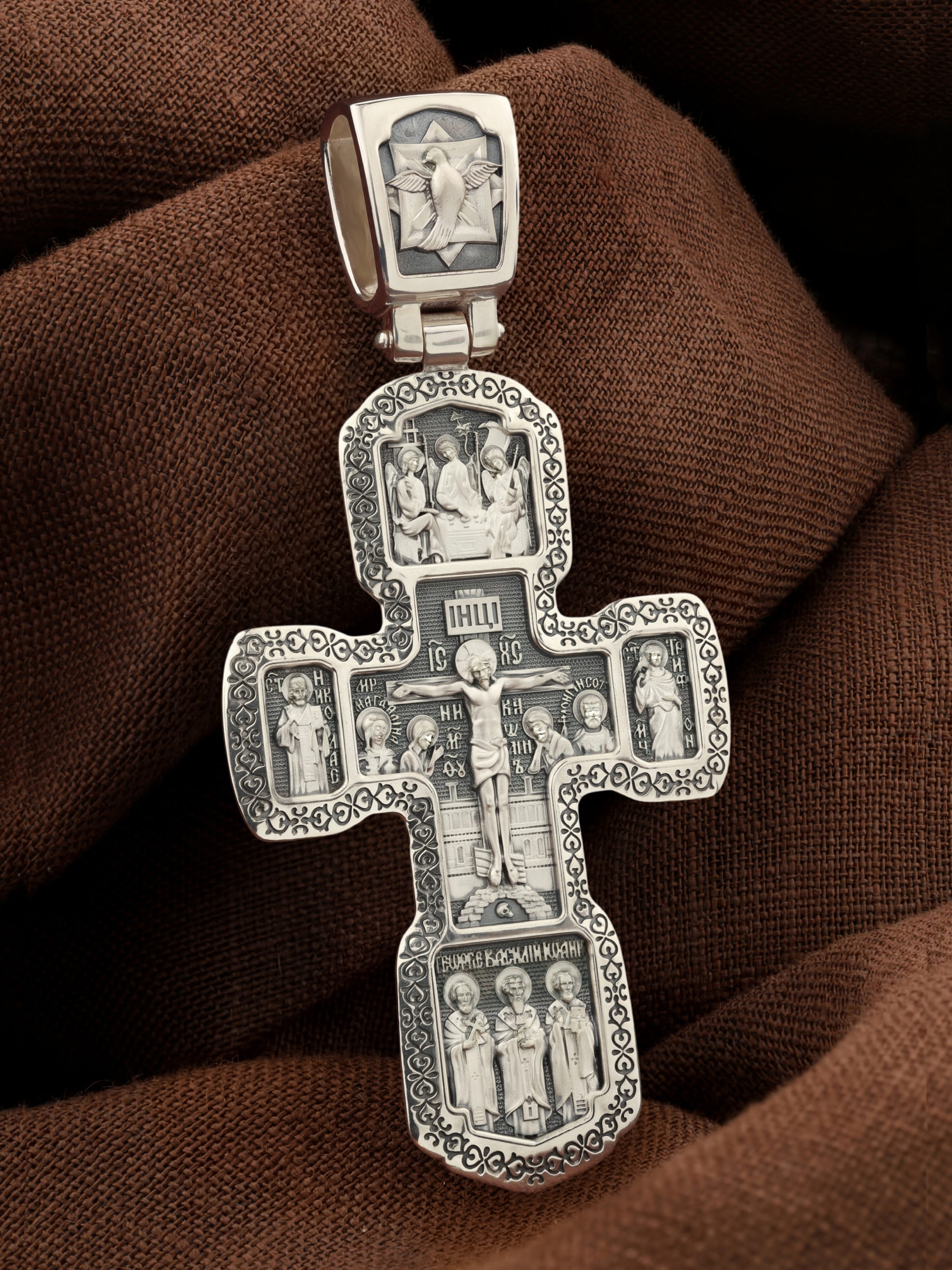 Центральную часть лицевой стороны занимает Распятие Господа Иисуса Христа с предстоящими Ему святыми, которые, по преданию, находились у Креста Господа во время Его казни. Слева — Пресвятая Богородица и жены-мироносицы — равноапостольная Мария Магдалина и святая Мария Клеопова, справа — праведный Иосиф Аримофейский и мученик Лонгин Сотник. Над Распятием помещена икона Святой Троицы. Ангелы сидят за трапезным столом вокруг чаши, которая символизирует грядущую жертву Второго Лица Пресвятой Троицы, Бога Сына. Слева от Господа находится святой Николая Чудотворец, справа — святой мученик.