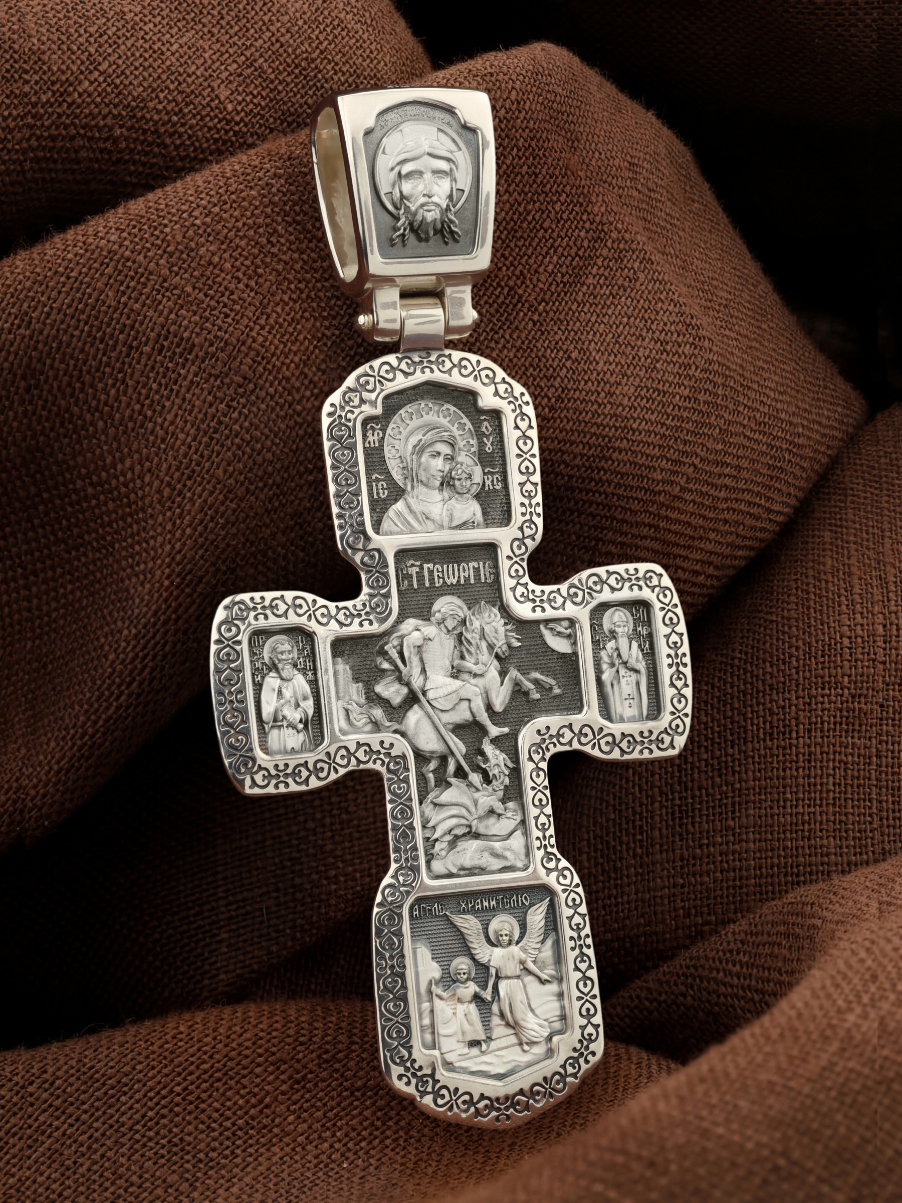 В центральной части оборота креста изображен Георгий Победоносец — покровителем и защитником воинов.