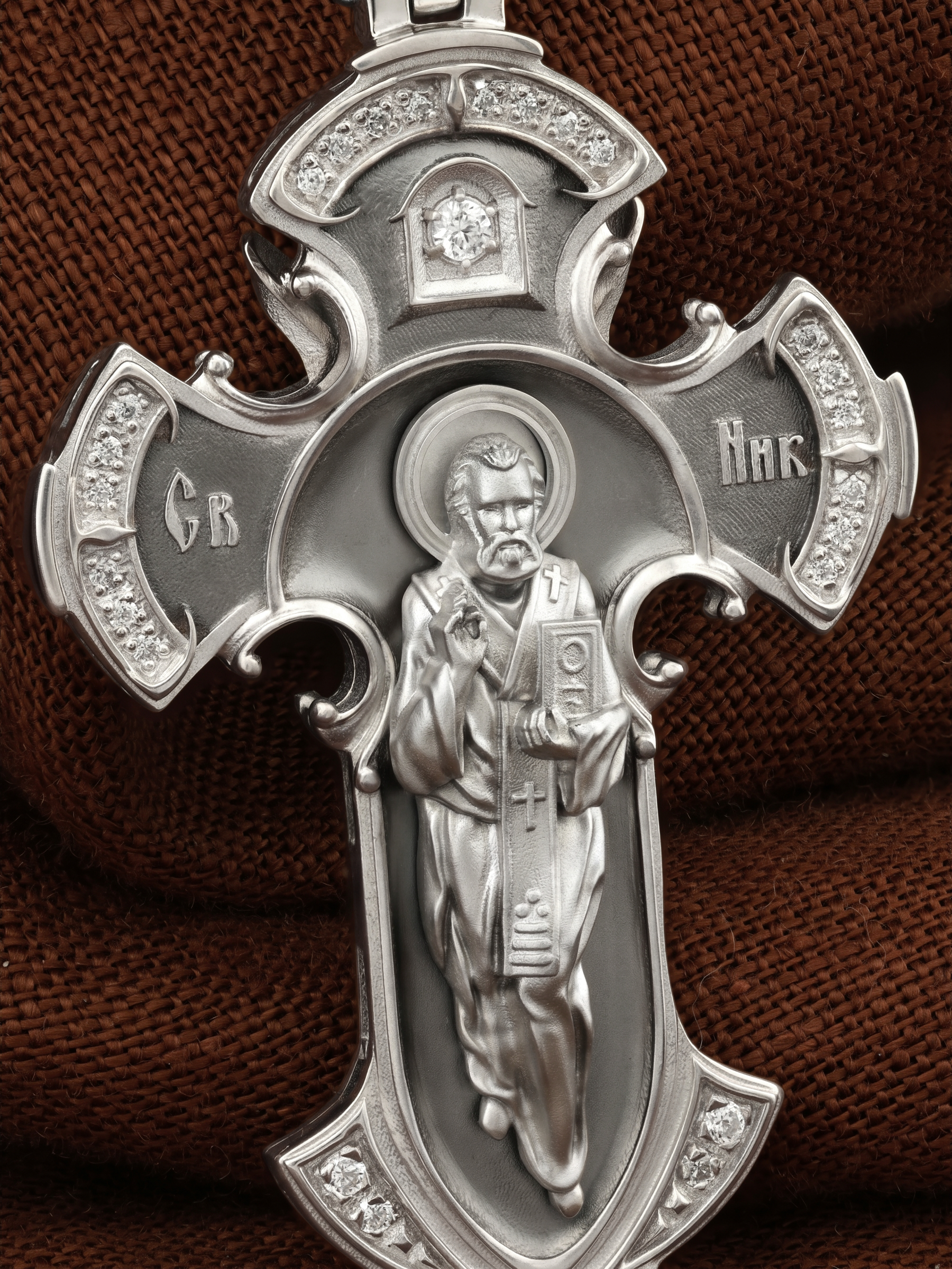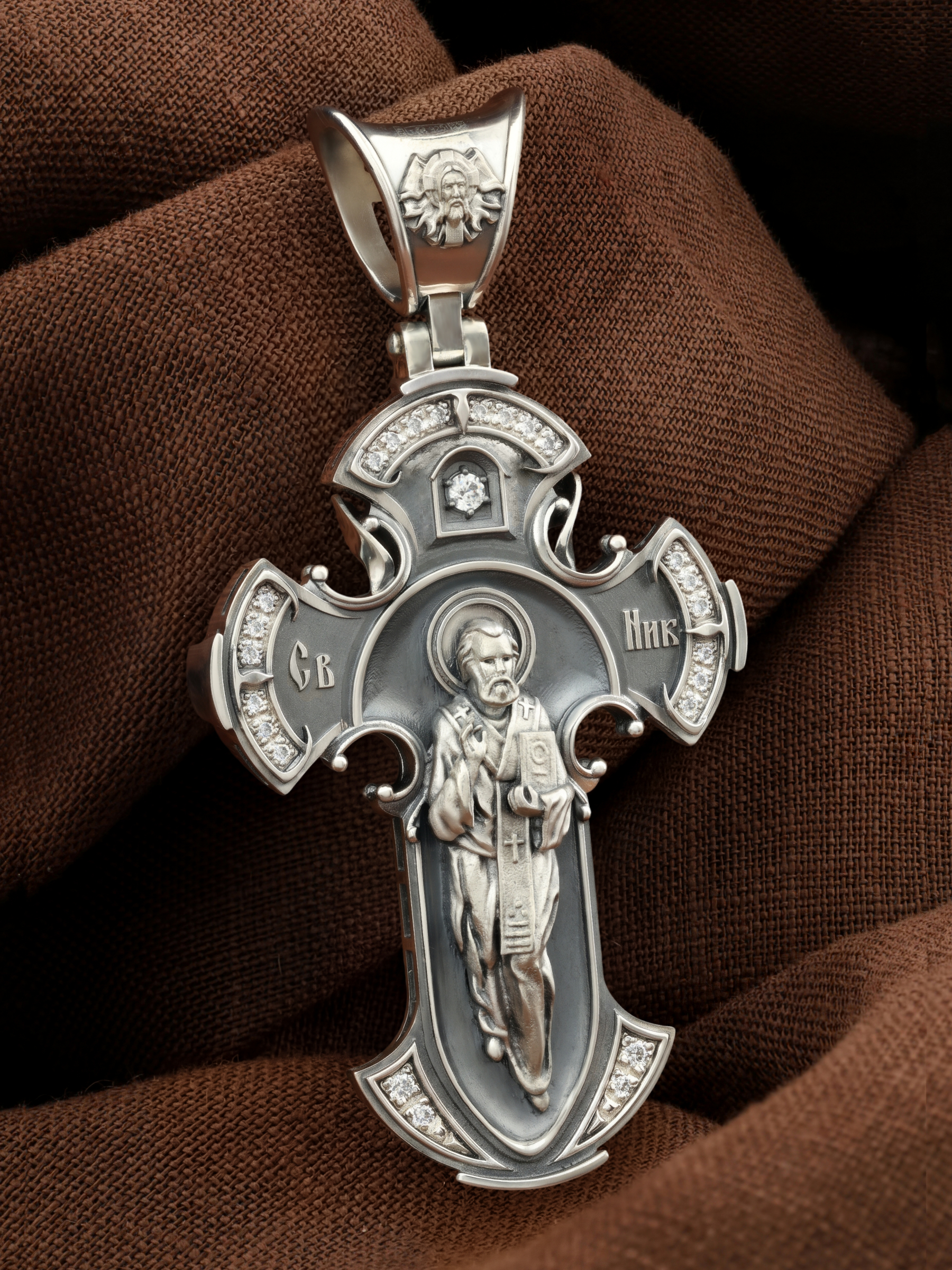 Оборотную сторону креста возглавляет икона святителя Николая Чудотворца. На кулонном кольце помещено изображение Спаса Нерукотворного — образ Спасителя, который Он запечатлел на плате и передал для исцеления больному проказой царю Эдессы. ему придается победное и защитное значение.