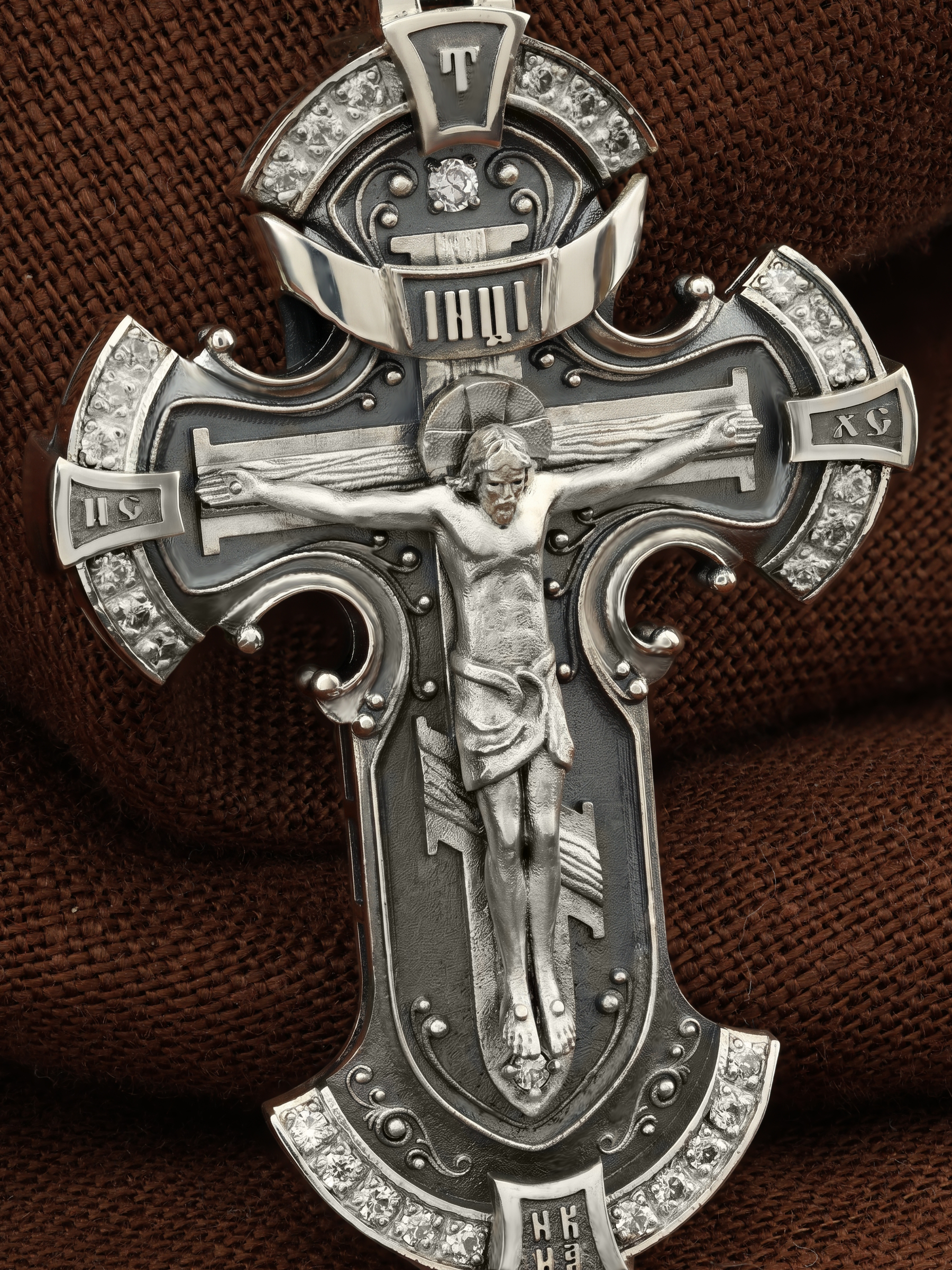 На лицевой стороне креста изображено Распятие Иисуса Христа на Голгофском Кресте, верхняя перекладина которого символизирует титло — табличку, на которой, согласно Евангелию, было начертано: Иисус Назорей Царь Иудейский (IНЦI). Справа и слева от Распятия изображены символы «IС ХС» — святое имя Христа. Внизу креста написано слово «НИКА», что значит «победитель». В верхней части креста обозначена буква «Т», которая символизирует одно из орудий страданий Господа — трость.