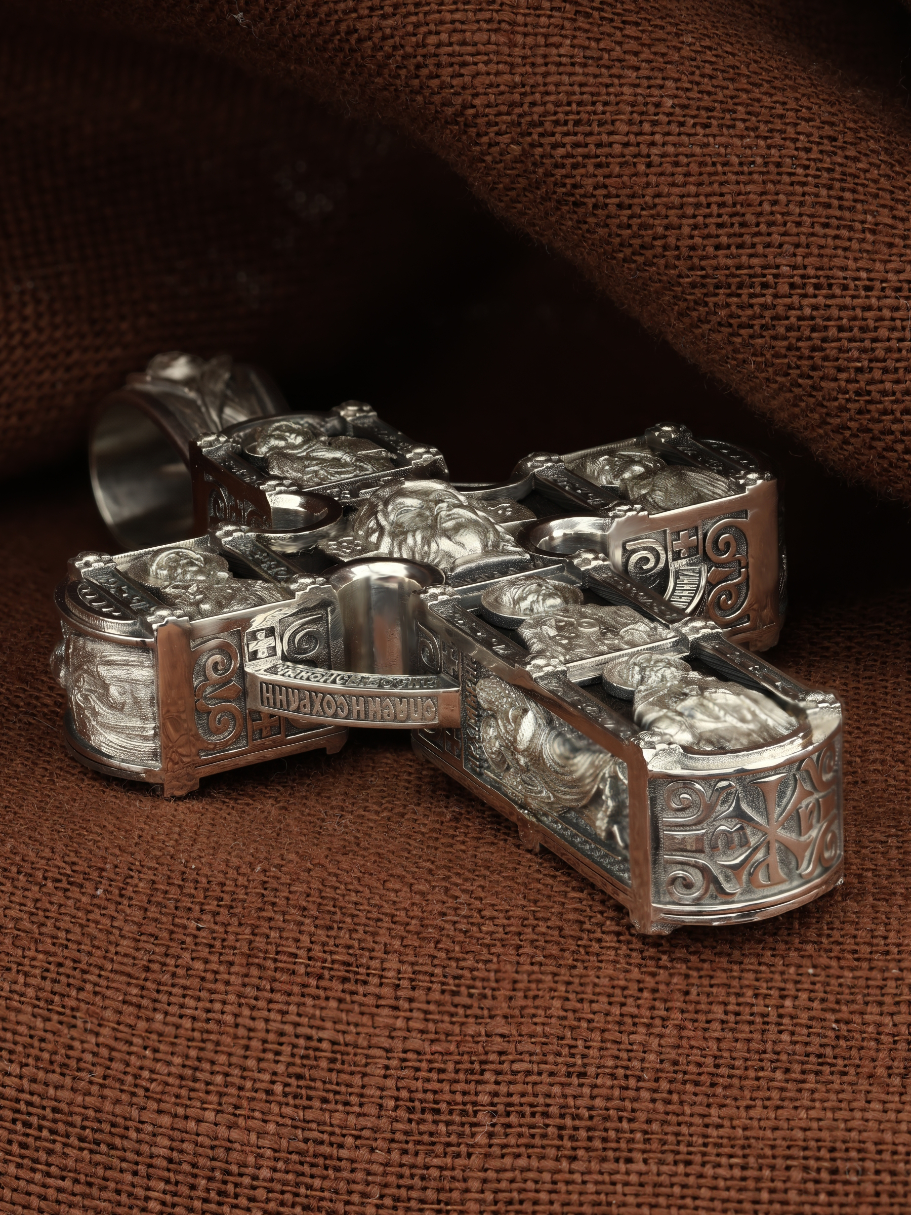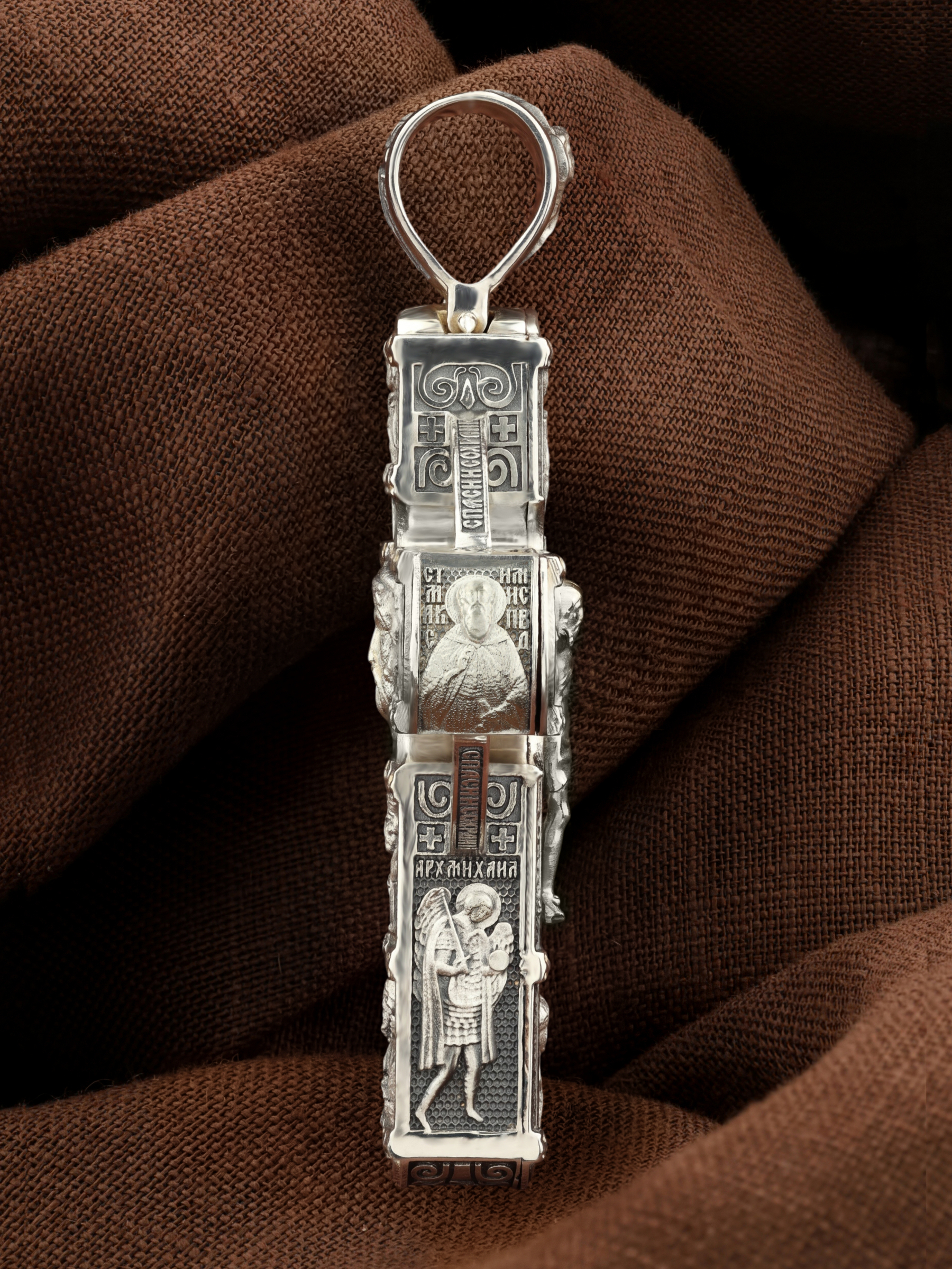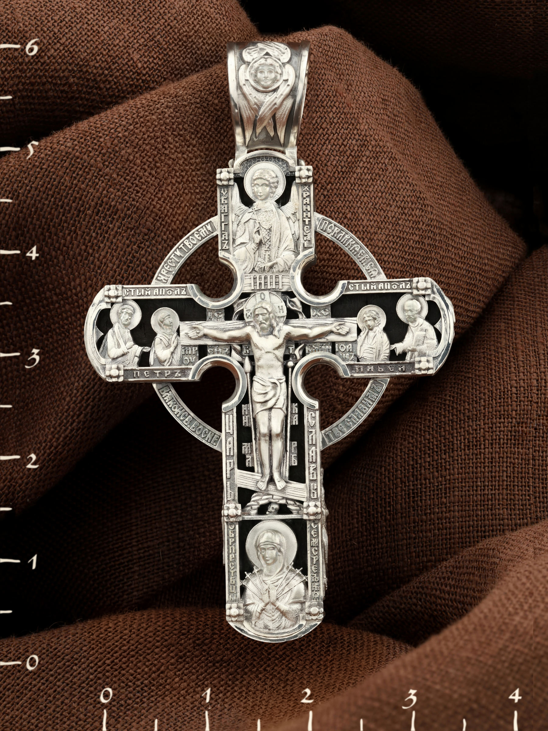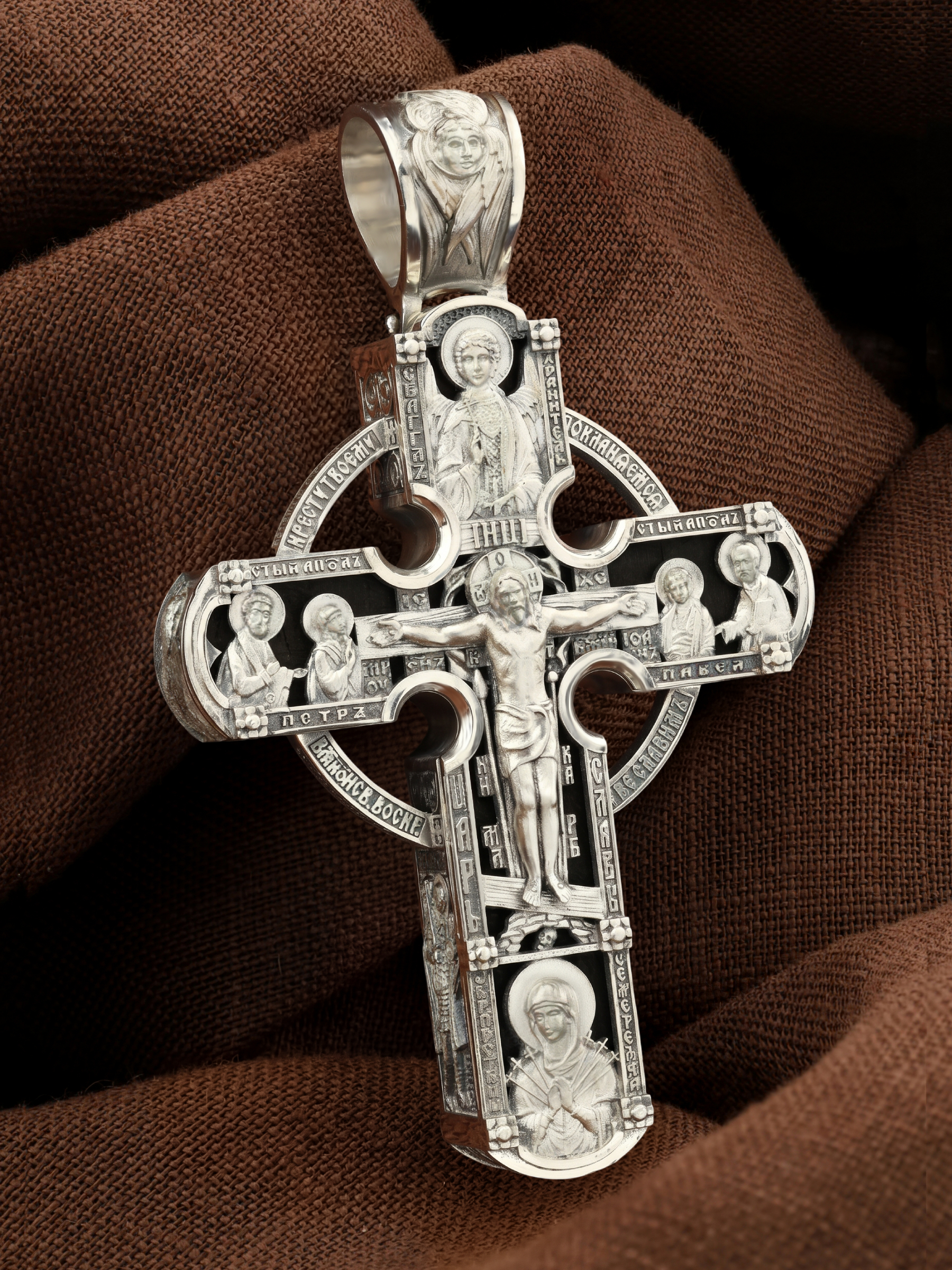 Крест объединяет в одной фигуре два христианских символа — круг-нимб и крест. На лицевой стороне креста изображено Распятие Господа и Спасителя нашего Иисуса Христа. Крест — символ спасения и искупления рода человеческого, знамение победы над смертью и адом. Распятие сопровождается каноническими надписями. На верхней табличке, выше головы Иисуса, расположена надпись, составленная Понтием Пилатом — «IНЦI». Она означает «Иисус Назорей, Царь Иудейский». Надписи «IC» «ХC», что означает Иисус Христос и «Сын Божий» размещается на разных сторонах поперечной перекладины креста. Вдоль Распятия размещены надписи «Царь Славы», «НИКА» (греч. — Победитель) и «МЛРБ» — «место лобное рай бысть» означает место лобное стало раем». Крест стоит на горе камней, символизирующих Голгофу. В ее основании различается череп — это голова Адама. Вдоль креста изображены орудия Страстей Христовых: копие сотника Лонгина, которым пронзили подреберье мёртвого Иисуса, чтобы убедиться в Его смерти, и трость с губкой, с которой Иисуса напоили уксусом. Они обозначены буквами «К» и «Т». Слева от Распятия помещены лики Пречистой Богородицы и Апостола Петра, справа изображены Апостол и евангелист Иоанн Богослов и Апостол Павел. Над Распятием изображен Святой Ангел-Хранитель, ниже — икона Божией Матери «Семистрельная». По кругу размещена молитва: «Кресту Твоему поклоняемся, Владыко, и Святое Воскресение Твое славим». На кулонном кольце помещено изображение Креста «Голгофа», на котором был распят Господь и Спаситель наш Иисус Христос.