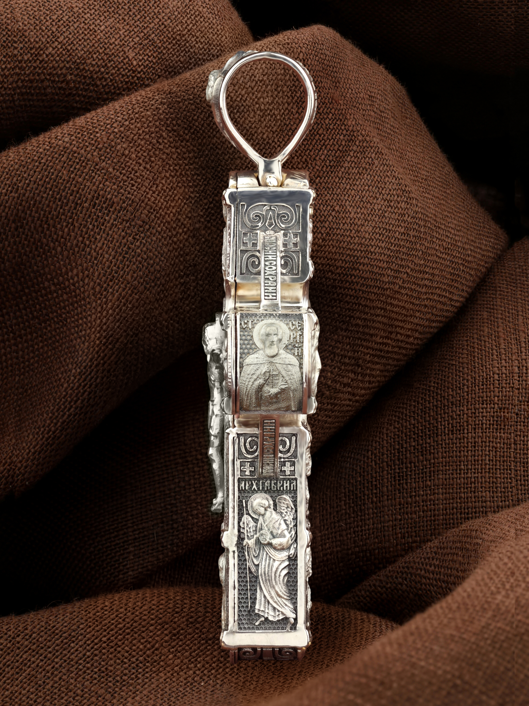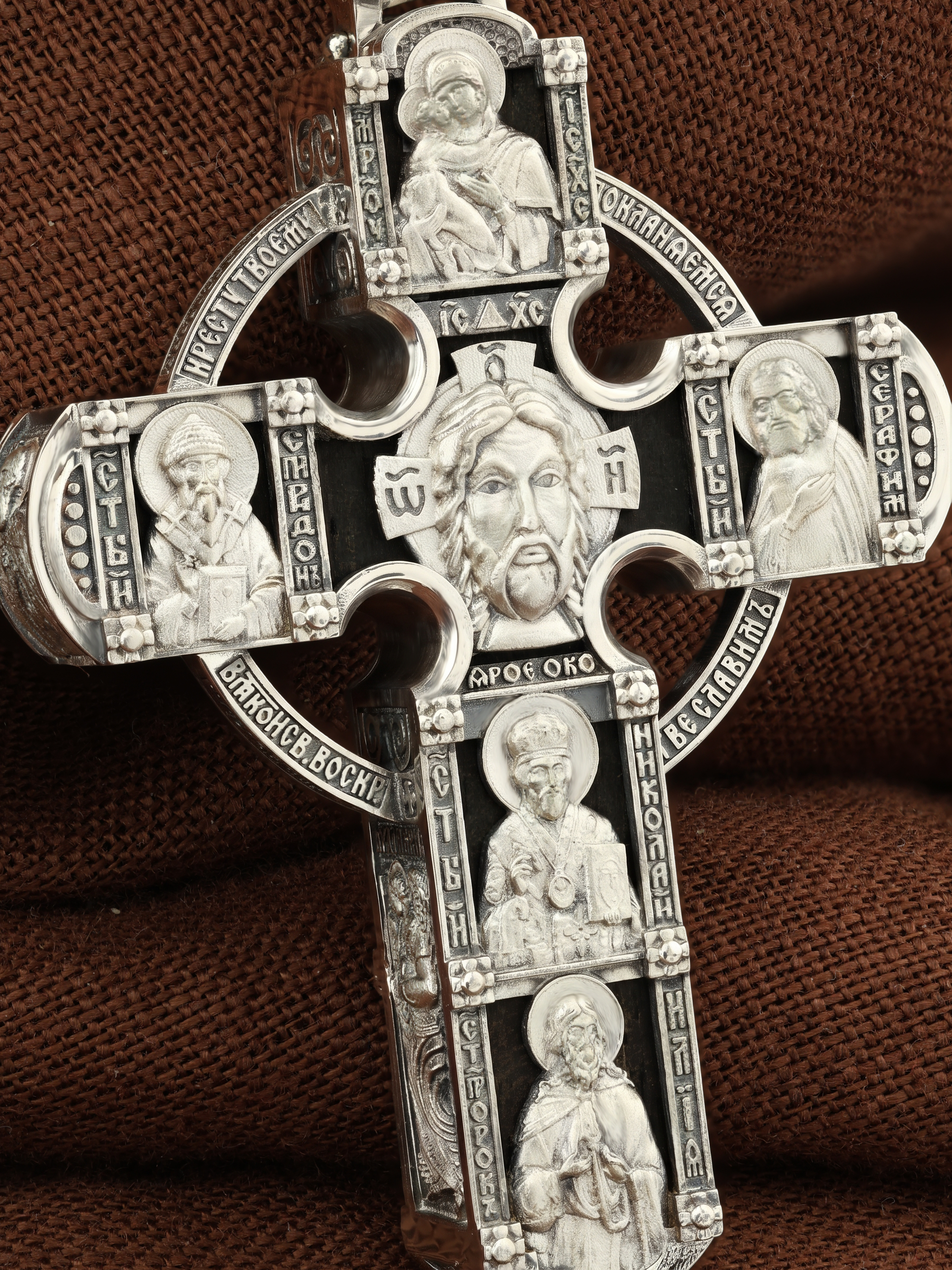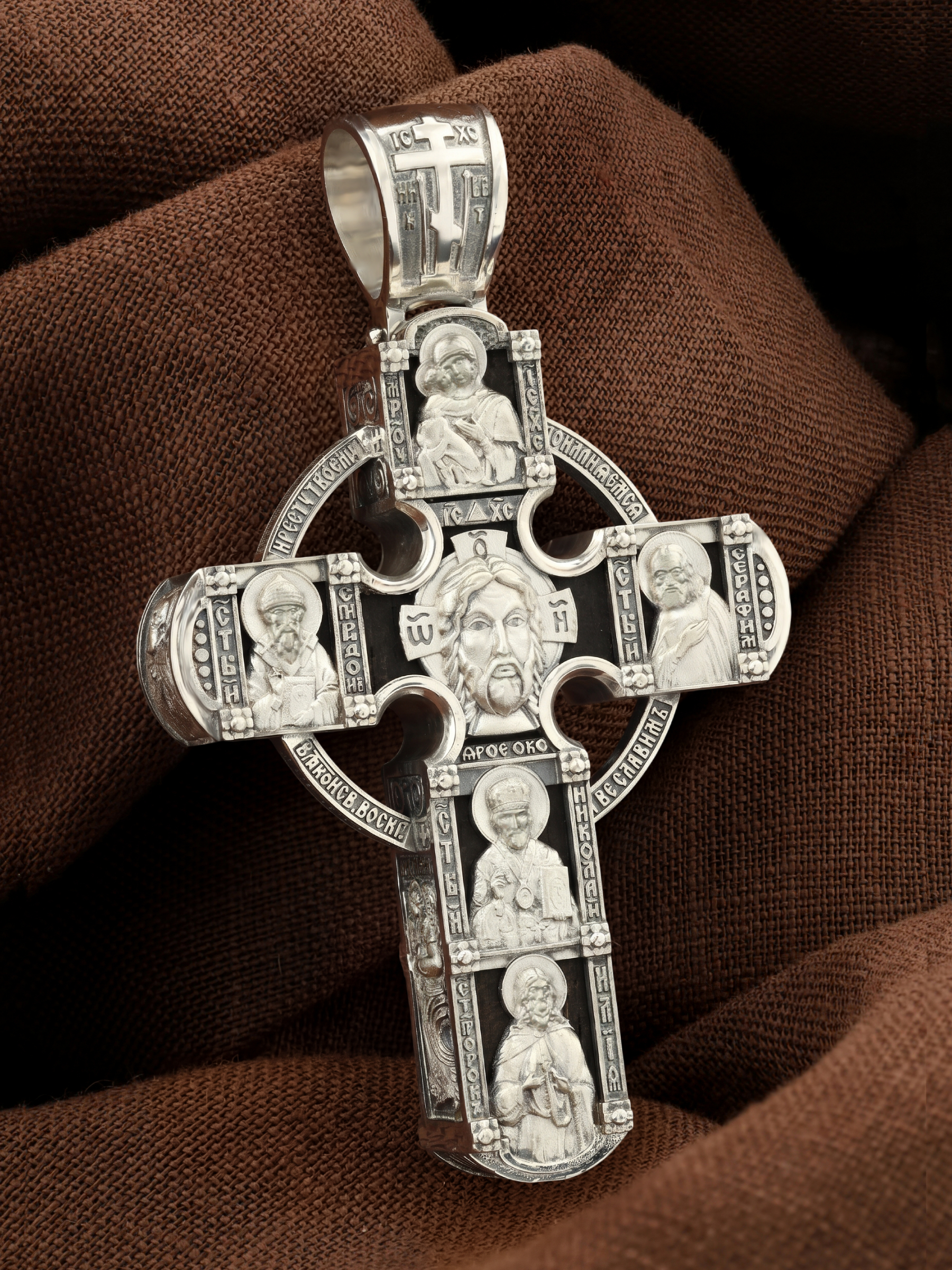 В центре оборотной стороны креста размещен образ Господа и Спасителя нашего Иисуса Христа — Господь Вседержитель или Пантократор (от греч. всевластный, всесильный). Именование Иисуса «Вседержителем» указывает, с одной стороны, на Его Божественную природу: «Аз есмь Альфа и Омега, начало и конец, говорит Господь, Который есть и был и грядет, Вседержитель» (Откр. 1: 8). С другой стороны, такое именование связано и с человеческой природой Христа, искупившего крестной жертвой людские грехи и обновившего тем самым человеческую природу. Над образом изображена икона Божией Матери «Владимирская», ниже — образы святителя Николая Чудотвореца, архиепископа Мир Ликийских и пророка Ильи. Слева изображен святитель Спиридон Тримифунтский, справа — преподобный Серафим Саровский. На кулонном кольце размещен образ шестикрылого Серафима.
