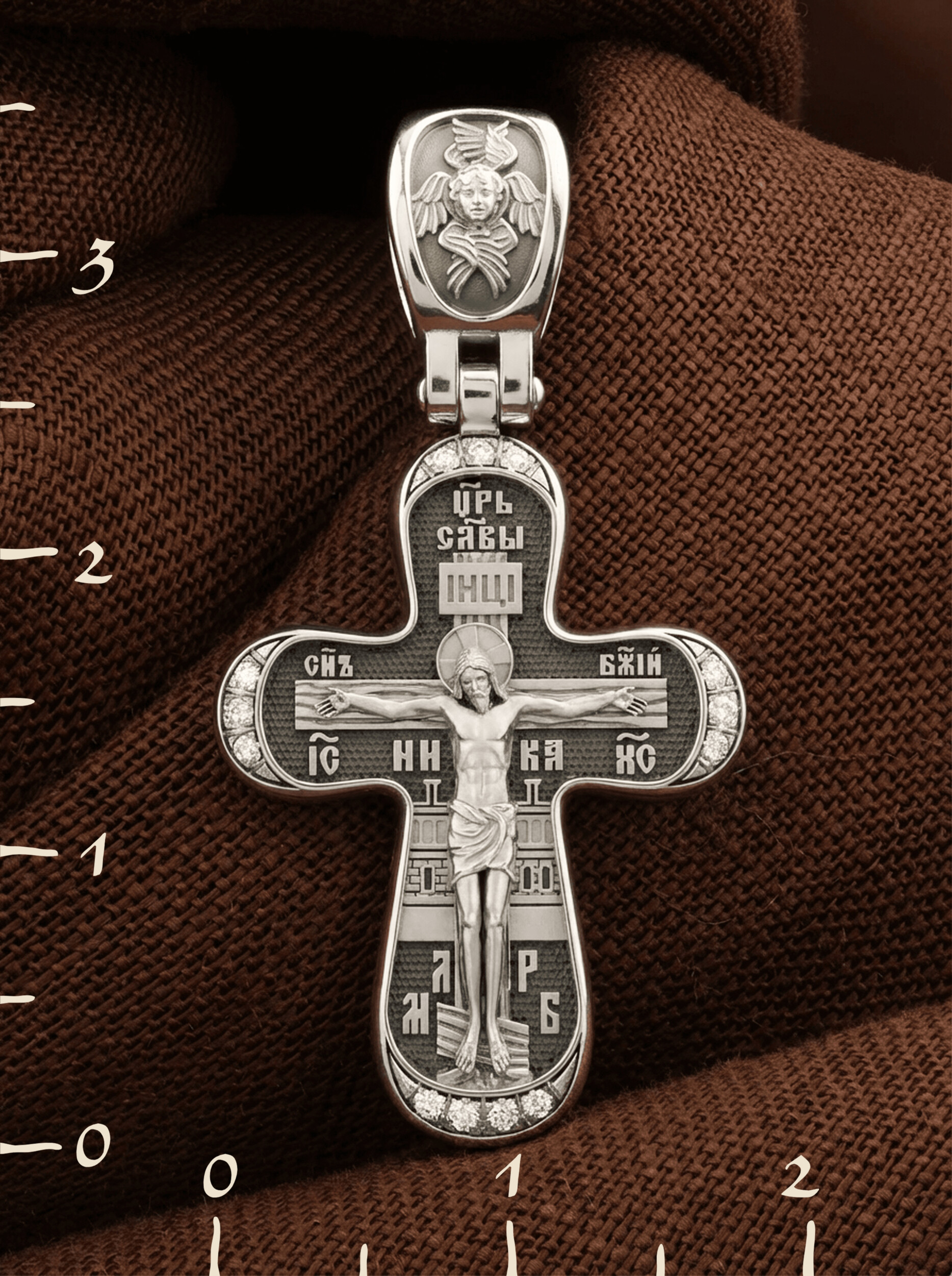 На лицевой стороне креста изображено Распятие Иисуса Христа. Господь представлен свободно покоящимся на кресте с простертыми руками и как бы обнимающим всю Вселенную. Он — Спаситель, искупивший грехи мира, «поправший смертию смерть» и призывающий к Себе «все концы земли». Поэтому рядом с Его образом помещены слова «Царь Славы». Эти слова характеризуют Господа как Великого Архиерея, победителя смерти. Верхняя перекладина символизирует титло — табличку, на которой, согласно Евангелию, было начертано: Иисус Назорей Царь Иудейский (IНЦI). Также Распятие сопровождается надписями, олицетворяющими Христа. Это святое имя Христа «IC» (Иисус) «ХС» (Христос), и словосочетание «Сын Божий». Крест стоит на горе камней, символизирующих Голгофу, в основании которой различается череп. Это голова Адама. На кулонном кольце помещено изображение серафима.