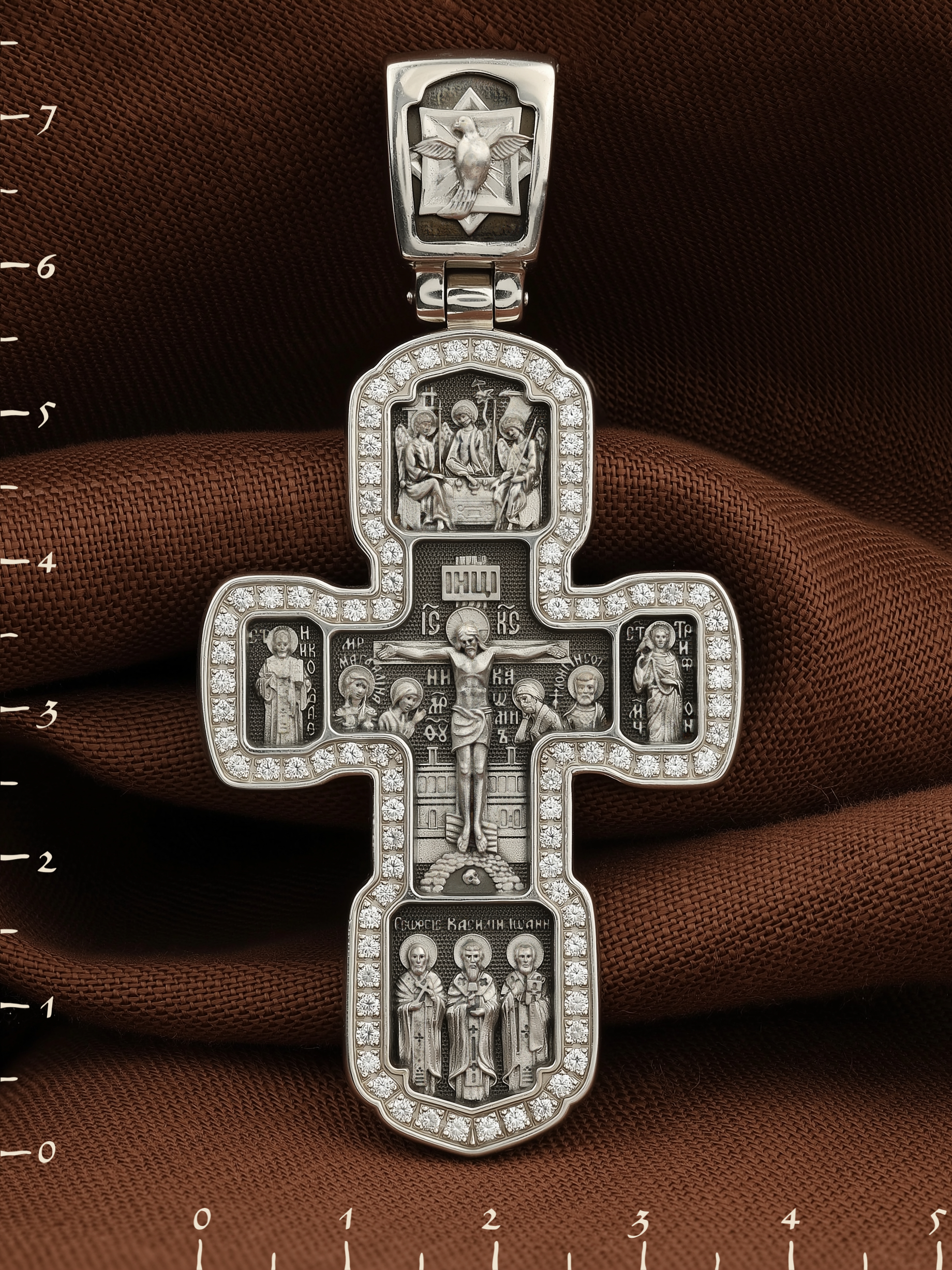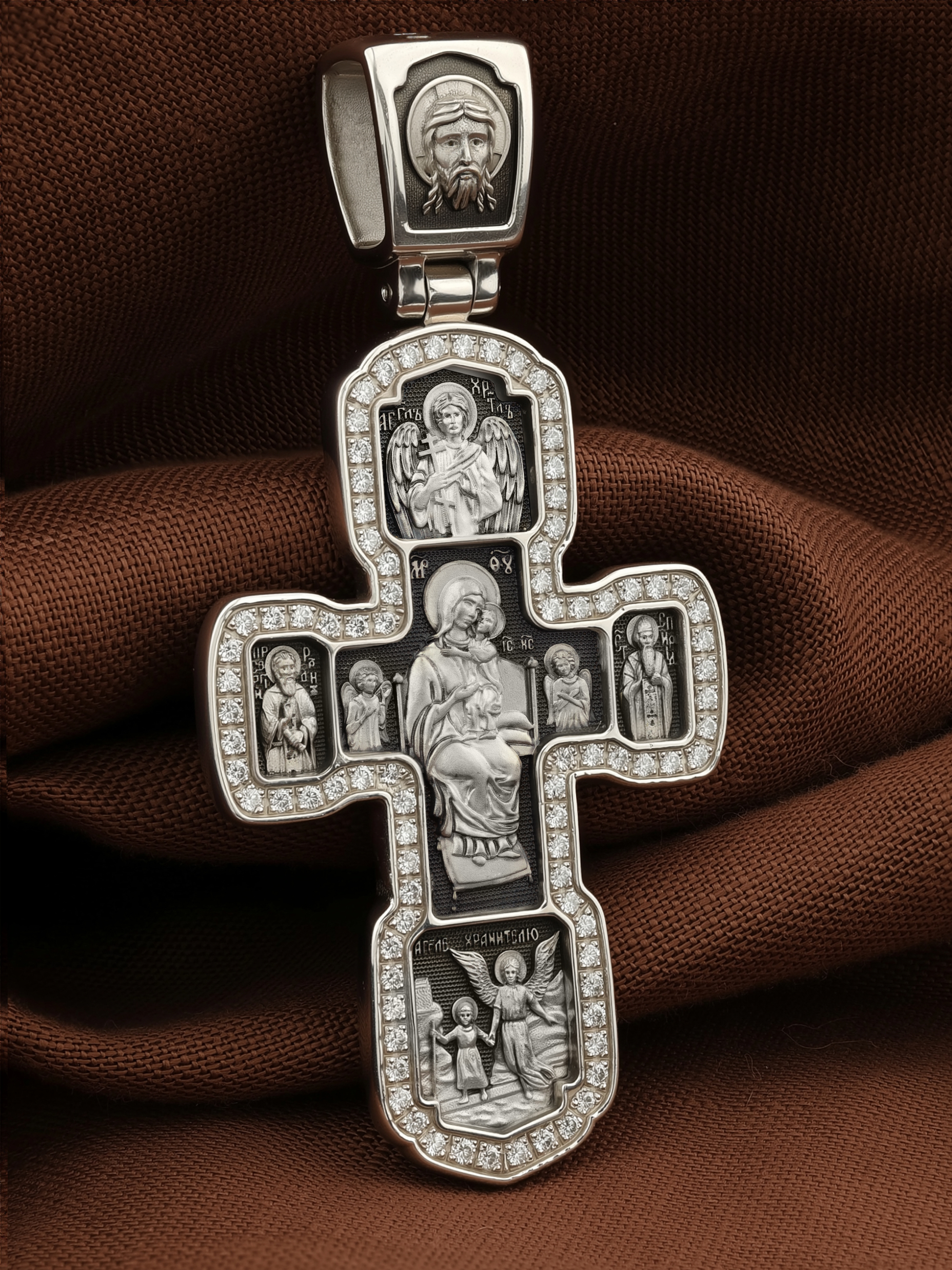 В центральной части оборота креста изображена «Владимирская икона Божией Матери». По преданию, она была написана на доске трапезного стола из дома Иисуса Христа. На Русь икона была привезена в начале XII века и с тех пор почитается как главная святыня нашего Отечества. По бокам изображены прп. Сергий Радонежский и святитель Спиридон Тримифунтский. Сверху и снизу иконы помещены изображения Ангела-Хранителя.