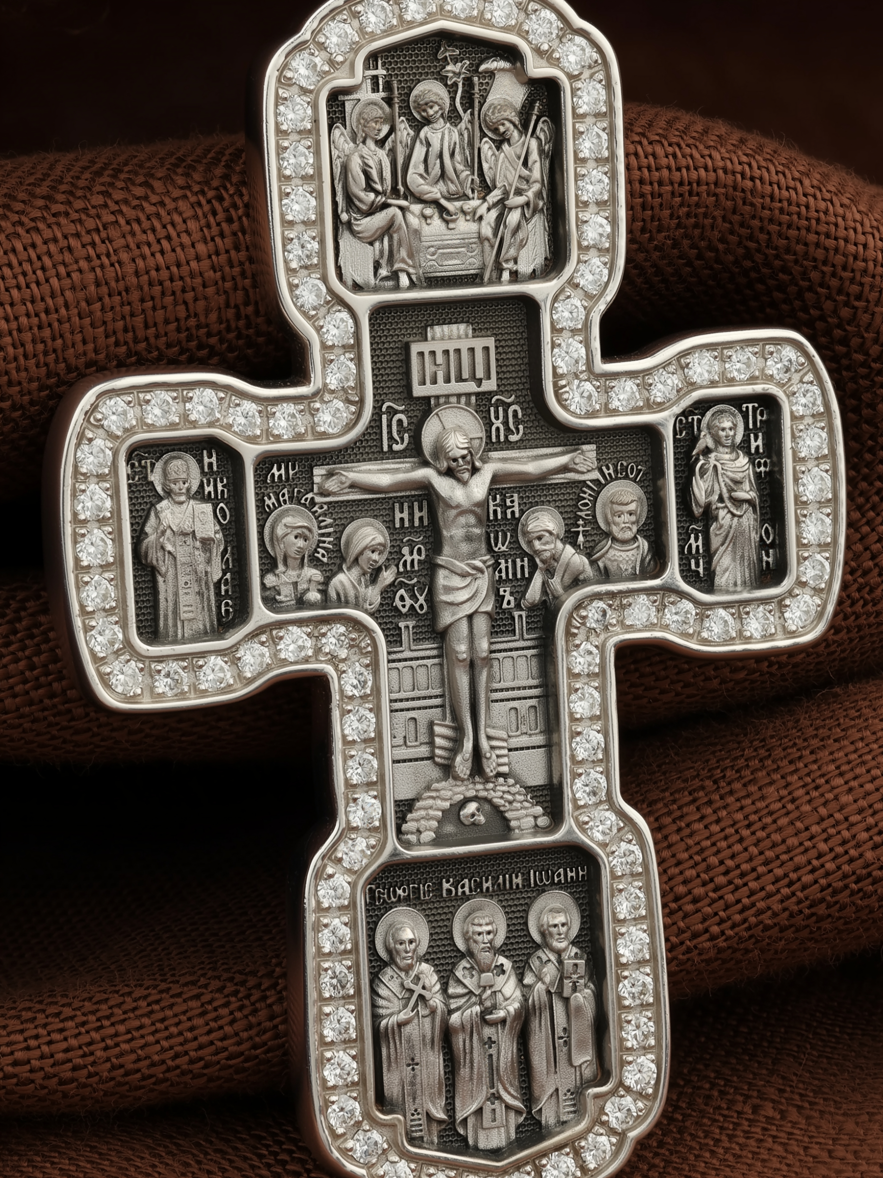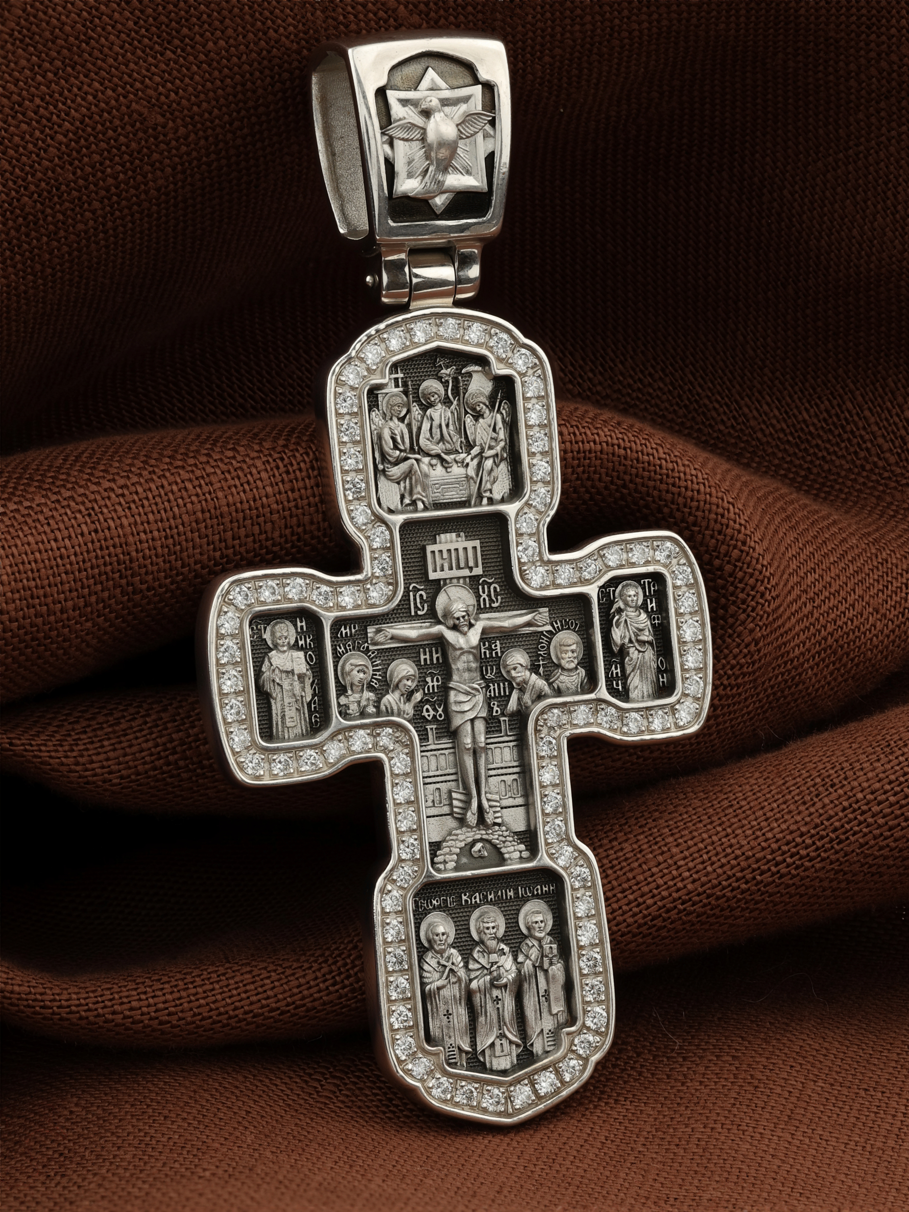 Центральную часть лицевой стороны занимает Распятие Господа Иисуса Христа с предстоящими Ему святыми, которые, по преданию, находились у Креста Господа во время Его казни. Слева — Пресвятая Богородица и жены-мироносицы — равноапостольная Мария Магдалина и святая Мария Клеопова, справа — прав. Иосиф Аримофейский и мч. Лонгин Сотник. Над Распятием помещена икона Святой Троицы. Ангелы сидят за трапезным столом вокруг чаши, которая символизирует грядущую жертву. Второго Лица Пресвятой Троицы, Бога Сына. Слева от Господа находится святой Николая Чудотворец, справа — святой мученик.