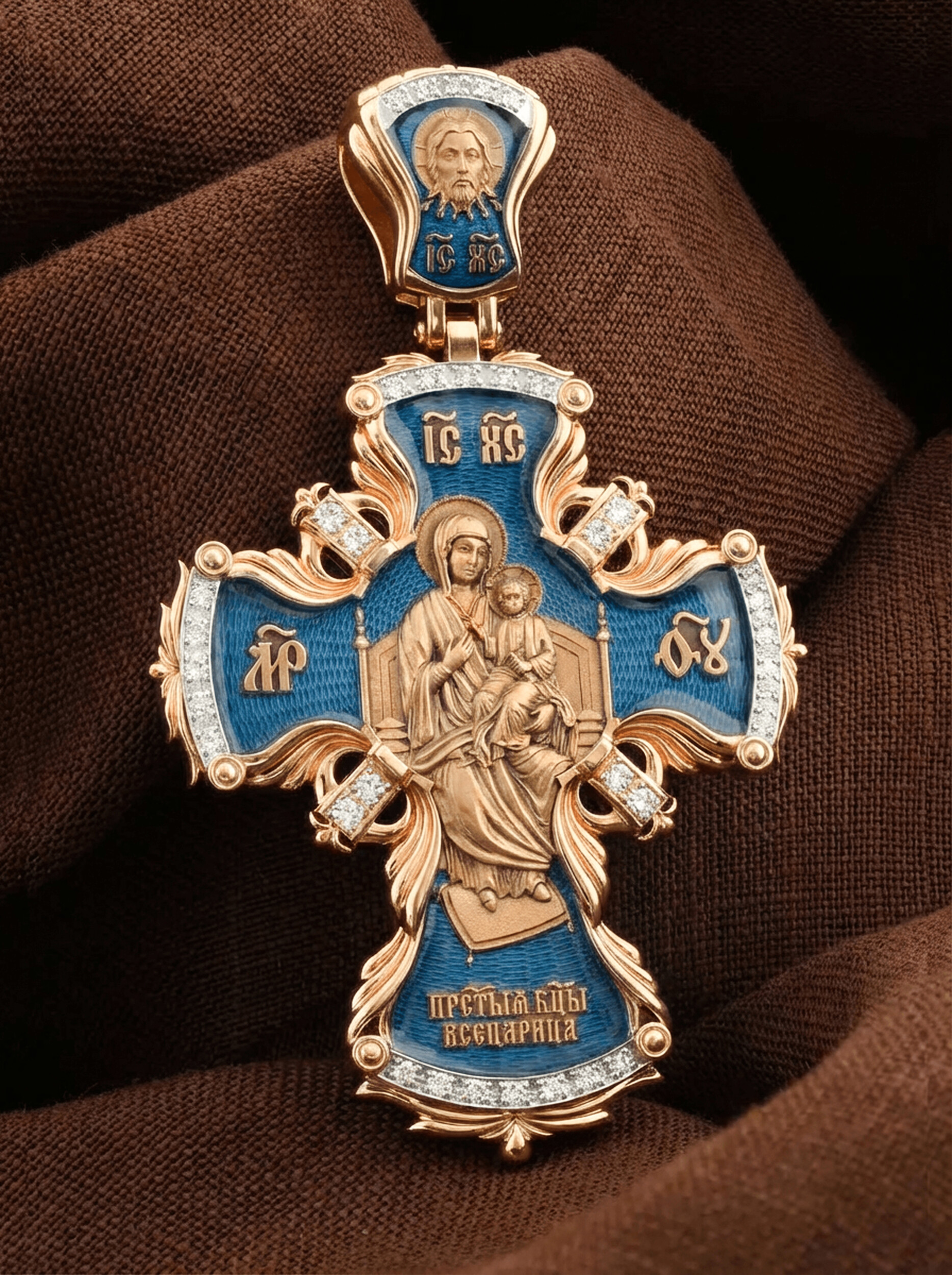 На оборотной стороне креста изображена икона Божией Матери «Всецарица», на которой Пресвятая Богородица восседает на царском троне. На руках Ее — Богомладенец Христос со свитком в левой руке и благословляющий десницей. Правой рукой Богородица указывает на Своего Царственного Сына, как на Спасителя мира. Чудотворная икона была написана в XVII веке и находится на Святой Горе Афон, в одном из древних греческих монастырей — Ватопеде. Икона совершила множество чудесных исцелений. Пречистая Богородица наставляет на праведный путь, помогает укрепить веру, найти утешение. На кулонном кольце помещено изображение Нерукотворного образа Господа и Спасителя нашего Иисуса Христа. Ему придается победное и защитное значение.