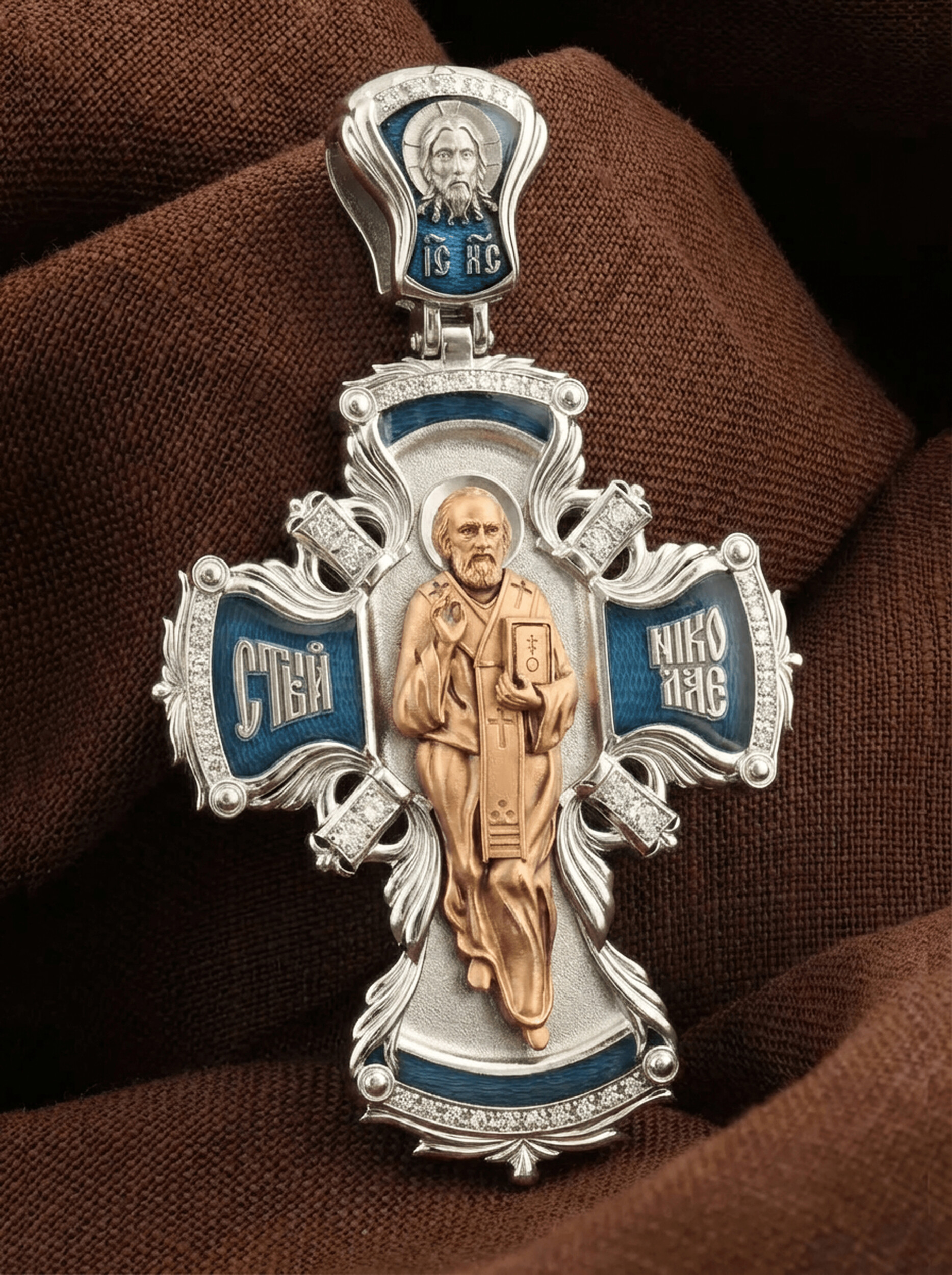 Оборотную сторону креста возглавляет икона святителя Николая Чудотворца, самого почитаемого святого не только в России, но и во всем мире. Николай Чудотворец, помощник в делах, защитник путешествующих, покровитель учащихся, утешитель обиженных и нуждающихся, целитель самых страшных и тяжелых недугов, предстатель и молитвенник за людей перед Богом. На кулонном кольце помещено изображение Спаса Нерукотворного — образ Спасителя, который Он запечатлел на плате и передал для исцеления больному проказой царю Эдессы.