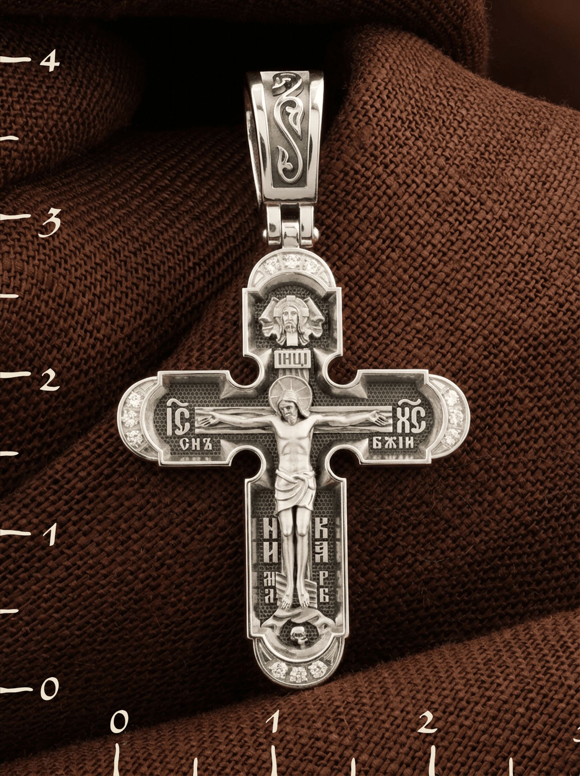 На лицевой стороне нательного креста по традиции изображено Распятие Господа нашего Иисуса Христа. Крест Господень стоит на небольшом каменистом возвышении, символизирующем гору Голгофу, которая обозначена буквами МЛРБ (Место Лобное Рай Бысть). Над головой Господа на поперечной перекладине написано «ИНЦИ», что символизирует табличку, которая была прибита к Кресту, с надписью «Иисус Назорей Царь Иудейский». Этим иудеи хотели посмеяться над Христом, не зная, что распинают истинного Царя всех царей. По сторонам основной перекладины расположены позолоченные рельефные инициалы Христа «ИС ХС». Под перекладиной, по сторонам древа, находится надпись «СЫН БОЖИЙ», а в основании креста — надпись «НИКА» (Победитель).