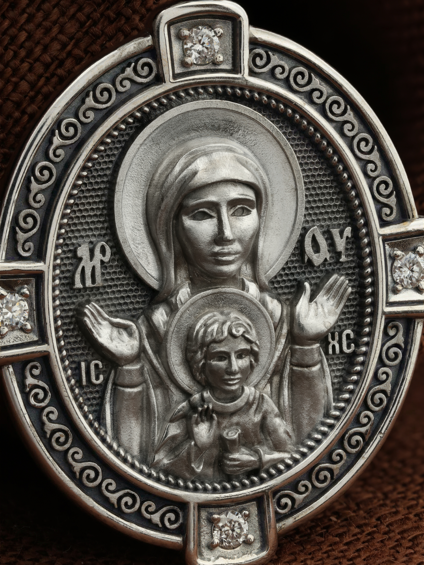 В центр образка помещен образ Божией Матери «Знамение», прославившийся многими чудесами в Новгороде в XII веке. Икона эта чтится как одна из самых великих святынь Русской земли. Молитвенно воздетые руки Богородицы означают заступничество за людей пред Богом. Рядом с Ней — благословляющий Божественный Младенец — Спас-Эммануил.