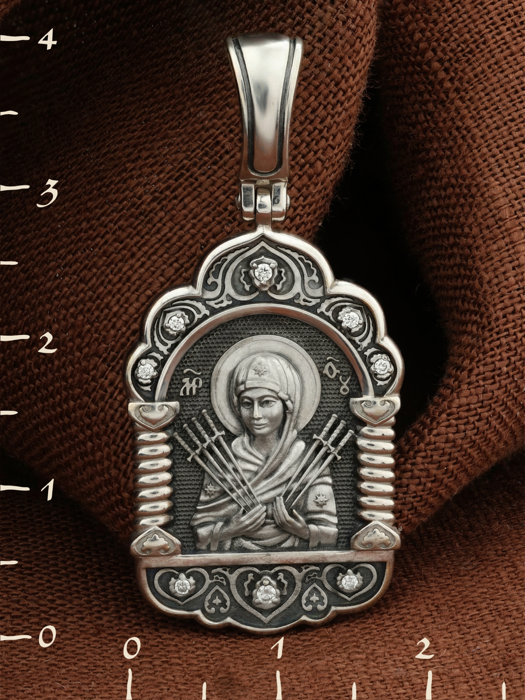 На лицевой стороне образка изображена икона Пресвятой Богородицы «Семистрельная» — одна из самых чудотворных икон на Руси. На протяжении многих веков христиане взывали к Царице Небесной через эту икону, если в стране начинались войны или мятежи.