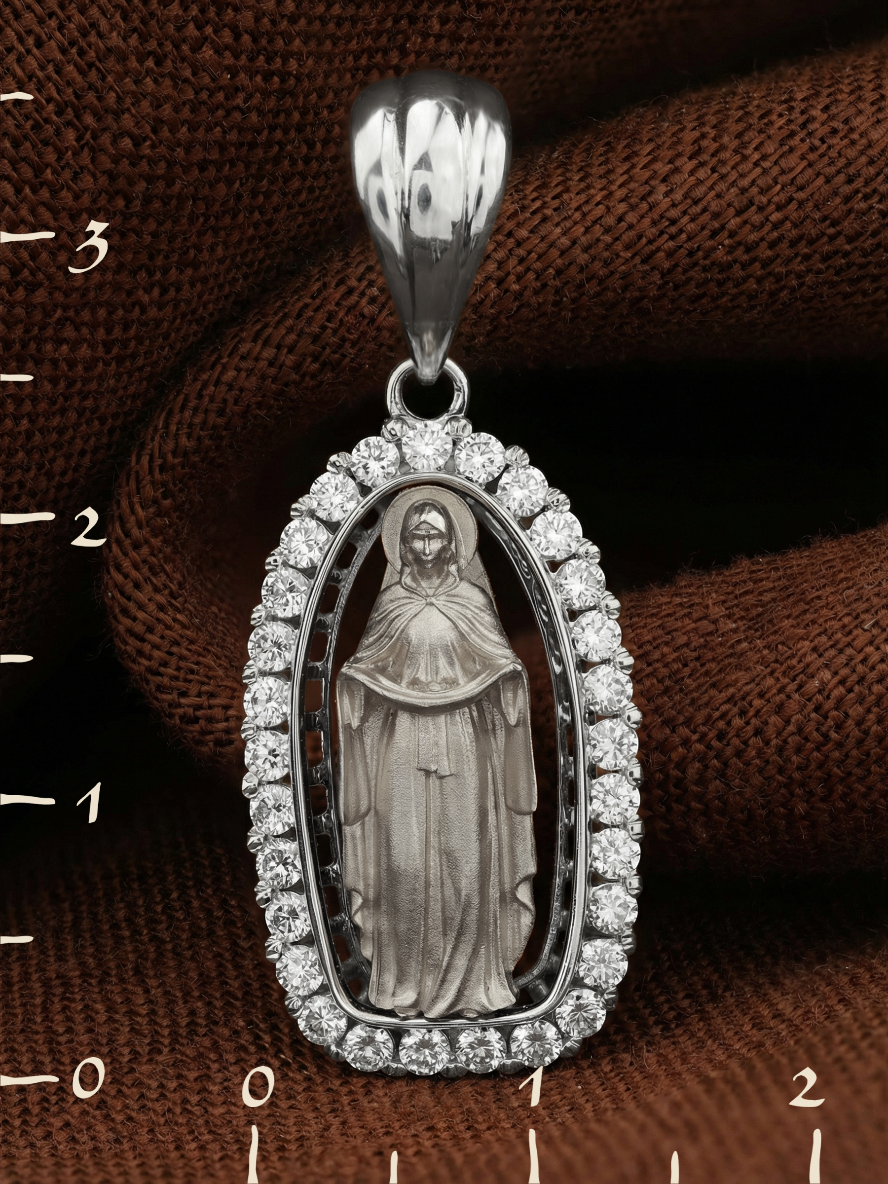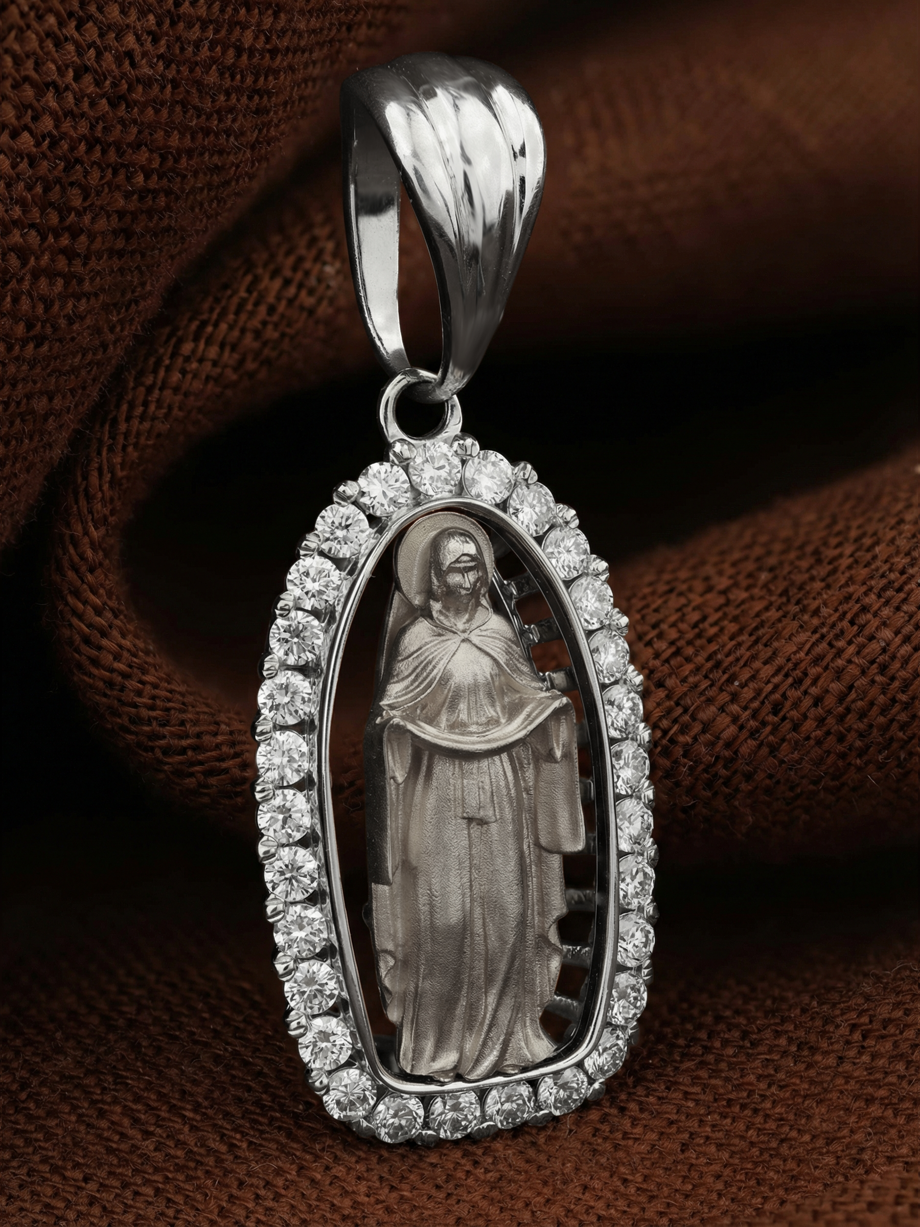 На лицевой части образка изображена икона Покров Пресвятой Богородицы. Праздник Покрова Божией Матери является воспоминанием чуда, которое произошло во Влахнернской церкви 1 (14) октября 910 года: Пресвятая Богородица явилась верующим над алтарем храма и распростерла над ними Свое покрывало. В этот день Божья Матерь открыла людям, что Она является Ходатаицей за них перед Богом. Богородица простирает Свой молитвенный покров над всеми православными христианами и умоляет Сына Своего о даровании вечного спасения каждому человеку.