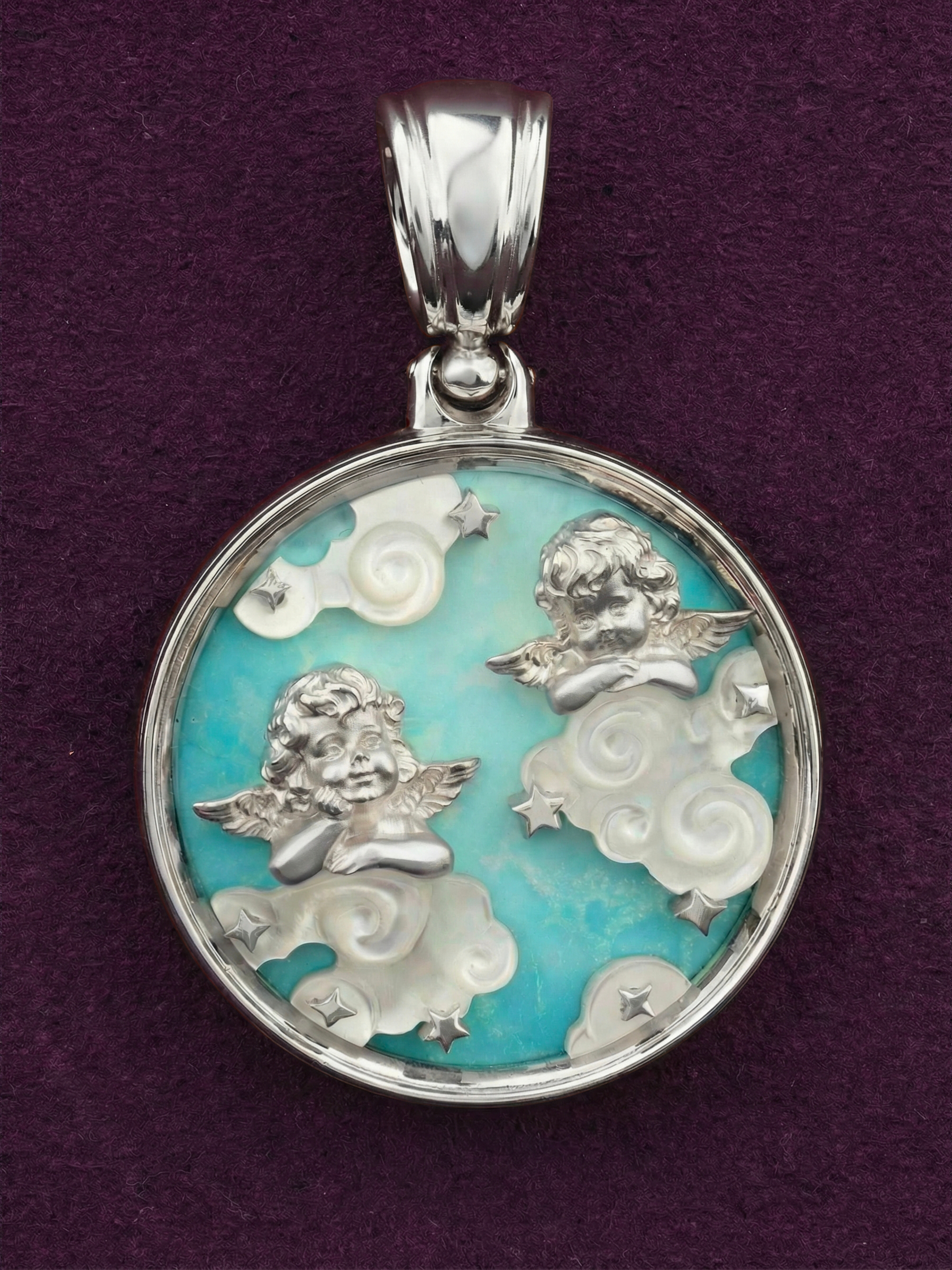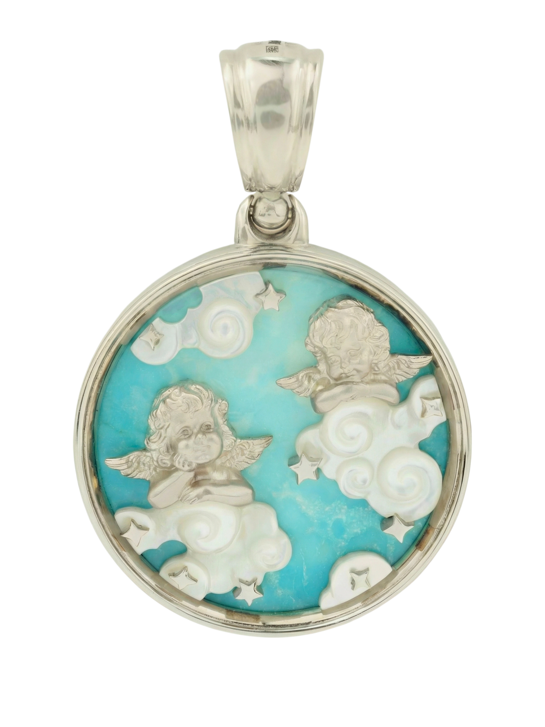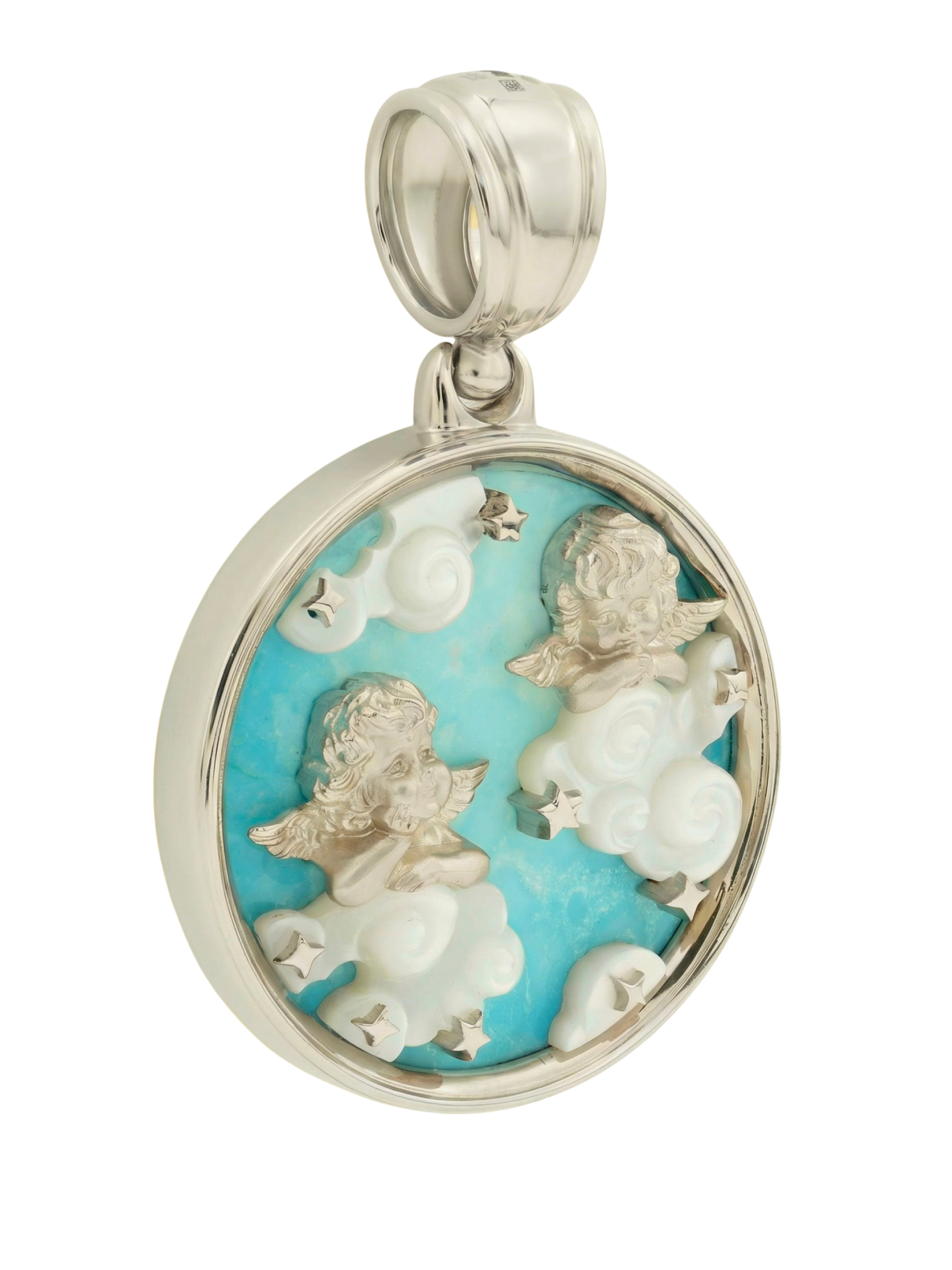 Центральным элементом композиции является круглая вставка из натуральной бирюзы, на фоне которой эффектно смотрятся детали из перламутра. Резные облака из перламутра придают подвеске объем и живость, подчеркивая высокое качество исполнения. Это универсальное украшение подойдет как для женщин, так и для мужчин, ценящих оригинальные аксессуары с глубоким смыслом. Подвеска с купидонами — это не просто драгоценность, а часть истории, которую можно дополнить другими изделиями из нашего каталога, собрав изысканный комплект.