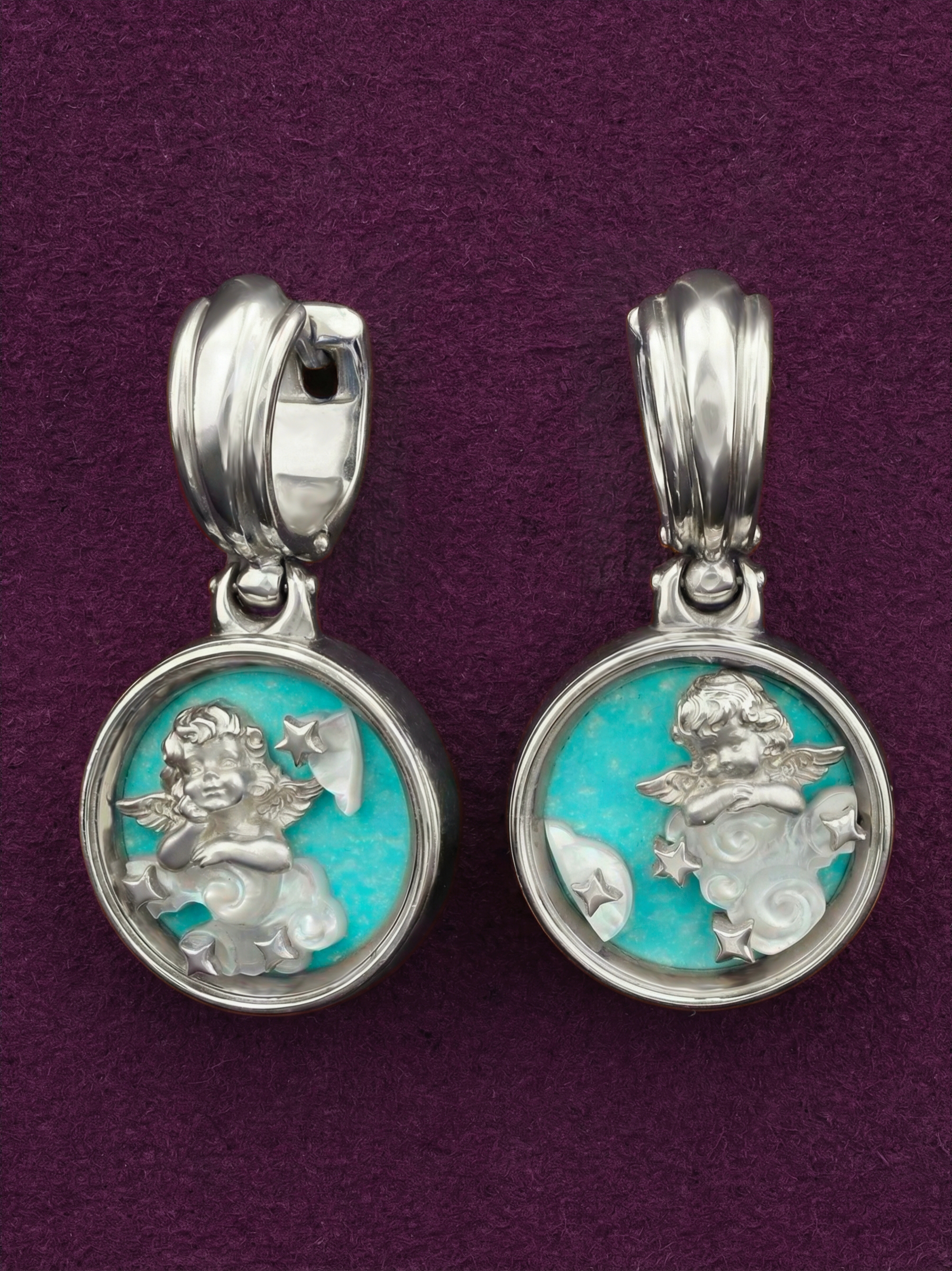 Элегантные и выразительные серьги из белого золота 585 пробы из коллекции De luxe Premium — Амуры станут символом нежности и высокого стиля. Дизайн украшения, вдохновленный классическими образами купидонов, придает изделию особое очарование и философский подтекст. Ювелиры воплотили в жизнь изящную миниатюру: фигурки амуров в окружении небесных звезд выполнены в металле и дополнены перламутровыми деталями, создавая эффектный рельеф.