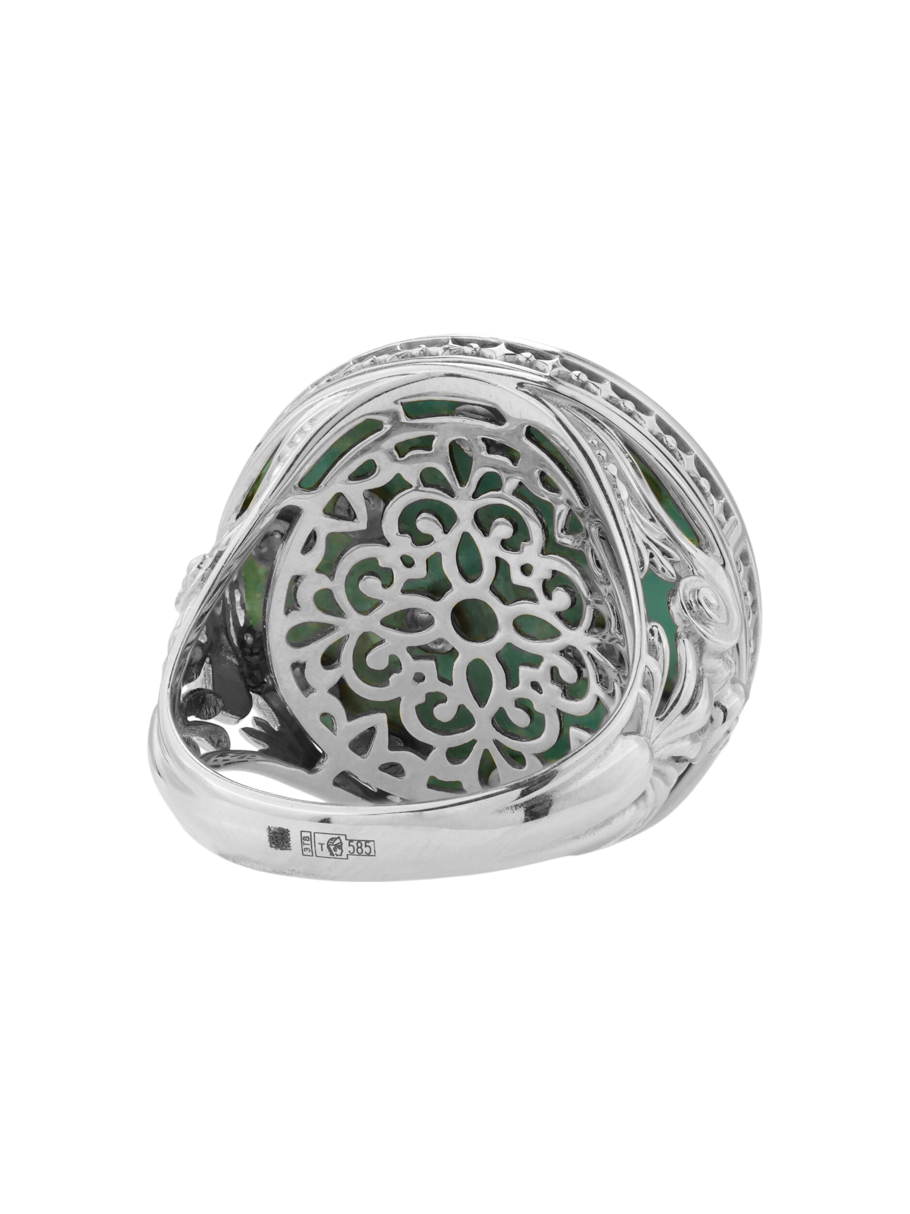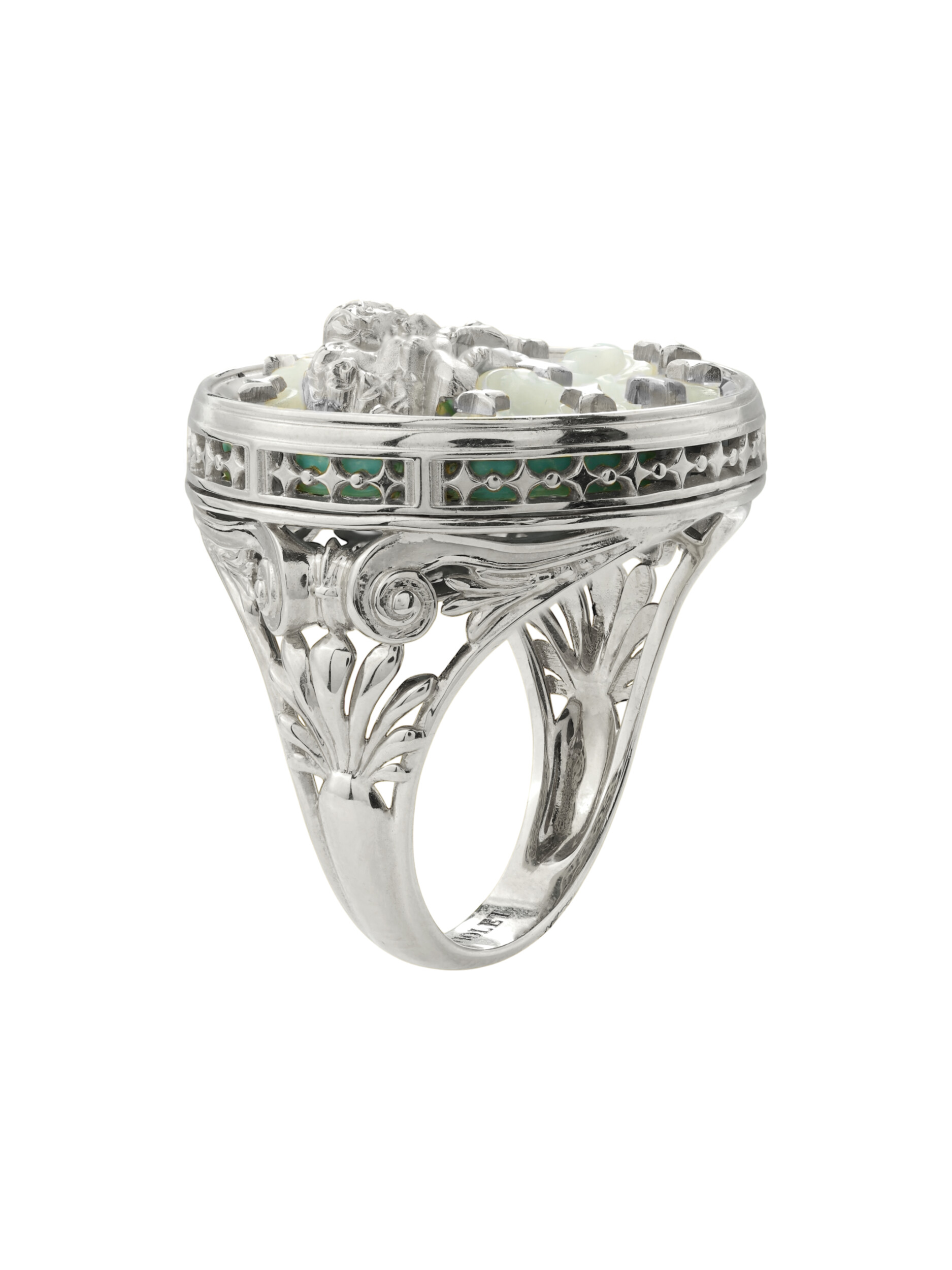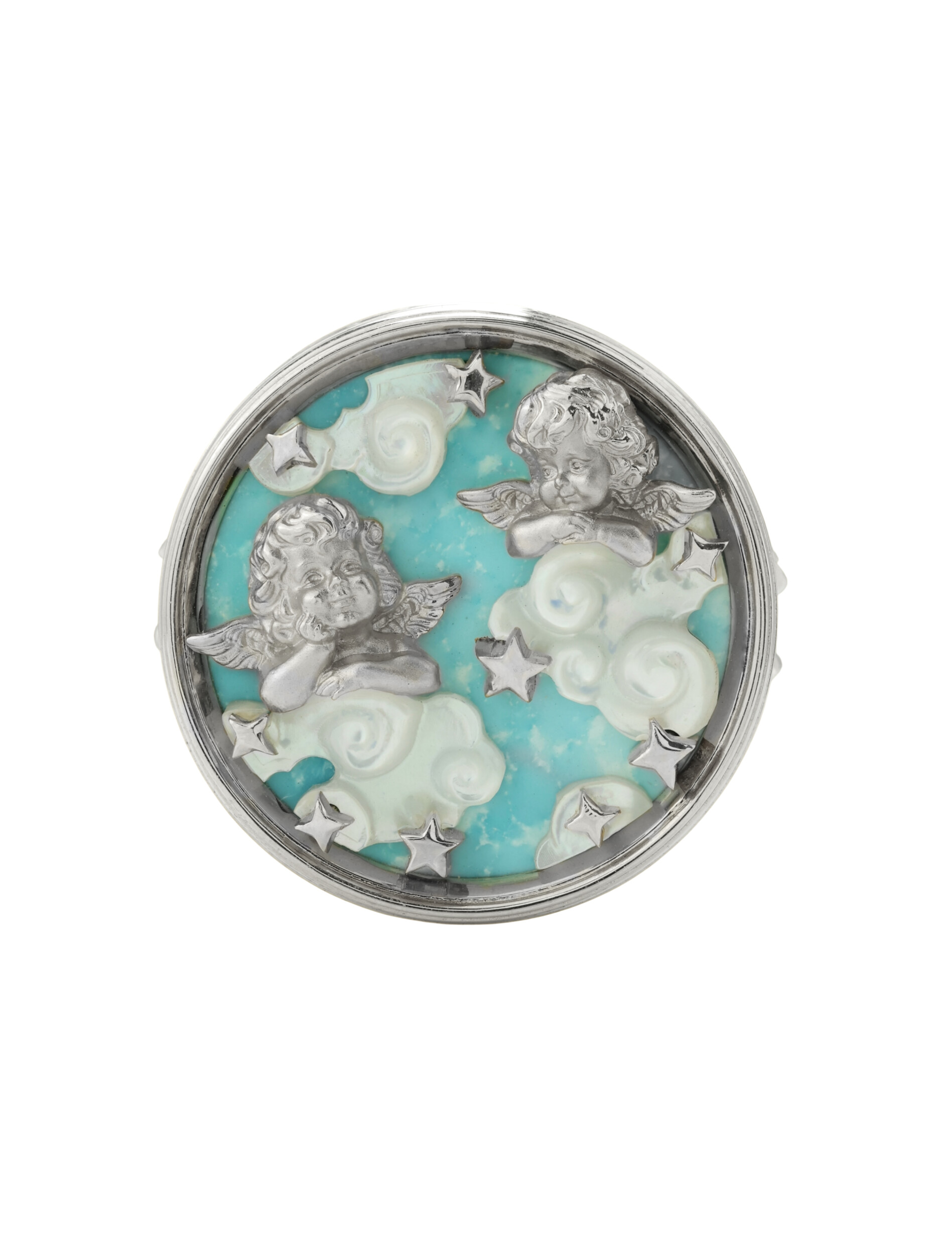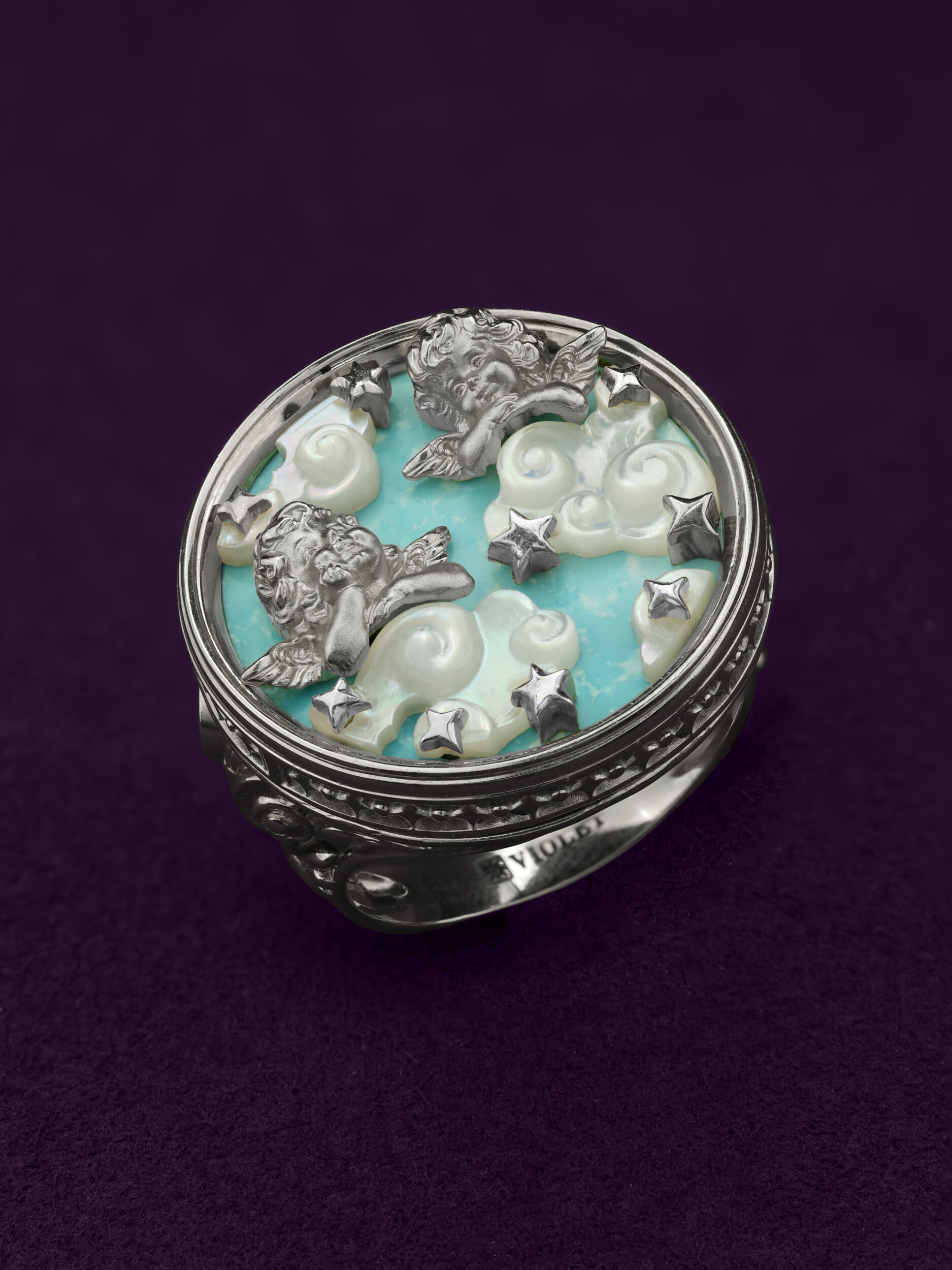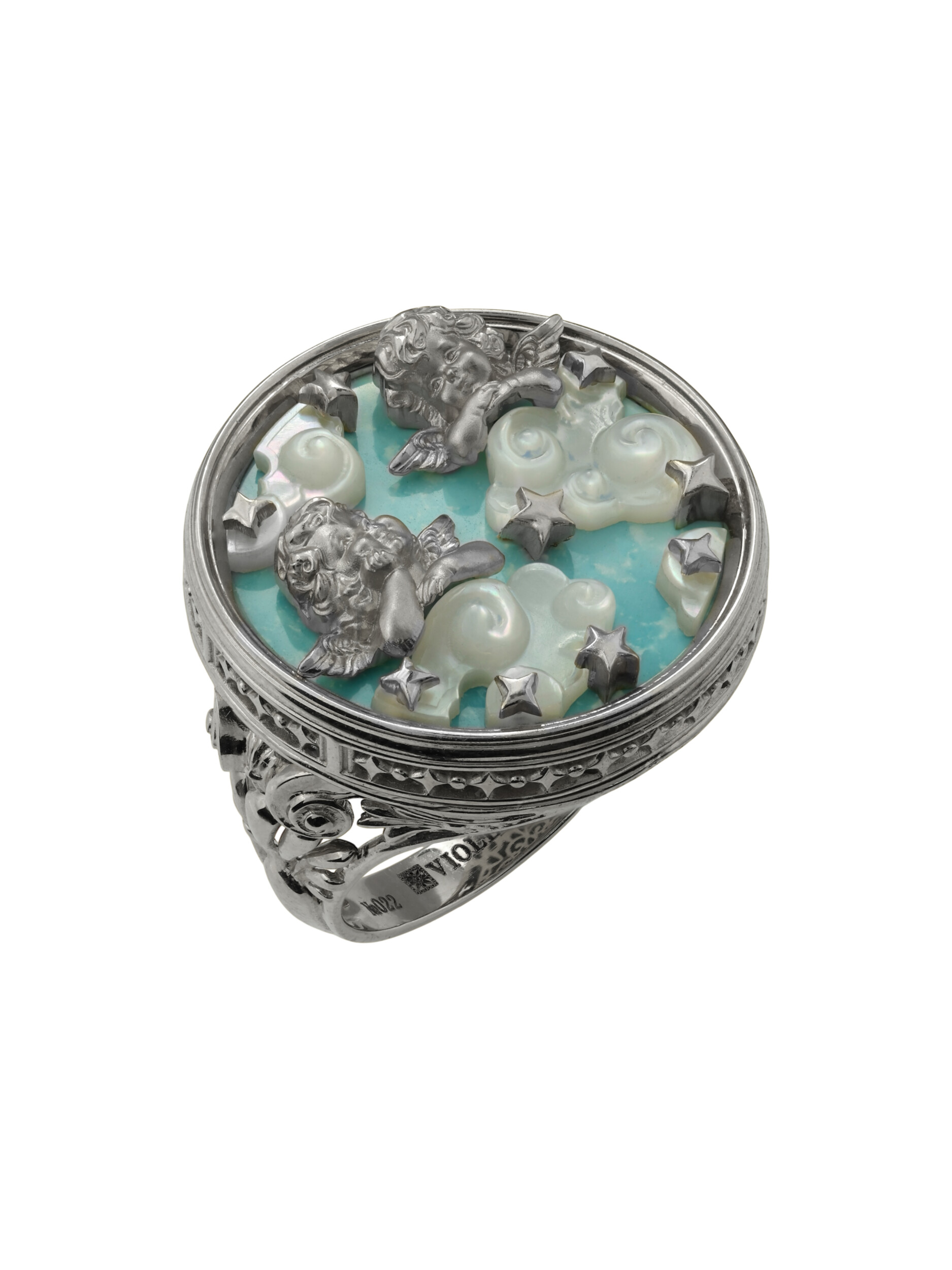 Кольцо из белого золота 585 пробы из коллекции De luxe Premium — Амуры — это ювелирное произведение, воплощающее нежность и художественное мастерство. Аксессуар выполнен в оригинальном дизайне с изображением купидонов, которые словно парят над небесным фоном. Центром композиции стала искусно подобранная вставка из бирюзы, чей насыщенный бирюзовый цвет гармонично сочетается с мягким сиянием перламутра. Декоративные элементы в форме облаков и звезд придают изделию особую романтичность и глубину.