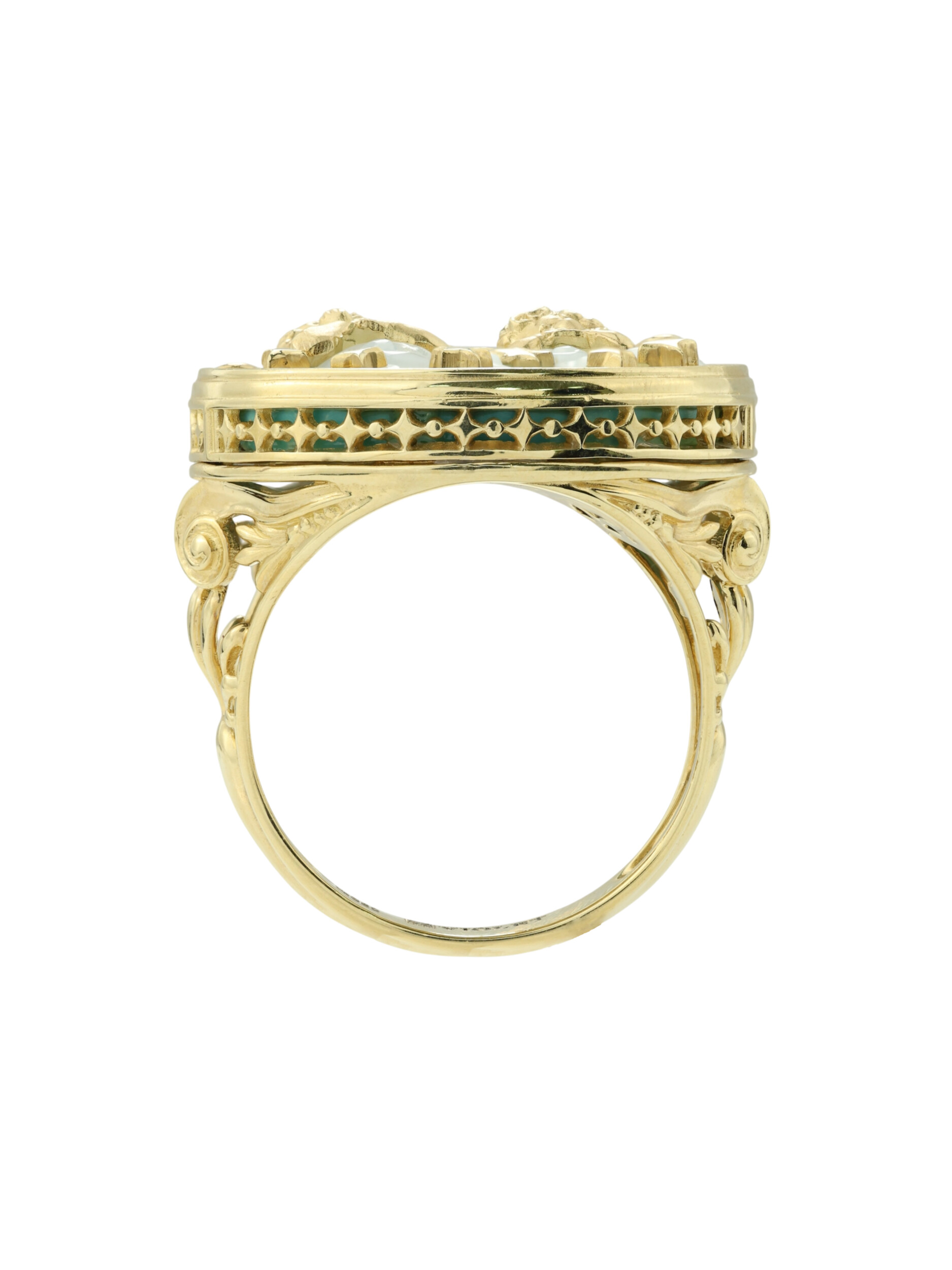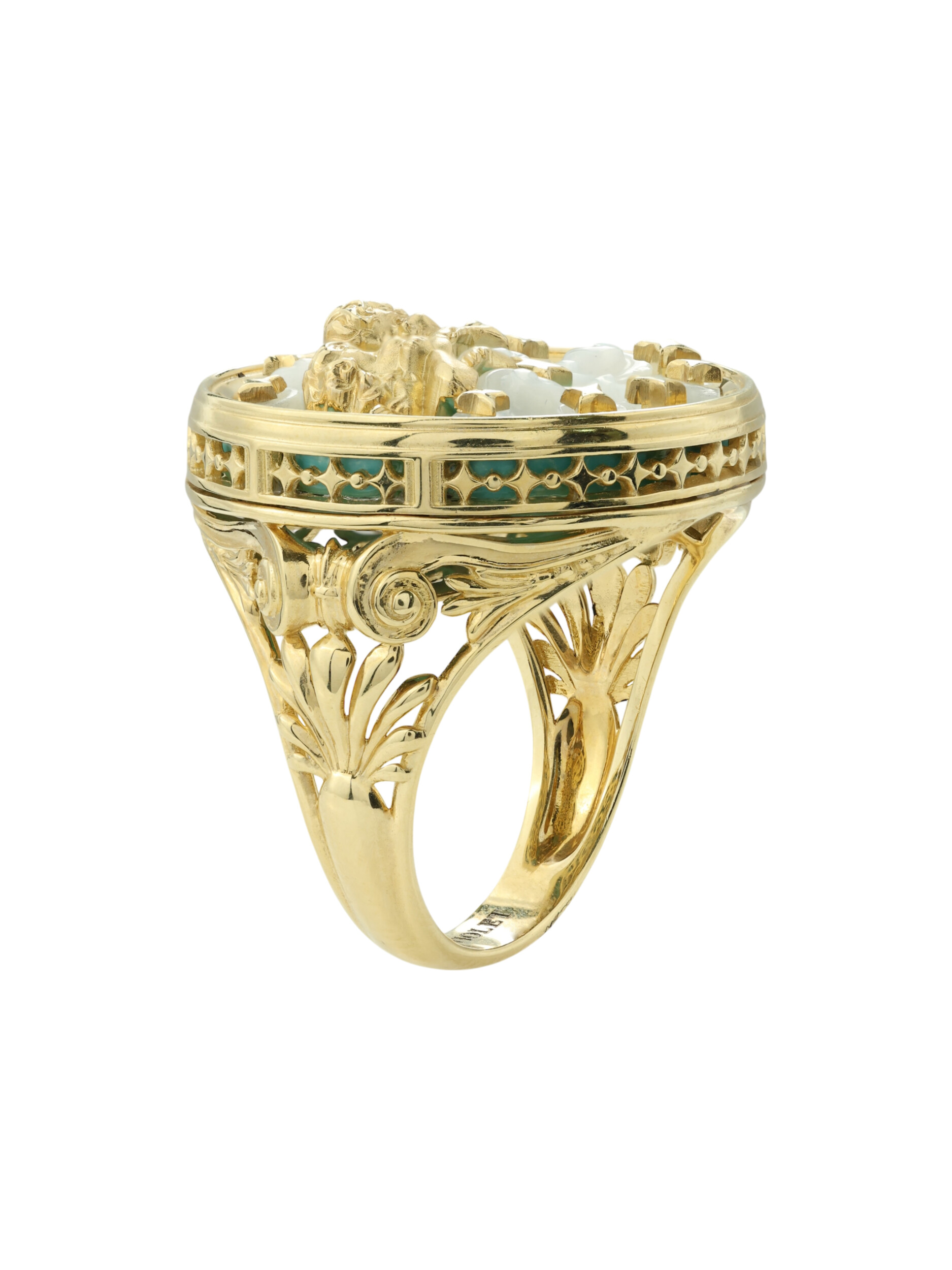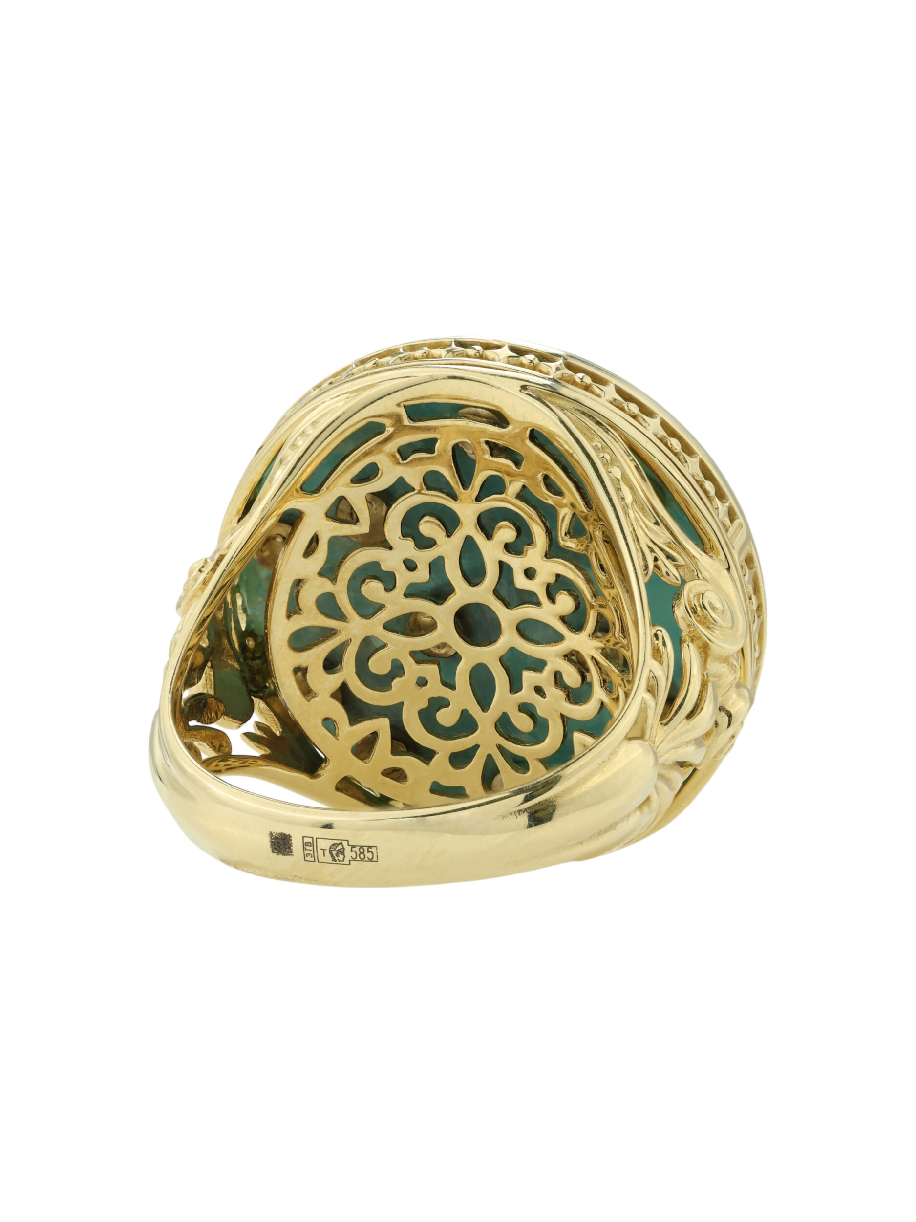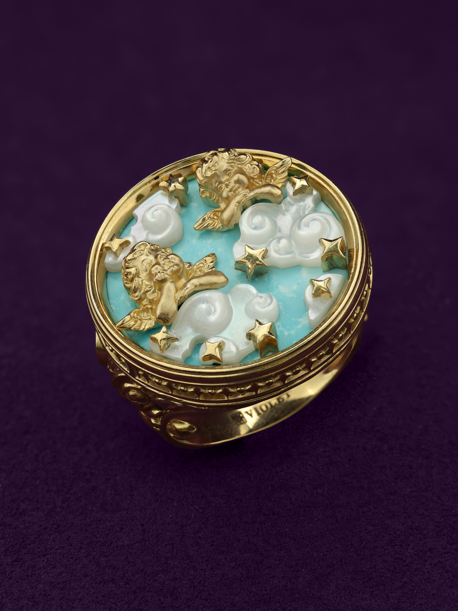 Гармоничное сочетание лимонного цвета золота с мягким блеском перламутра и насыщенным бирюзовым оттенком делает это украшение универсальным дополнением образа. Дизайн с купидонами придает кольцу особый шарм и символичность. Аксессуар подходит как для женщин, так и для мужчин, ценящих эксклюзивные украшения с глубоким смыслом. Кольцо представлено в широкой размерной сетке от 15 до 23, что позволяет подобрать идеальную посадку.