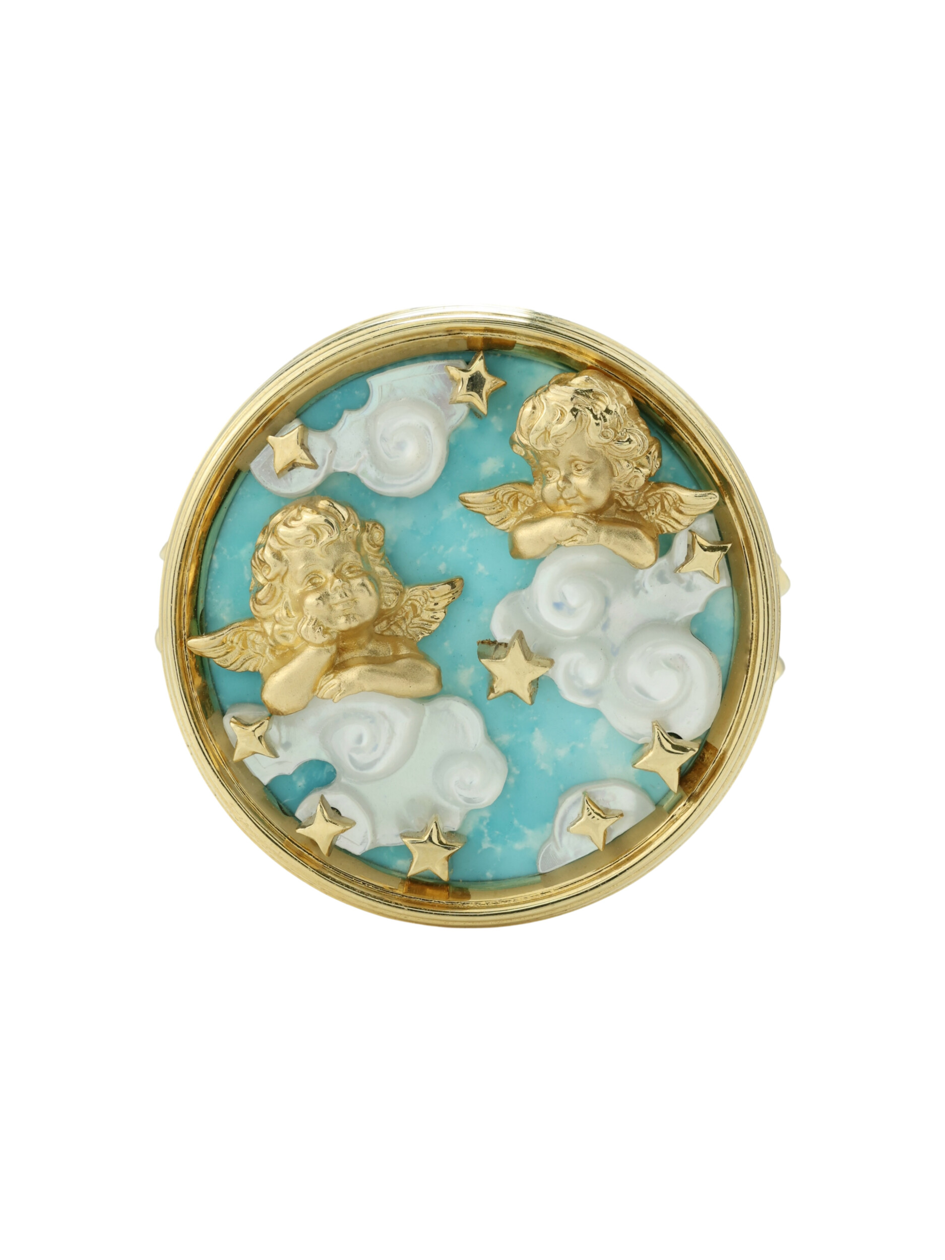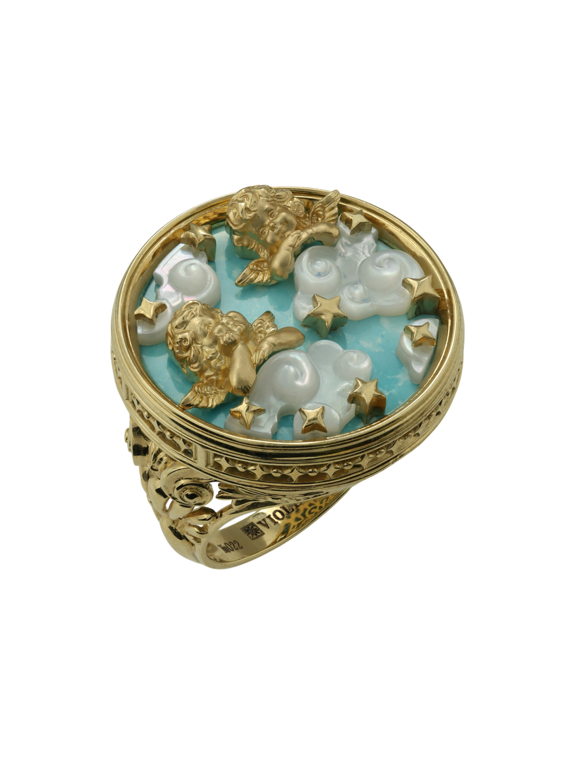 Кольцо из лимонного золота 585 пробы из коллекции De luxe Premium — Амуры — это настоящее произведение ювелирного искусства, воплощающее эстетику возвышенной романтики. Центральный элемент композиции выполнен в виде небесной сцены, где искусная гравировка в виде очаровательных купидонов соседствует с нежностью перламутровых облаков. Тщательно подобранная вставка из натуральной бирюзы создает яркий акцент, напоминающий чистое лазурное небо, на фоне которого сияют золотые звезды. Каждая деталь изделия продумана до мелочей, подчеркивая мастерство исполнения.