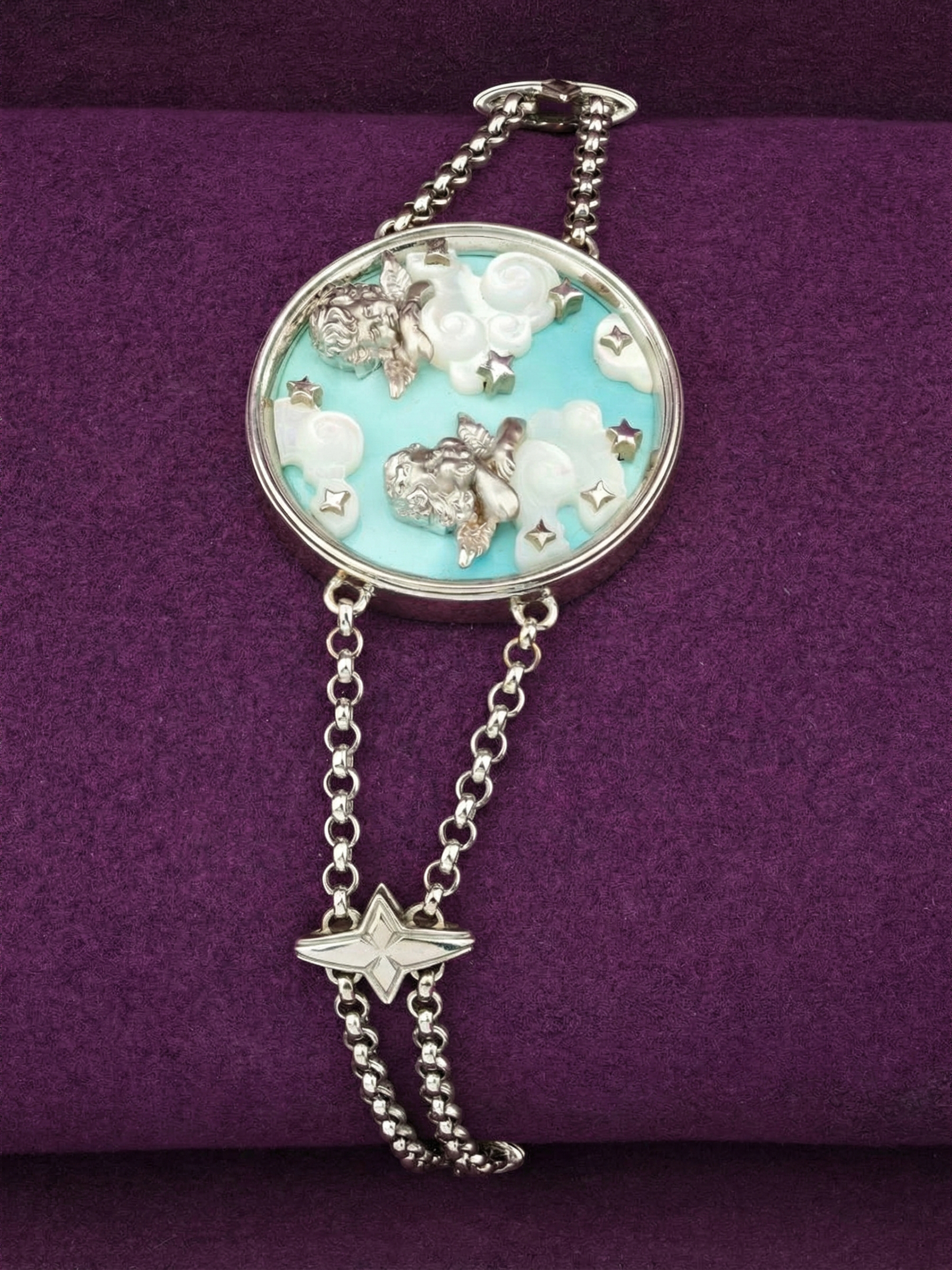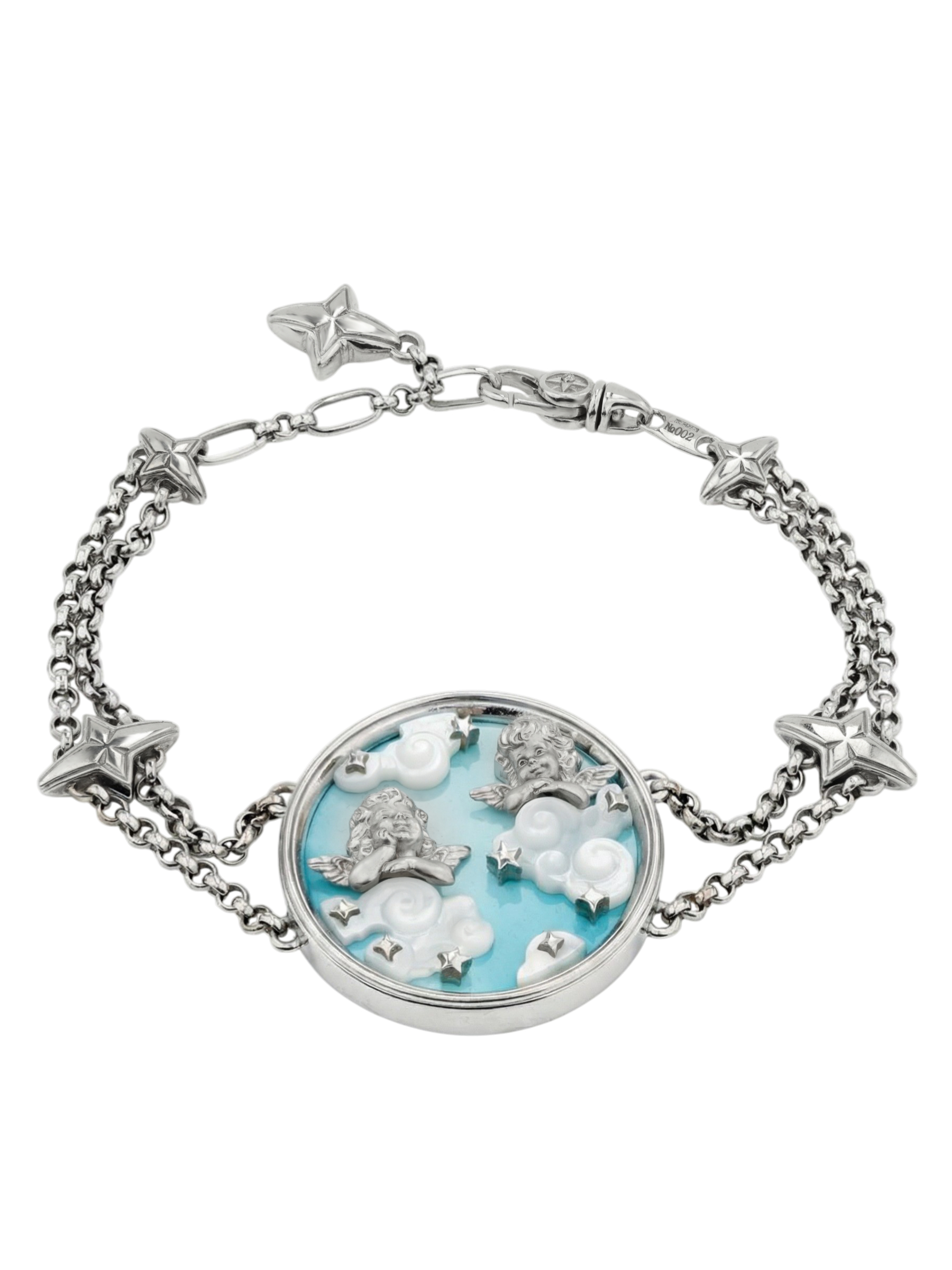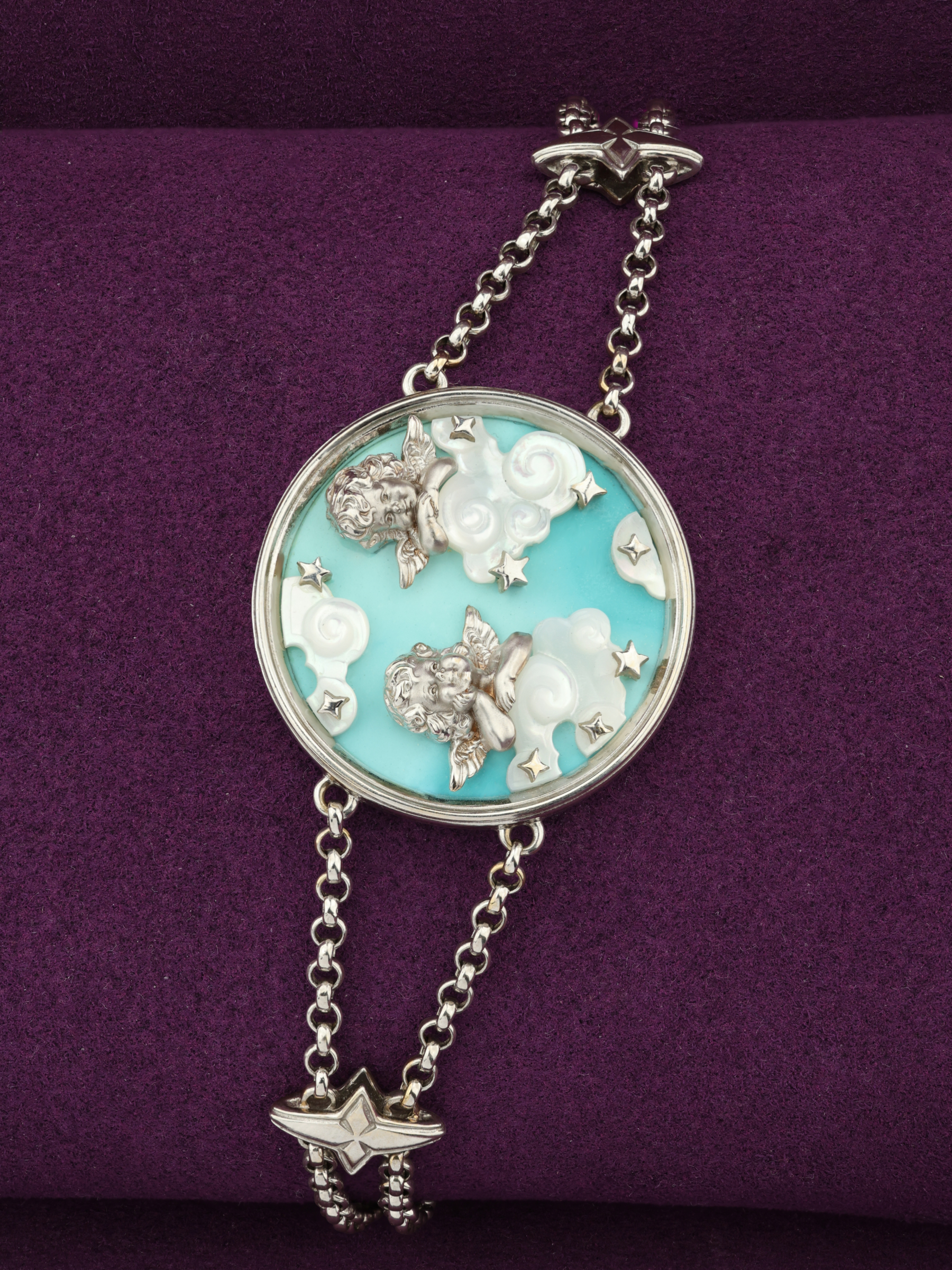 Изысканный браслет из белого золота 585 пробы из коллекции De luxe Premium — Амуры станет воплощением утонченного вкуса и нежности. Дизайн изделия приковывает взгляд: центральным элементом украшения выступает круг, внутри которого мастерски исполнены фигурки купидонов. Оригинальная композиция, выполненная с использованием вставок из перламутра и бирюзы, создает гармоничный контраст бирюзовых и перламутровых оттенков, добавляя аксессуару глубину и особое очарование.