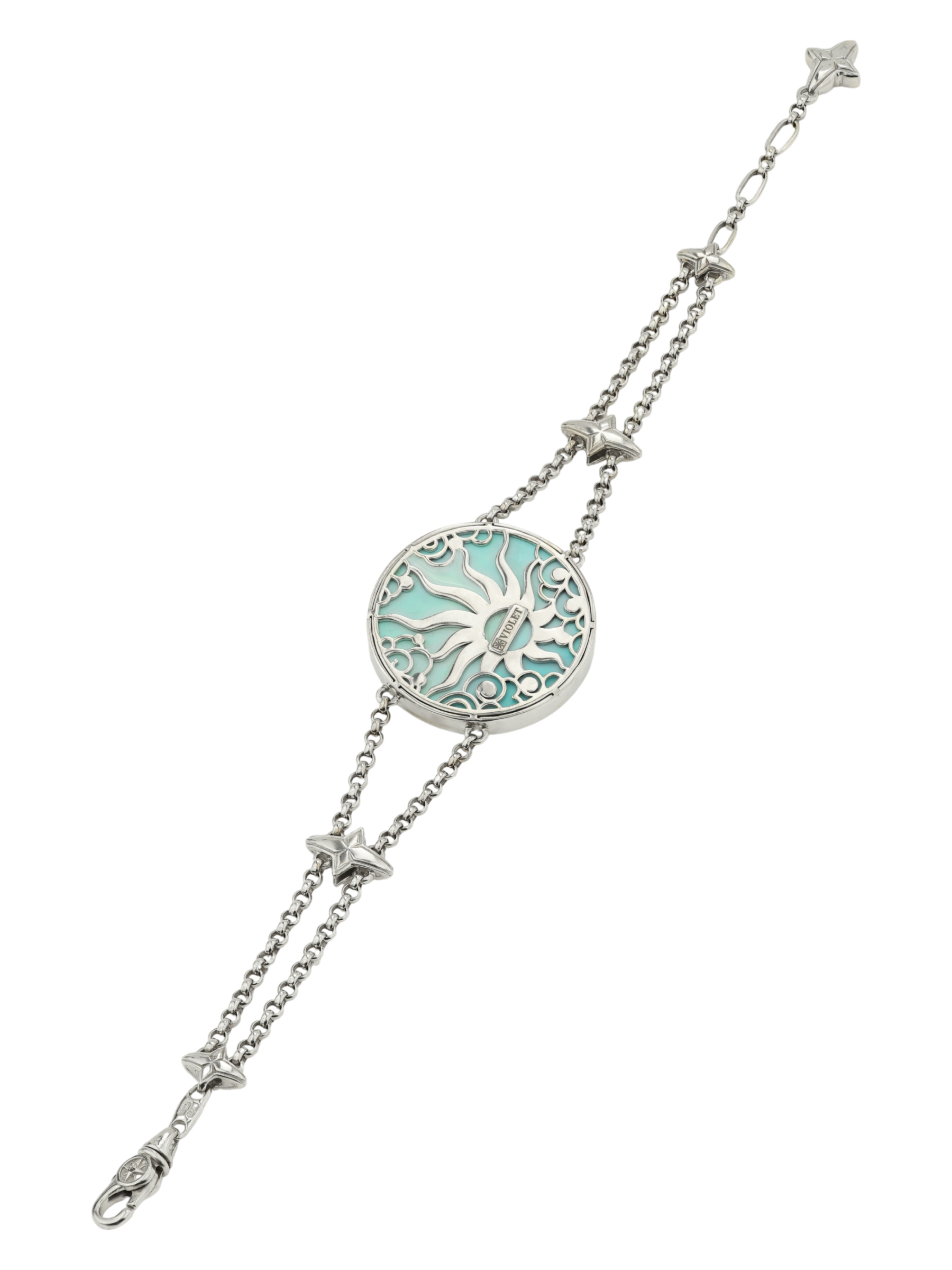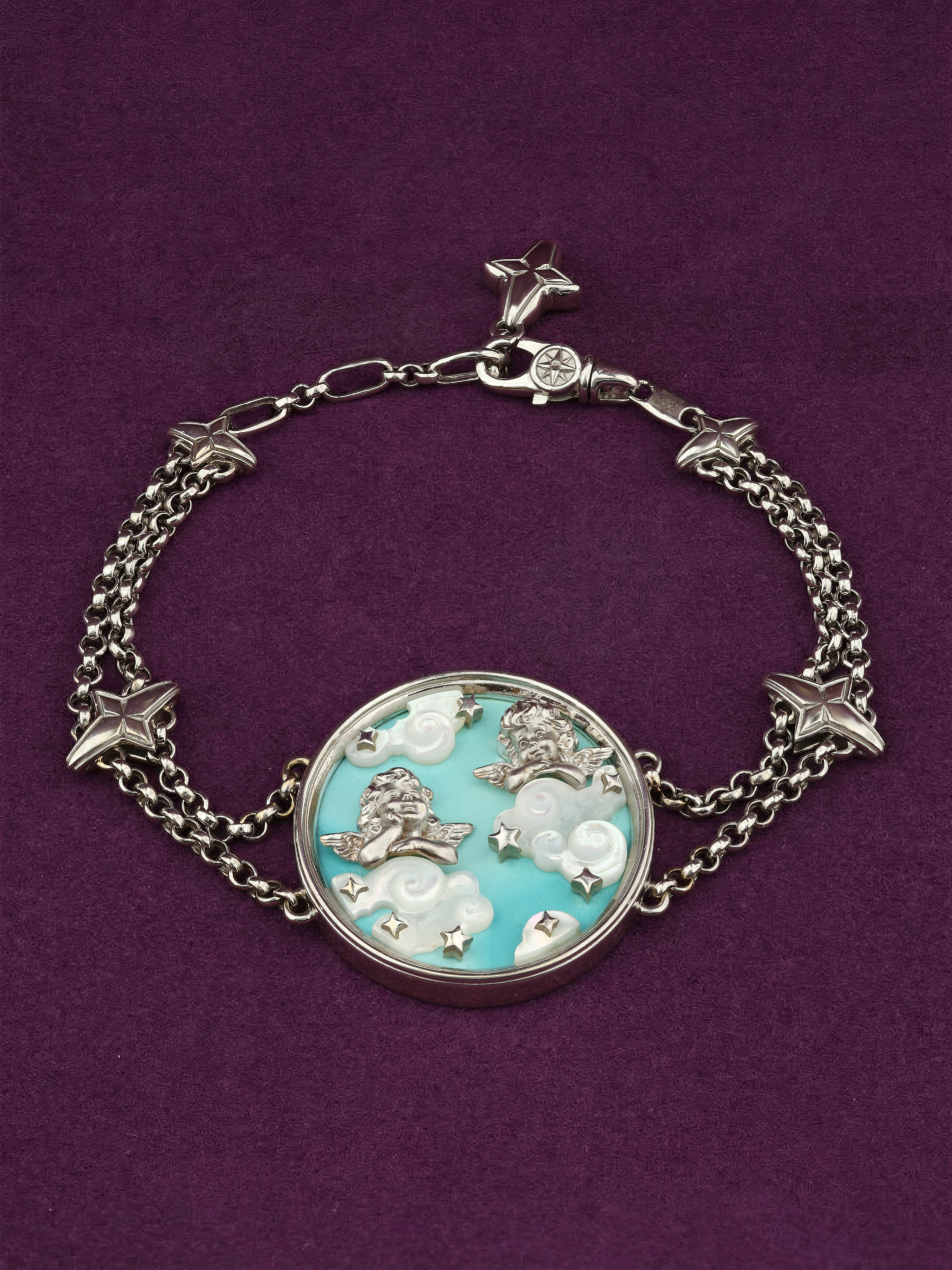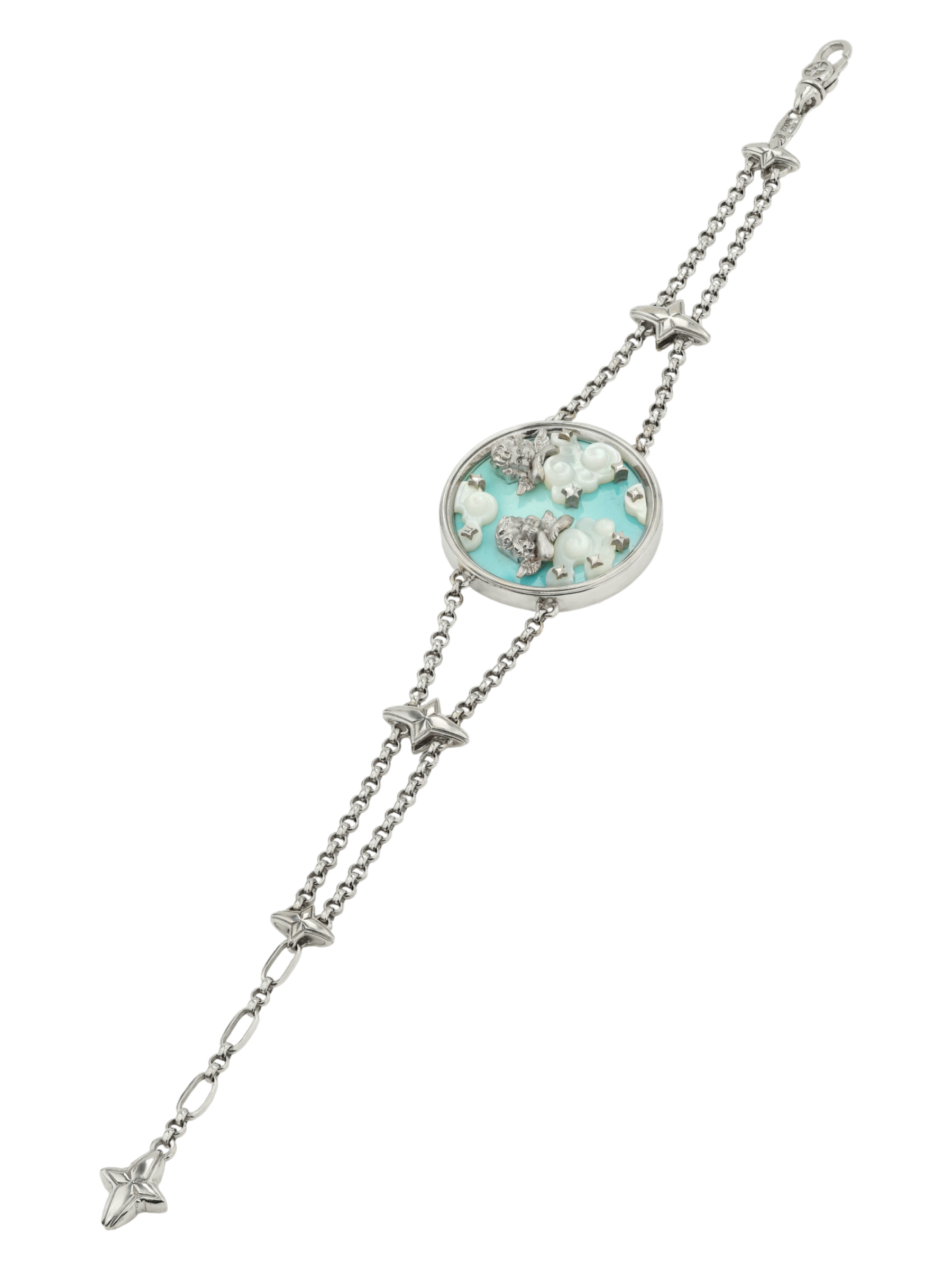 Изысканный браслет из белого золота 585 пробы из коллекции De luxe Premium — Амуры станет воплощением утонченного вкуса и нежности. Дизайн изделия приковывает взгляд: центральным элементом украшения выступает круг, внутри которого мастерски исполнены фигурки купидонов. Оригинальная композиция, выполненная с использованием вставок из перламутра и бирюзы, создает гармоничный контраст бирюзовых и перламутровых оттенков, добавляя аксессуару глубину и особое очарование.