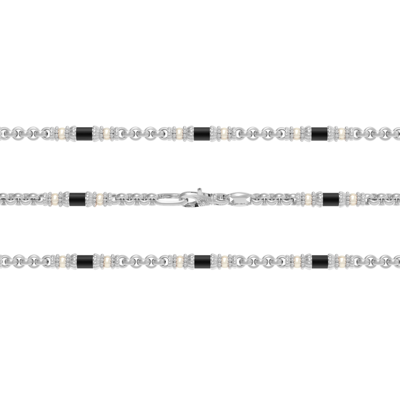 В дизайне гармонично объединены 147 вставок: классический жемчуг белого цвета соседствует со строгим черным ониксом. Форма вставок — круг и цилиндр — создает динамичный ритм, который привлекает внимание и подчеркивает индивидуальность владельца. Белое золото служит идеальной оправой для такого контрастного сочетания, создавая целостный и глубокий образ.
