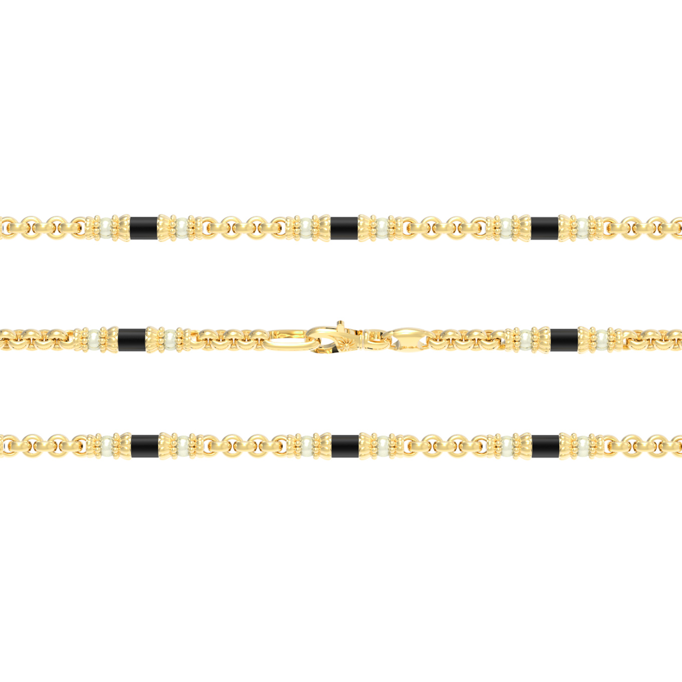 Центральным элементом композиции выступает гармоничное чередование жемчуга белого цвета и оникса черного цвета. Вставки разной формы — круглой и цилиндрической — создают сложный ритмичный рисунок, который притягивает взгляд. Всего в изделии использовано 147 вставок, что подчеркивает тщательную проработку деталей и кропотливый труд ювелиров. Лимонный оттенок золота придает украшению теплое, солнечное сияние, идеально дополняющее строгость черного оникса и нежность жемчуга.
