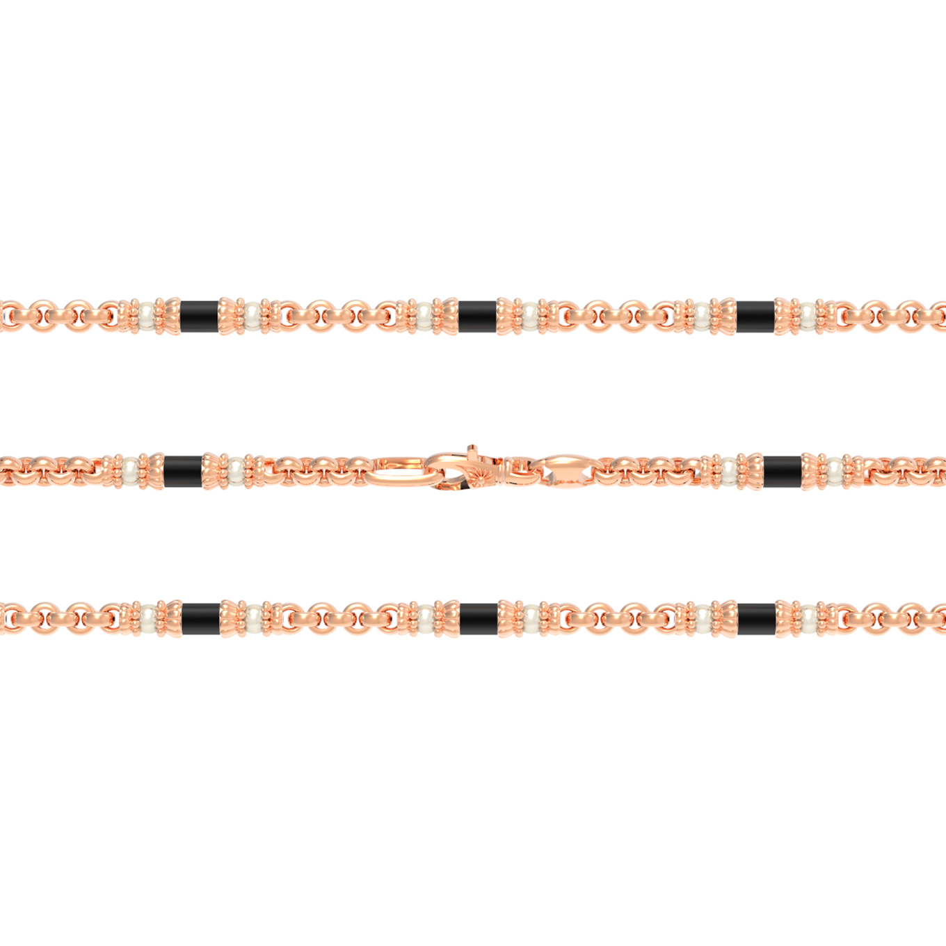 В дизайне цепи использовано 147 вставок: жемчуг белого цвета соседствует с глубоким черным ониксом, создавая эффектный монохромный ритм. Форма вставок — круг и цилиндр — чередуется по всей длине изделия, подчеркивая выверенную эстетику каждого элемента. Контраст черного оникса и нежного жемчуга придает цепи уникальный и брутальный характер, делая её идеальным выбором для современного мужчины, ценящего оригинальные аксессуары с восточными мотивами.