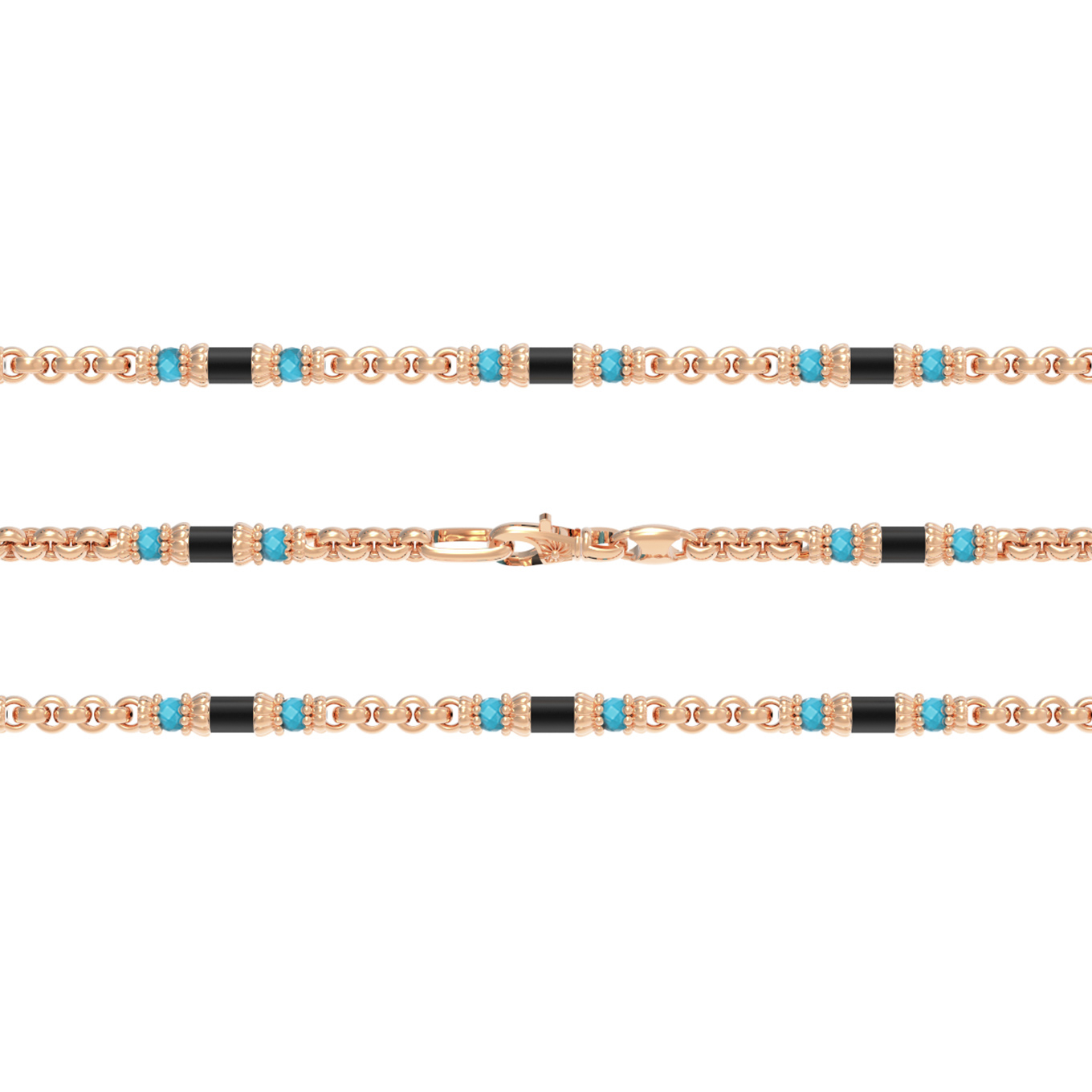 Особую выразительность аксессуару придает контрастное сочетание вставок. Дизайн включает 147 вставок: яркая бирюза бирюзового цвета гармонично соседствует с глубоким черным ониксом. Форма вставок — элегантные бусины и цилиндры, которые чередуются по всей длине изделия, создавая ритмичный и динамичный узор. Такой подбор материалов делает эту цепь по-настоящему заметным дополнением гардероба.