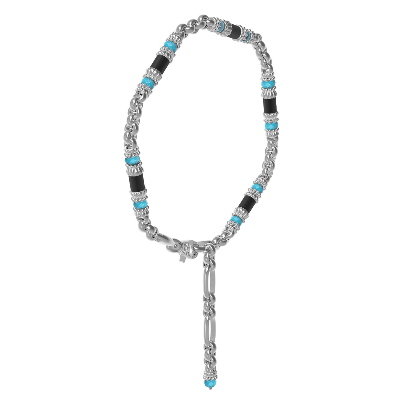 Особую выразительность браслету придает сочетание благородного белого золота с контрастными вставками. Ювелиры использовали 16 вставок, искусно чередуя яркий бирюзовый и глубокий черный цвета. Геометрия изделия продумана до мелочей: вставки выполнены в форме бусин и цилиндров, что создает интересный ритмический рисунок на запястье. Насыщенный цвет бирюзы в сочетании со строгим ониксом эффектно выделяется на фоне холодного блеска металла.