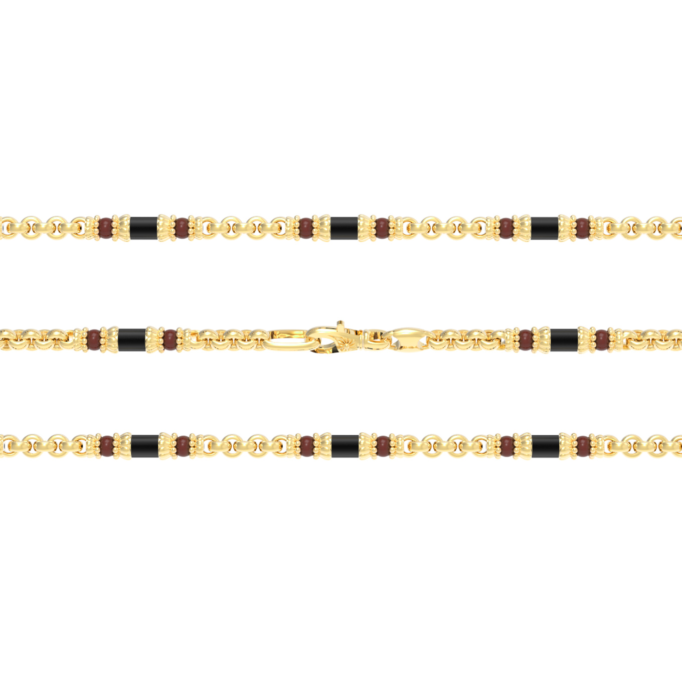 Особую художественную ценность этой цепи придает искусное сочетание вставок из оникса и коралла. Чередование черных цилиндров оникса и красных бусин коралла формирует контрастный ритм, подчеркивая эксклюзивность работы. Всего в дизайне использовано 147 вставок, что делает каждое ювелирное украшение из De Luxe — Индия настоящим произведением искусства. Качественная проработка деталей подчеркивает высокий статус изделия.