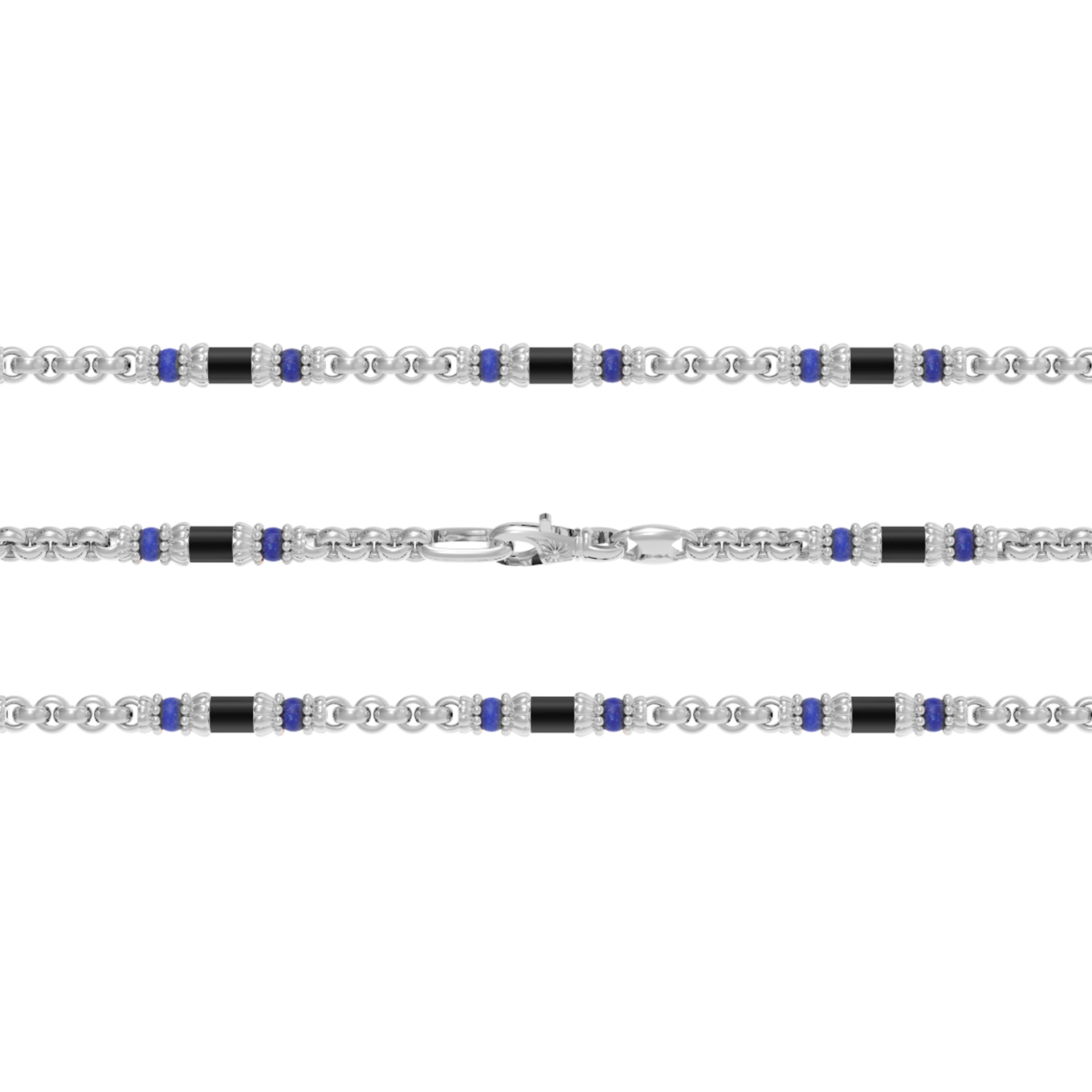 В дизайне изделия гармонично переплетаются холодный блеск белого золота, глубокий черный цвет оникса и насыщенный синий оттенок лазурита. Декоративные элементы в форме бусин и цилиндров создают ритмичный и детализированный узор, который привлекает внимание. В общей сложности в изделии использовано 147 вставок, что говорит о кропотливой и филигранной работе ювелиров.