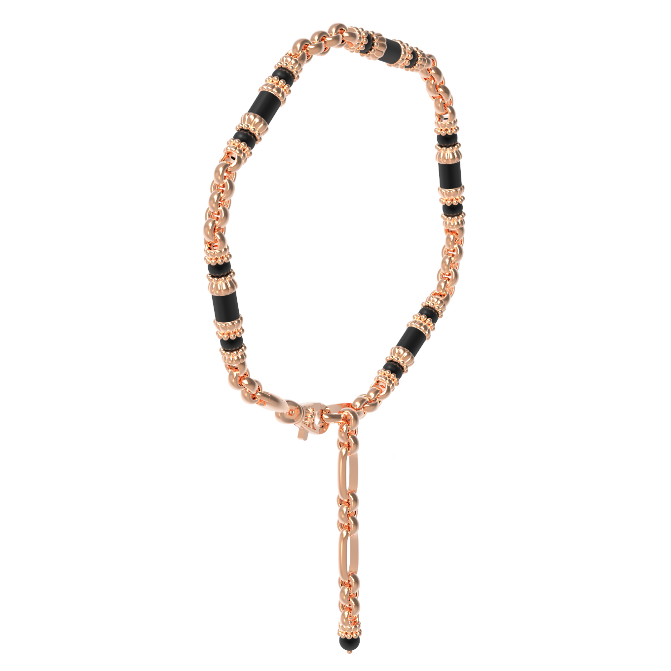 Центральным элементом композиции стали 16 вставок из оникса глубокого черного цвета. Форма вставок в виде цилиндрических бусин идеально гармонирует с плетением золотой цепи, создавая динамичный и цельный рисунок. Контраст между теплым оттенком красного золота и строгим черным ониксом делает украшение универсальным: оно безупречно дополнит как деловой костюм, так и более свободный стиль одежды.