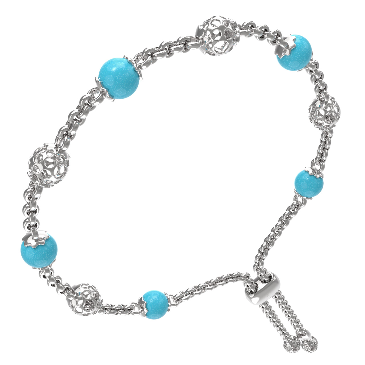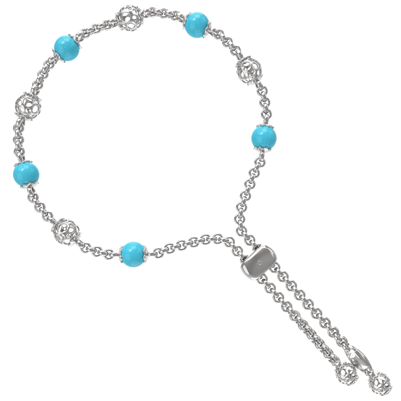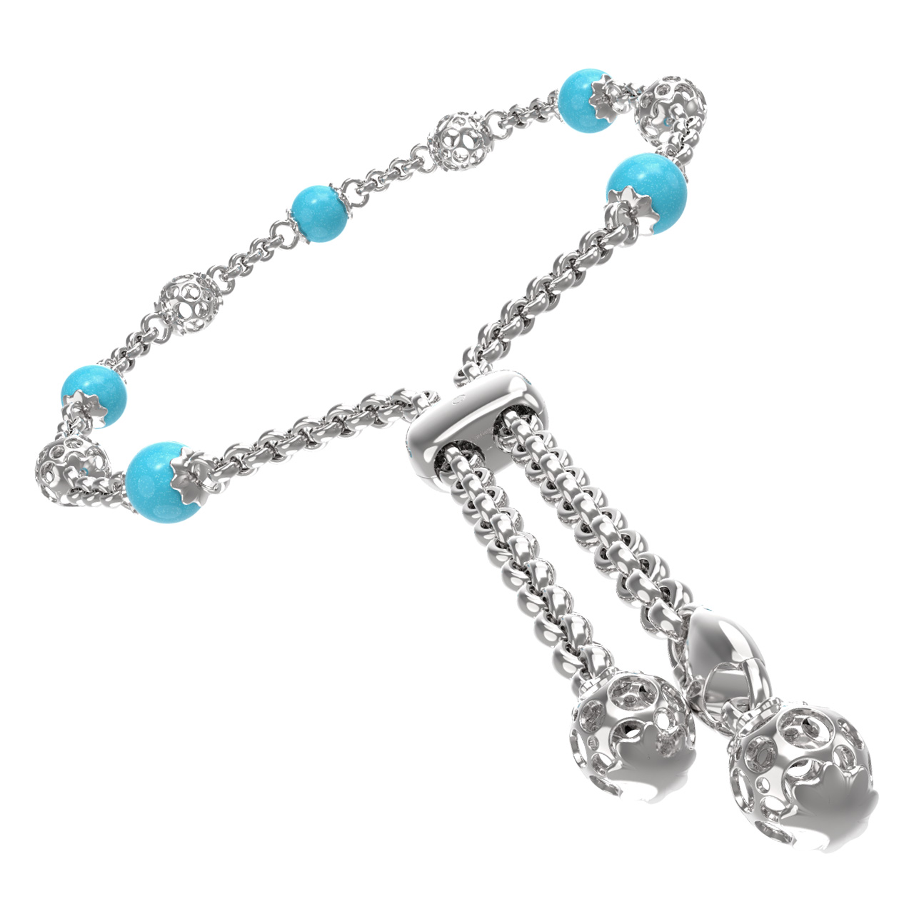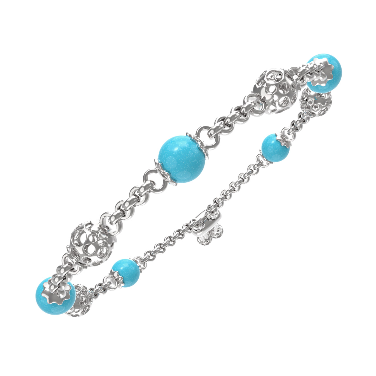 Изысканный браслет из белого золота 585 пробы станет утонченным акцентом вашего образа. Дизайн изделия вдохновлен культурой Индии, сочетая в себе восточные мотивы и современную ювелирную эстетику. Центральным элементом украшения выступают 5 вставок из яркой бирюзы бирюзового цвета, выполненных в форме аккуратных бусин, которые эффектно контрастируют с холодным блеском драгоценного металла.