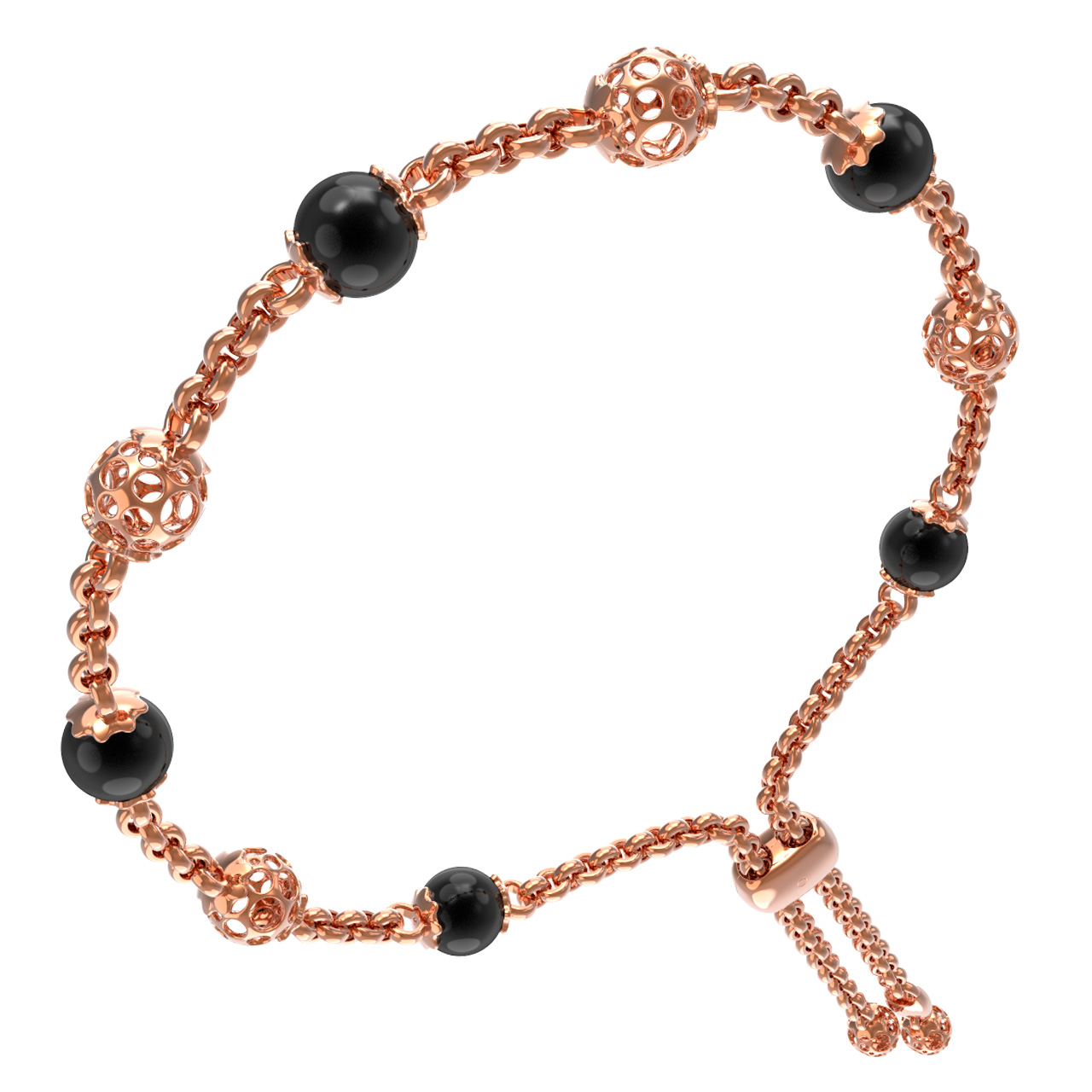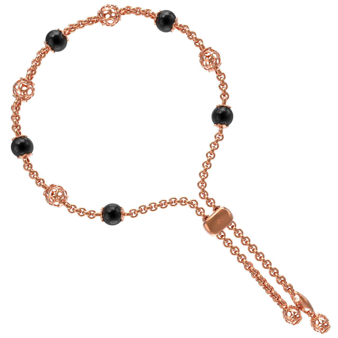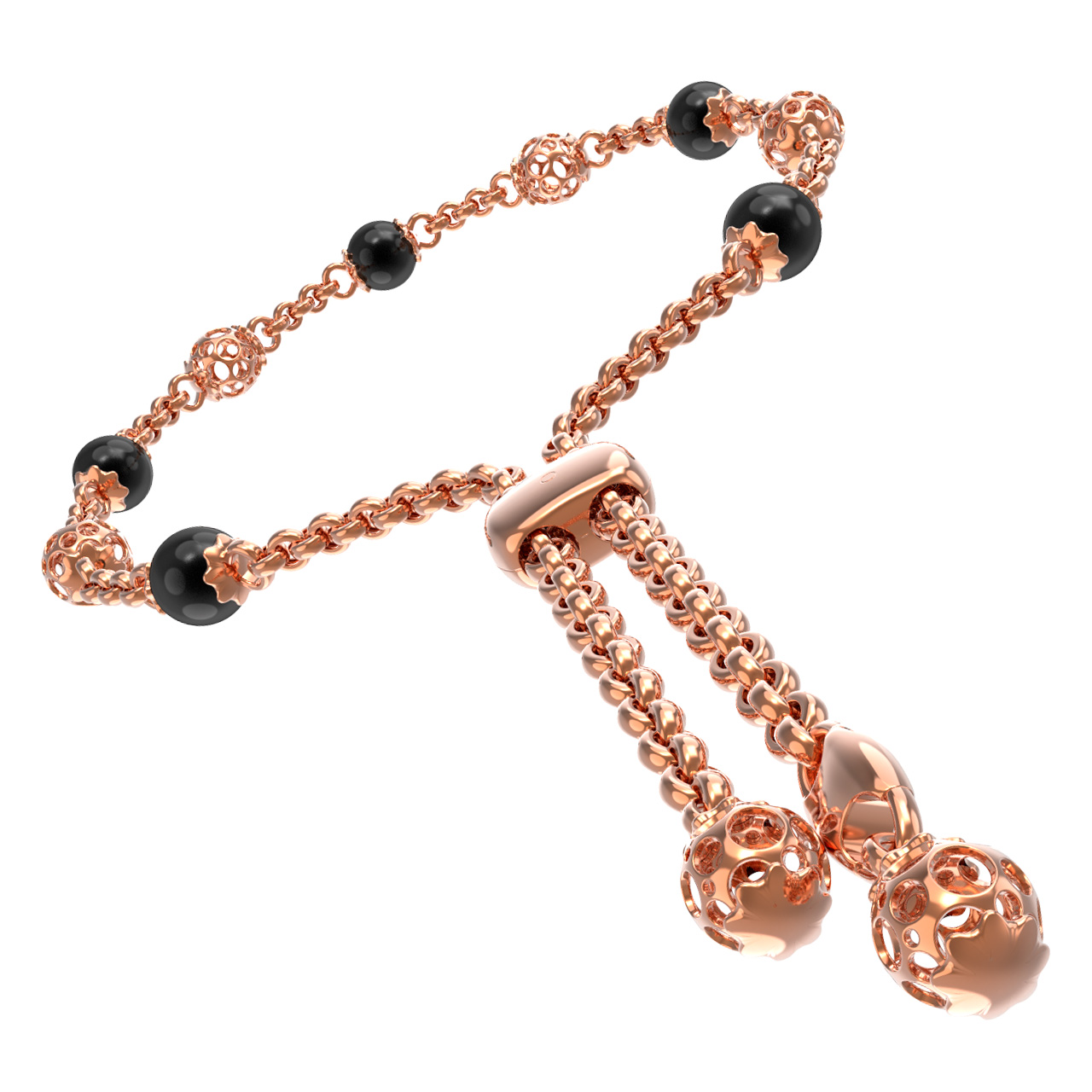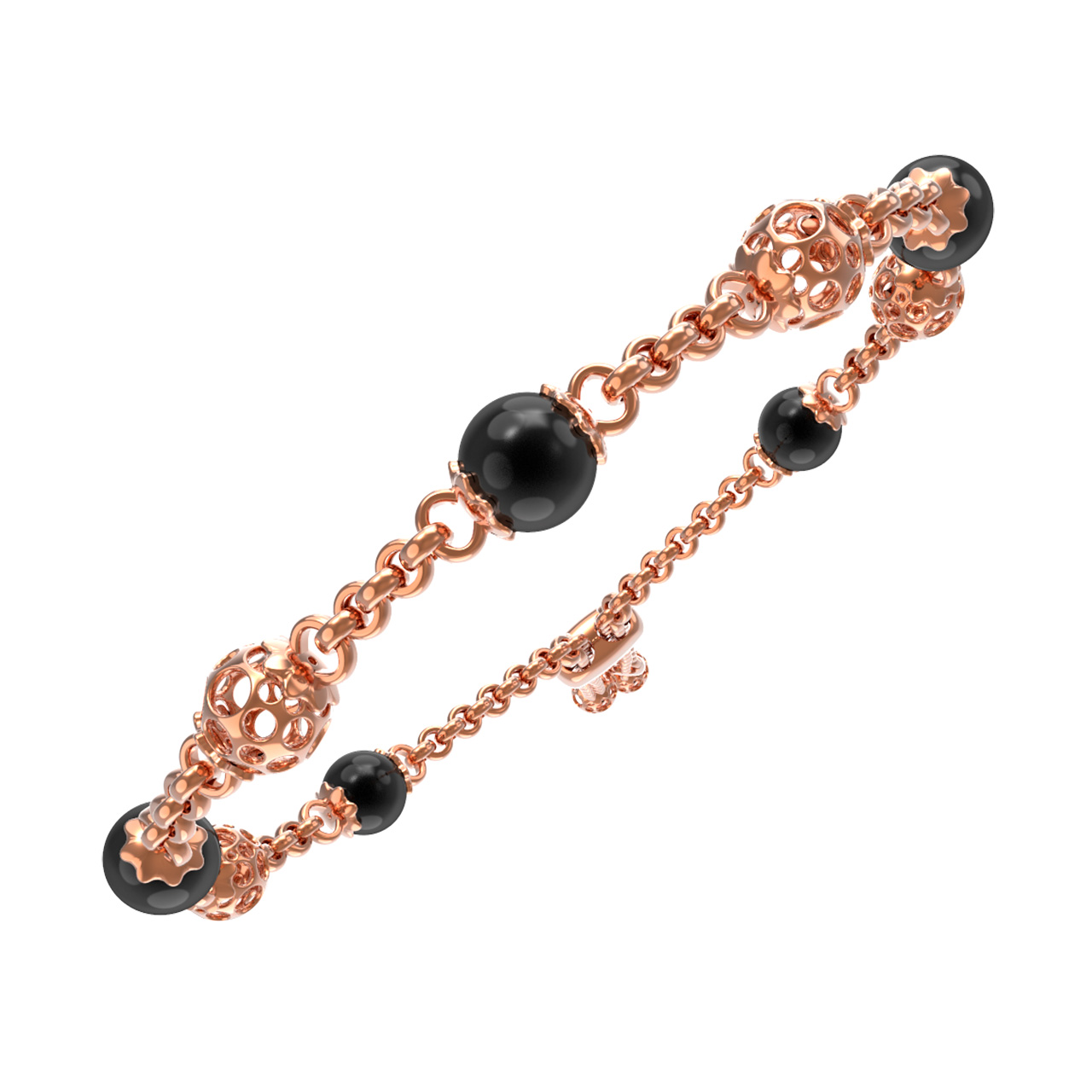Центральным элементом композиции являются 5 вставок оникса, выполненных в форме безупречной бусины. Контрастное сочетание красного золота и темного камня придает изделию особую выразительность. Ажурные золотые элементы, чередующиеся с ониксом, добавляют браслету легкости и визуальной сложности. Это универсальное украшение, которое идеально подходит как для женщин, так и для мужчин, позволяя создавать стильные и современные ансамбли.