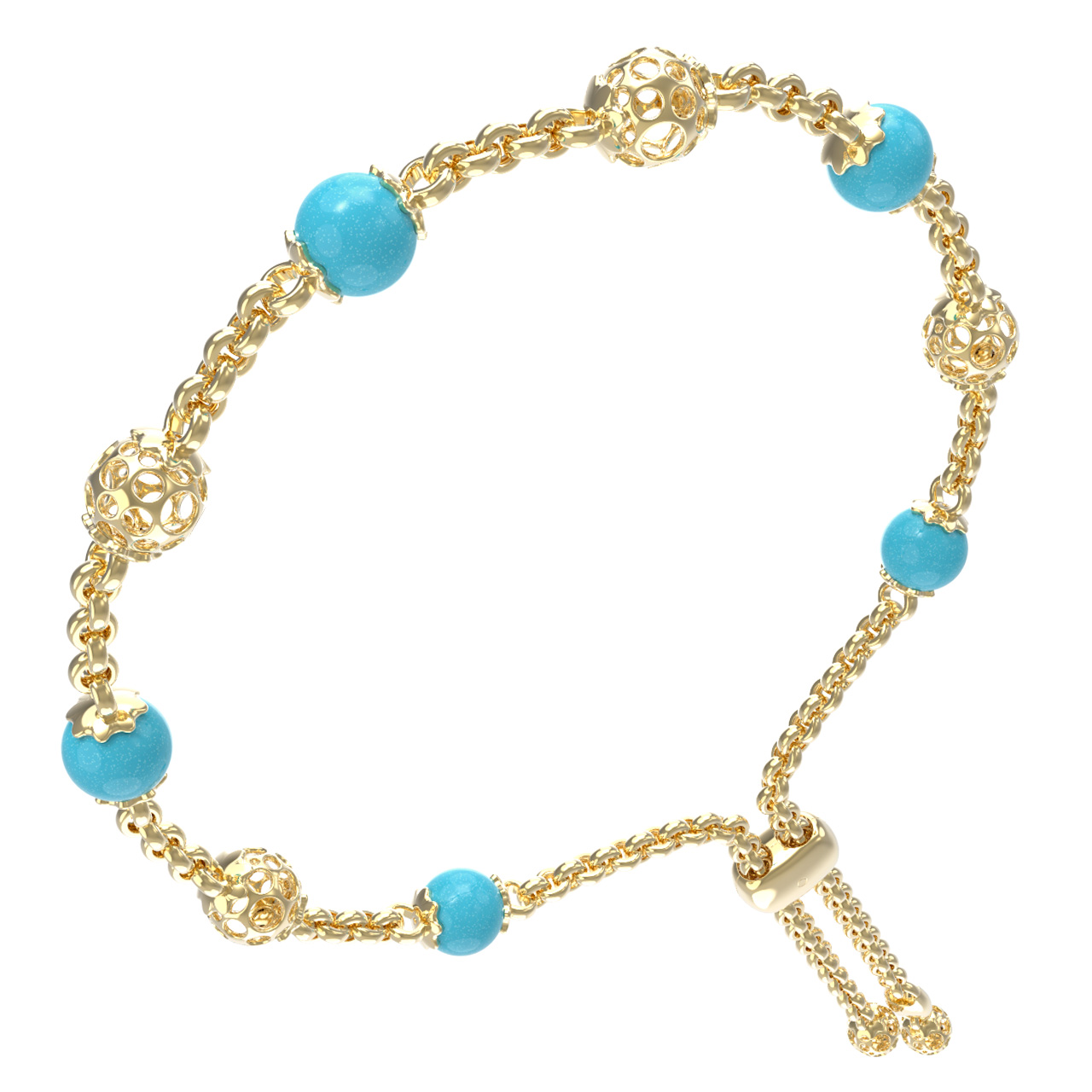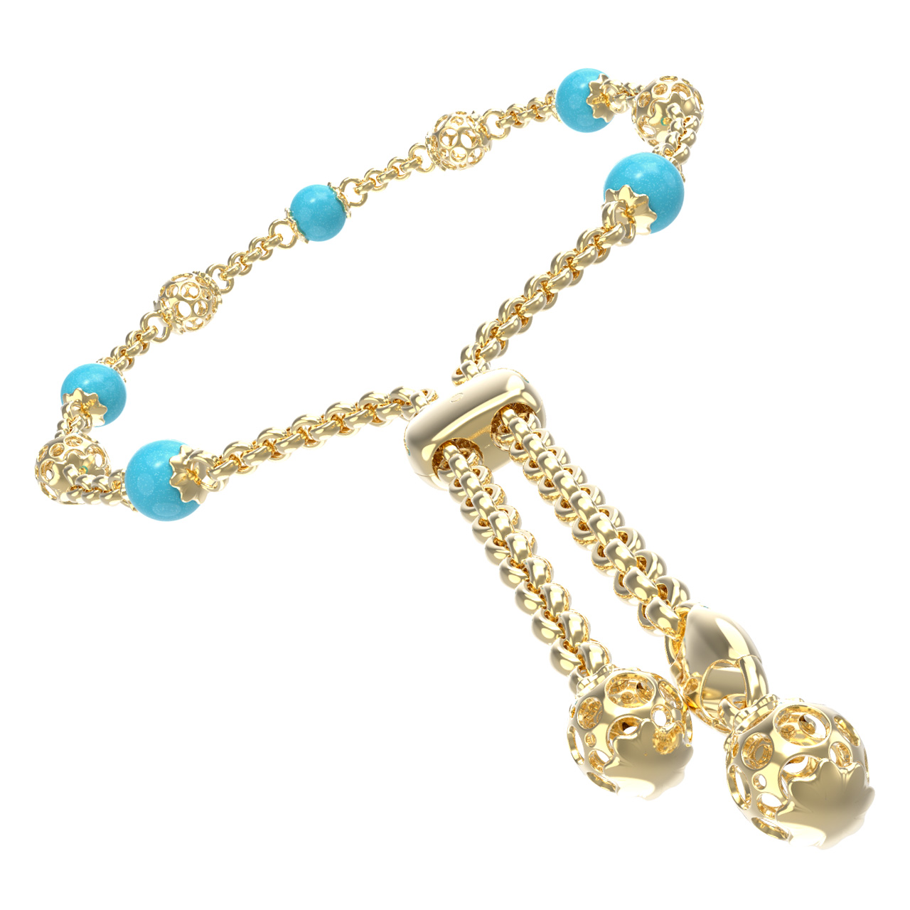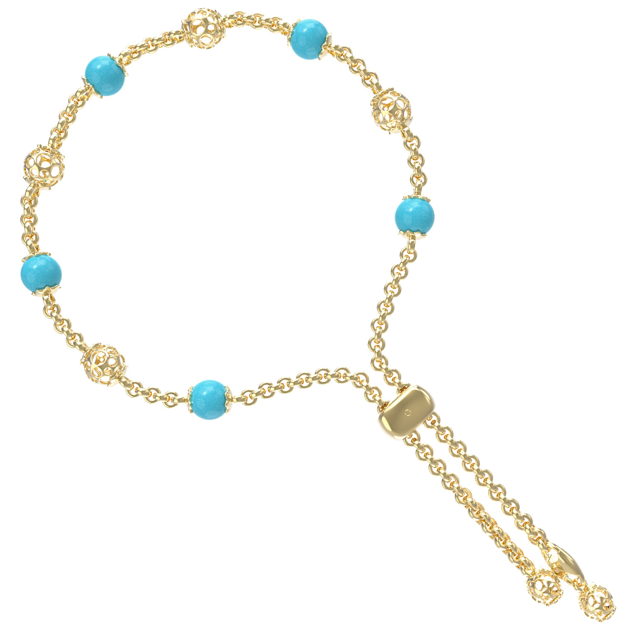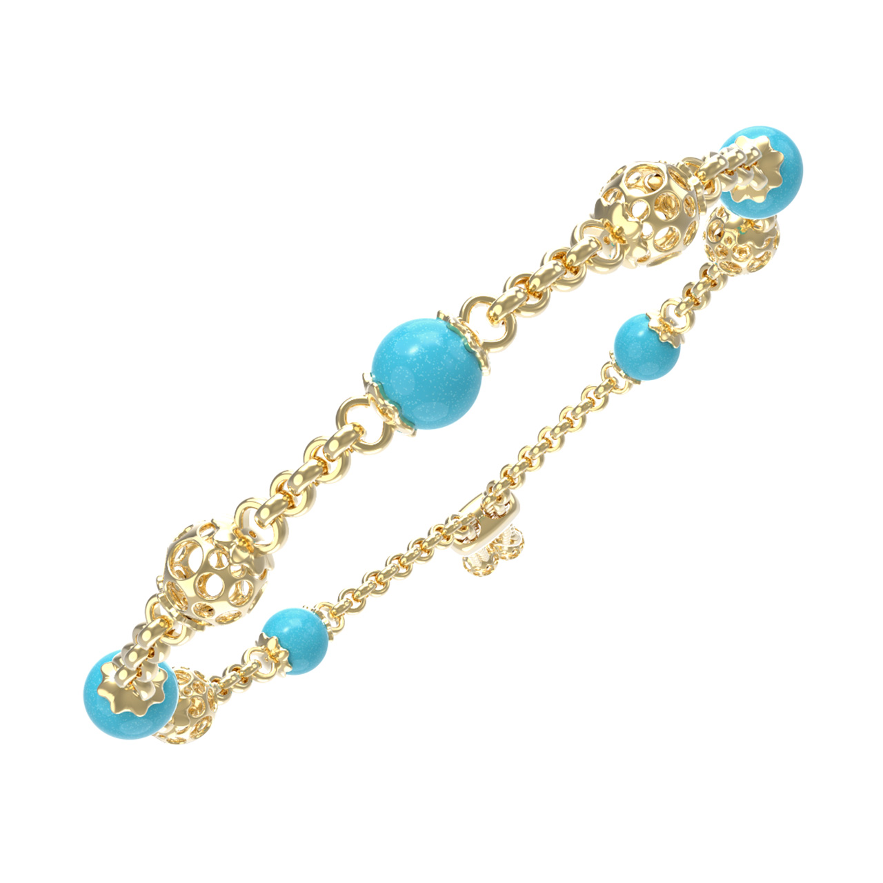 Основой композиции являются 5 вставок из бирюзы, обладающих насыщенным бирюзовым цветом. Камни имеют классическую форму бусины, которая идеально подчеркивает их природную красоту. Лимонный оттенок золота эффектно обрамляет яркие вставки, создавая стильный контраст. Ажурные золотые элементы, чередующиеся с бирюзой, придают браслету легкость и утонченность.