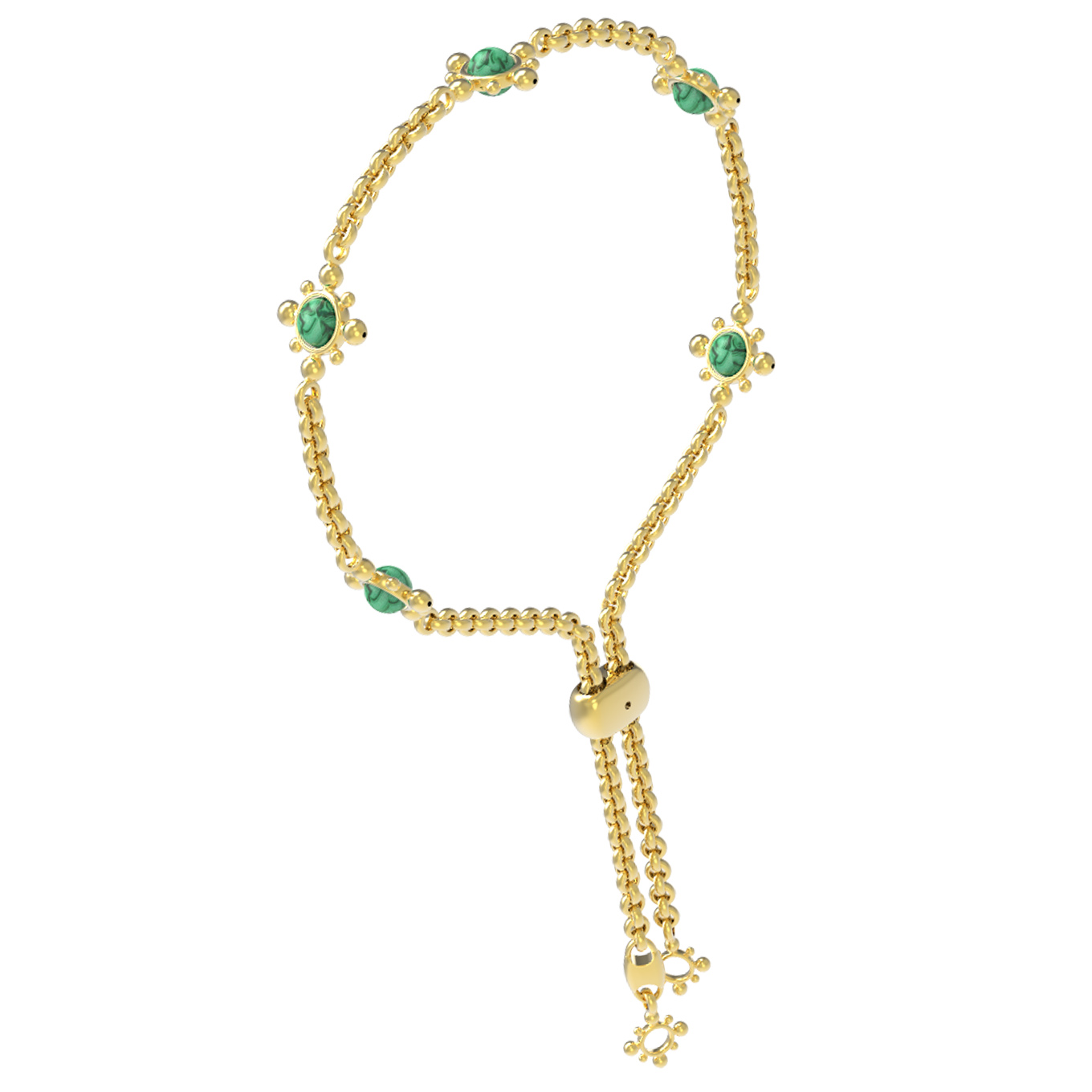 Центральными элементами композиции выступают 5 вставок из малахита насыщенного зелёного цвета. Камни, имеющие форму классической бусины, искусно вплетены в цепочку, создавая акцент на утонченности и самобытности изделия. Дизайн в стиле Индия придает украшению особый шарм, превращая его в яркий аксессуар, способный преобразить любой образ.