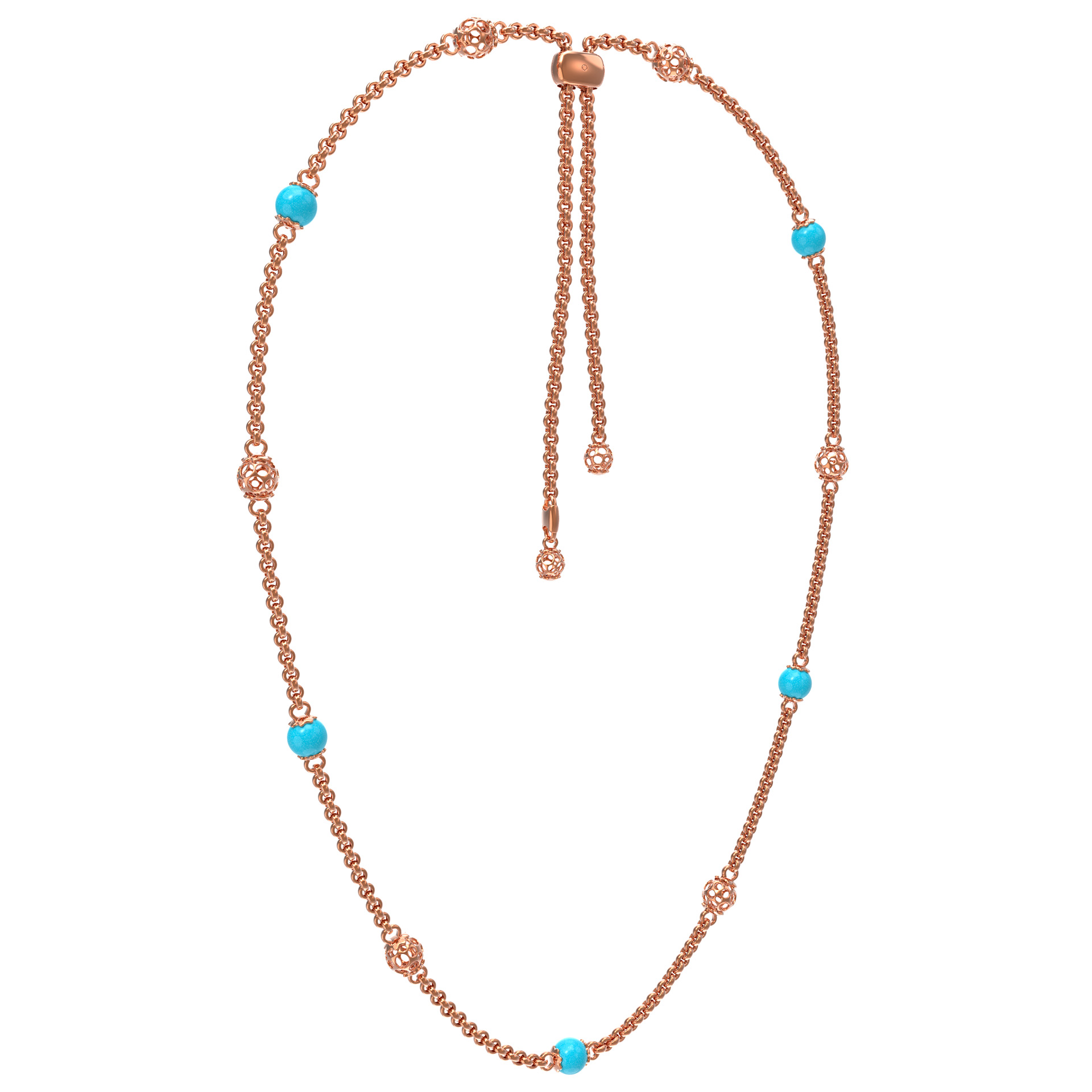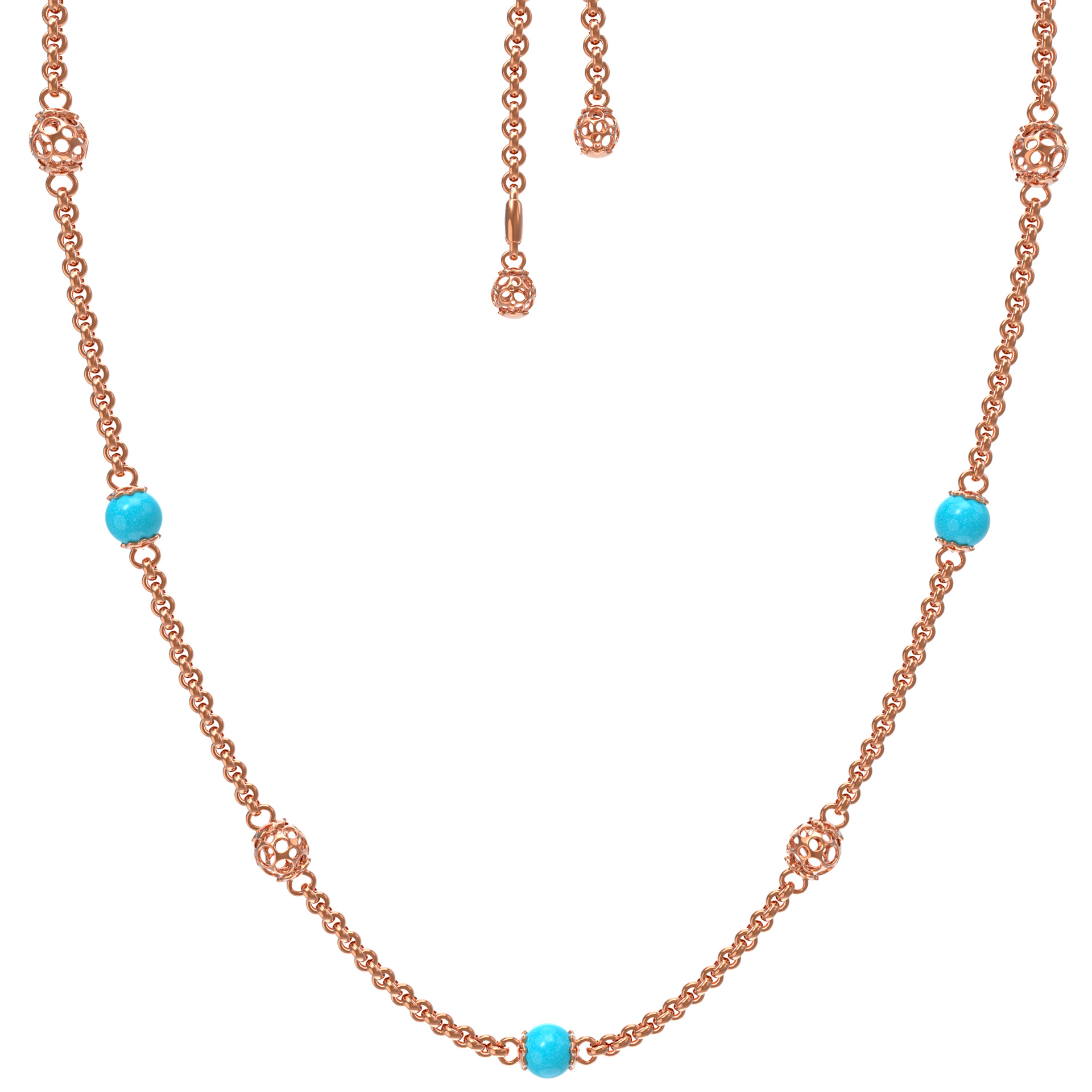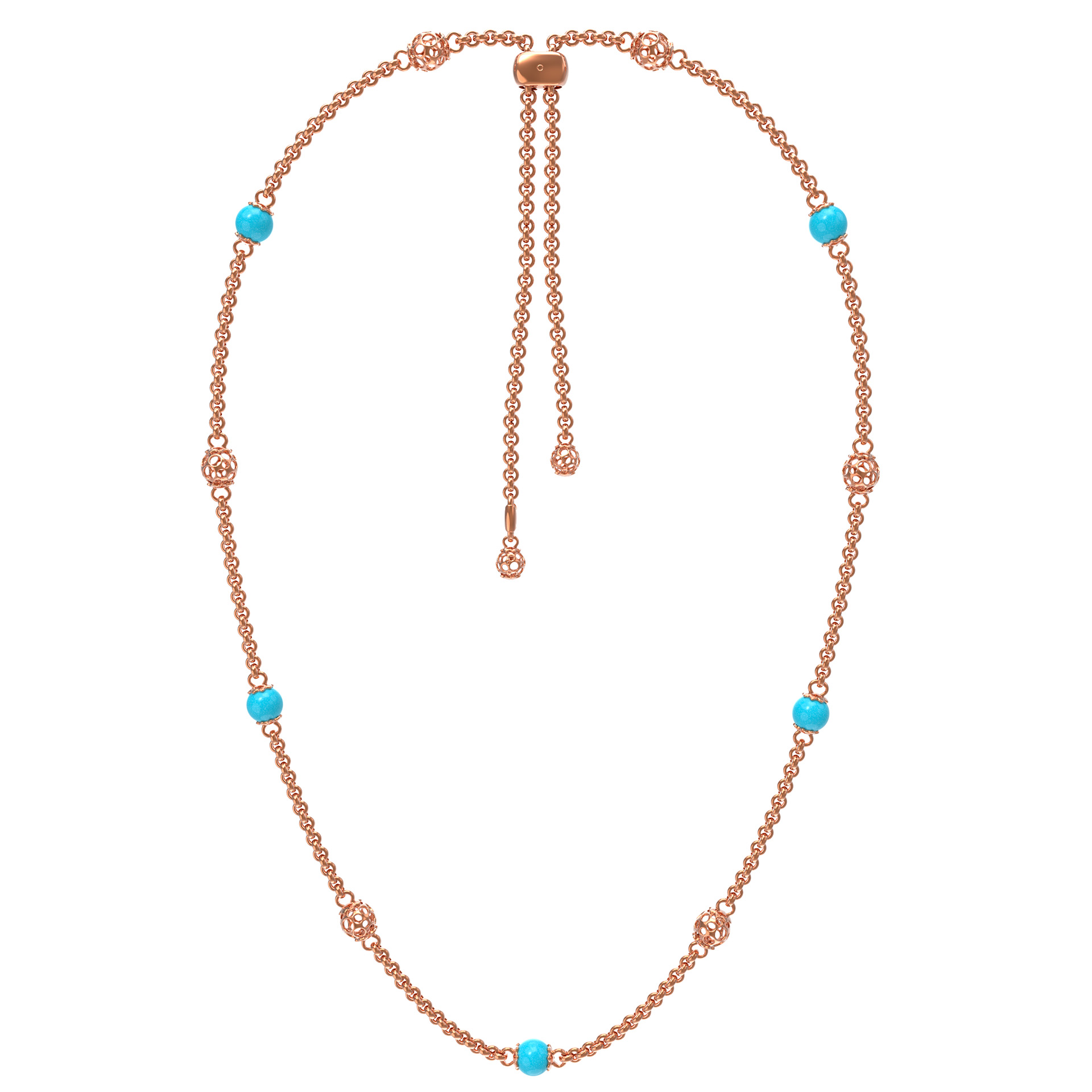 Центральным акцентом изделия выступают пять вставок из натуральной бирюзы. Яркий, насыщенный бирюзовый цвет камней в форме бусин эффектно контрастирует с теплым блеском красного золота, создавая гармоничное и притягательное сочетание. Это универсальный аксессуар, который подойдет как для женщин, так и для мужчин, предпочитающих подчеркнуть свой стиль статусным украшением с этническими нотками.