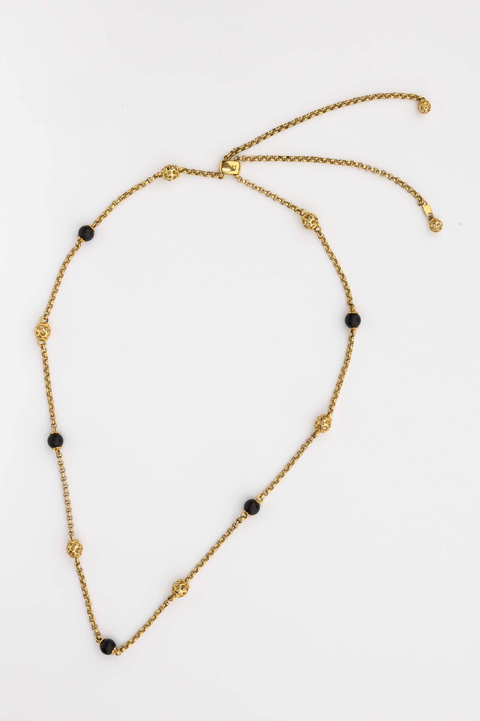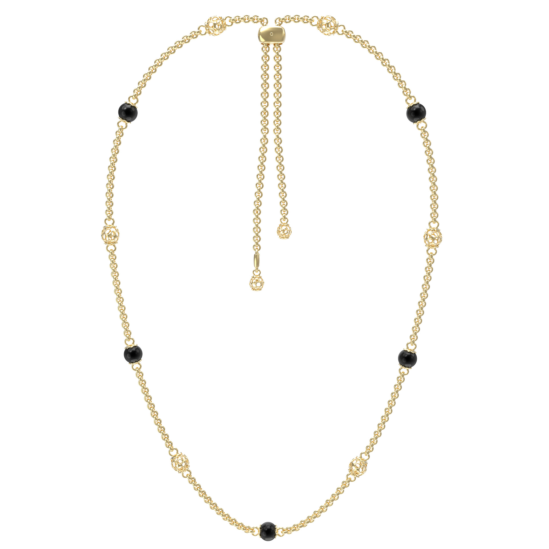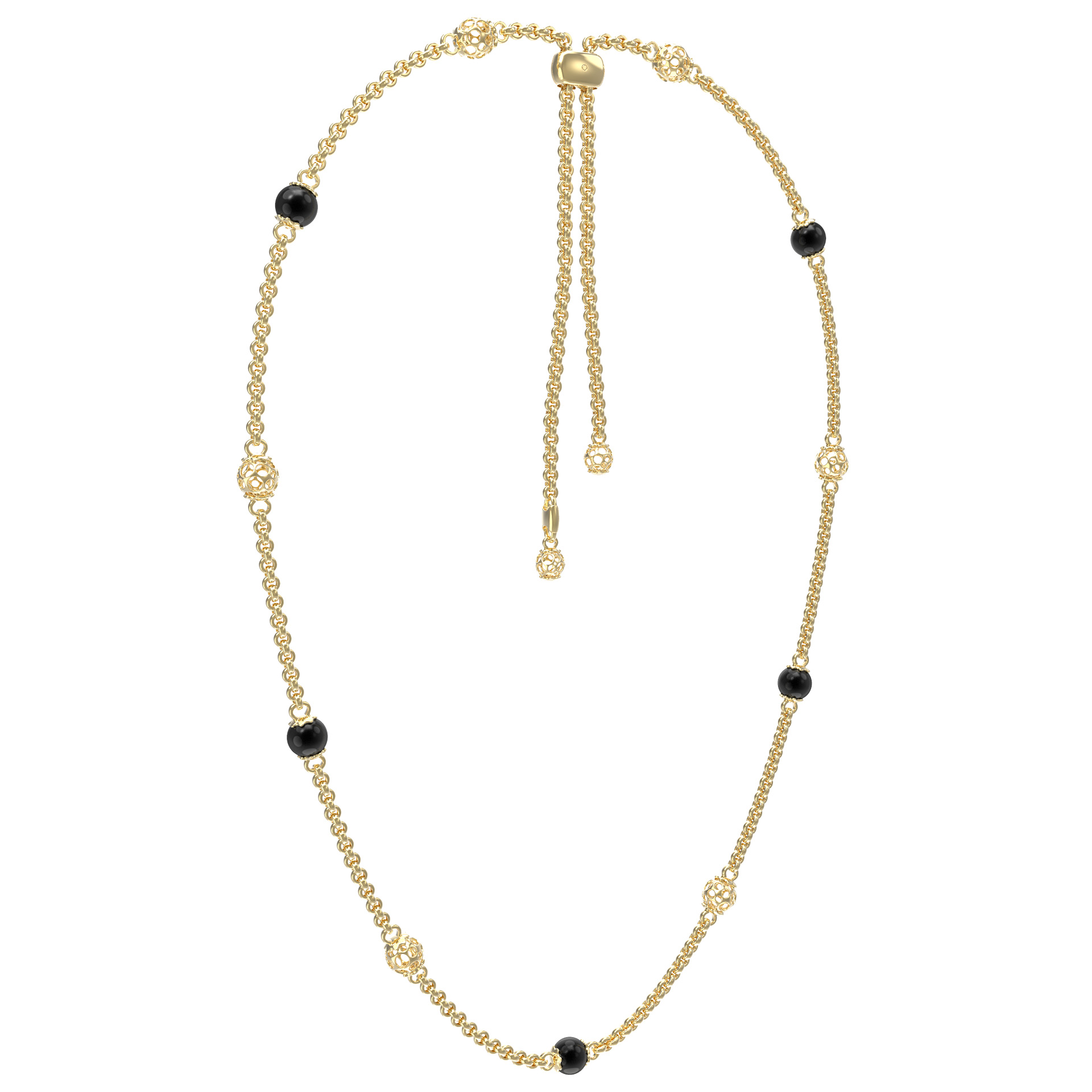 Центральными элементами композиции выступают пять вставок из оникса черного цвета, выполненные в форме изящных бусин. Контрастное сочетание насыщенного темного оникса и солнечного оттенка лимонного золота создает выразительную игру цветов, привлекая внимание к зоне декольте. Особую эстетику украшению придают декоративные золотые элементы ажурной формы, которые чередуются с камнями по всей длине цепочки, добавляя изделию легкости и воздушности.