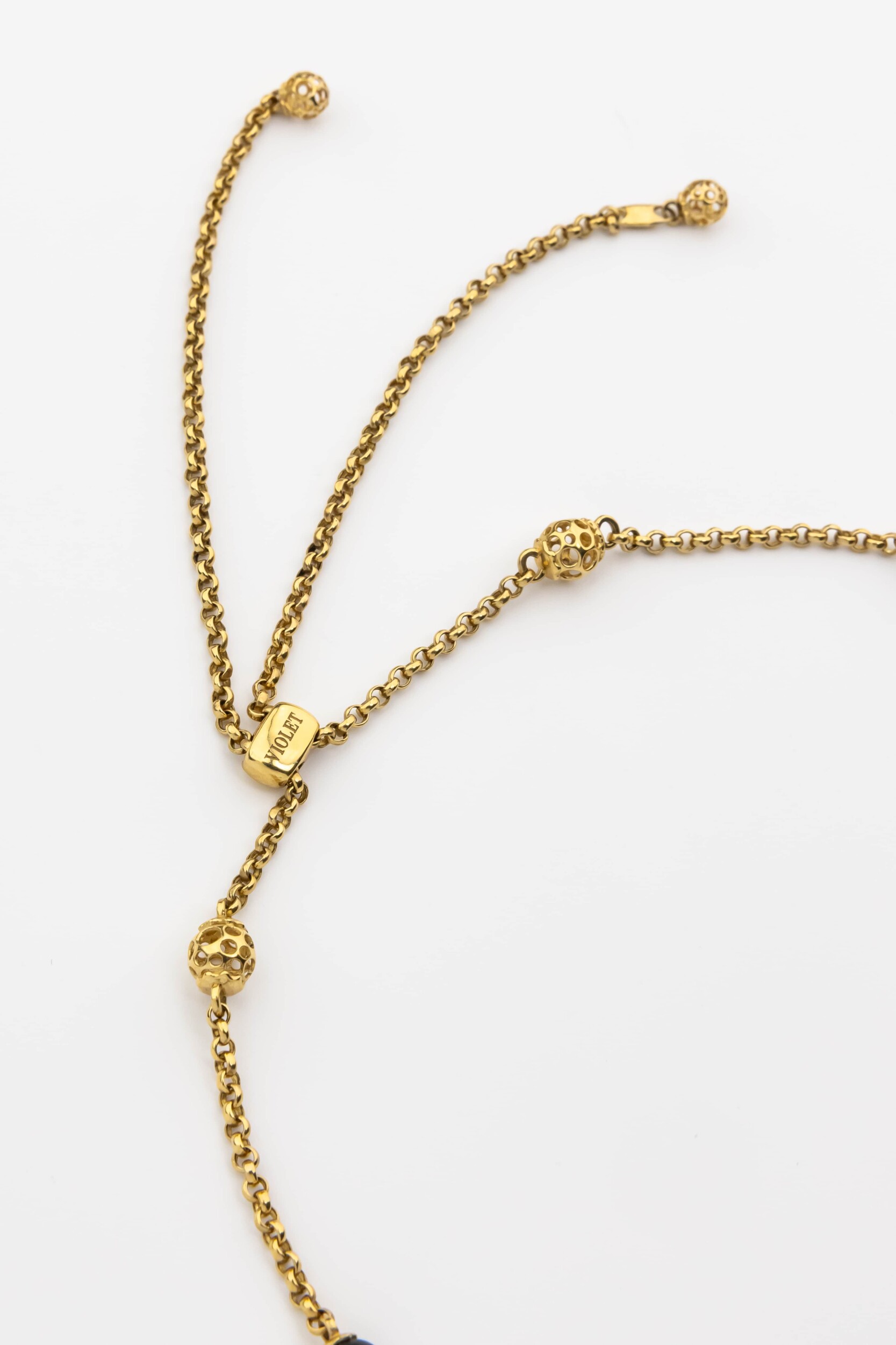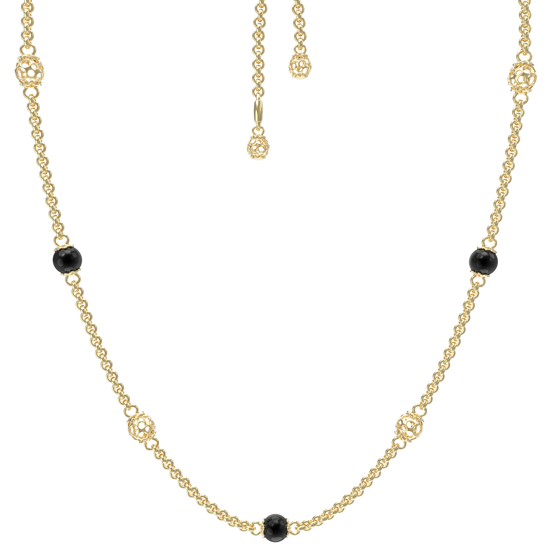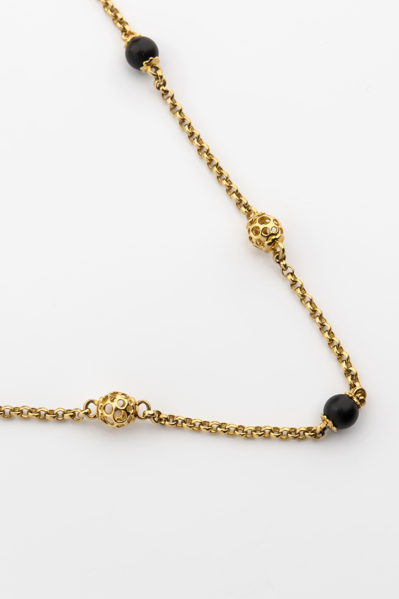 Центральными элементами композиции выступают пять вставок из оникса черного цвета, выполненные в форме изящных бусин. Контрастное сочетание насыщенного темного оникса и солнечного оттенка лимонного золота создает выразительную игру цветов, привлекая внимание к зоне декольте. Особую эстетику украшению придают декоративные золотые элементы ажурной формы, которые чередуются с камнями по всей длине цепочки, добавляя изделию легкости и воздушности.