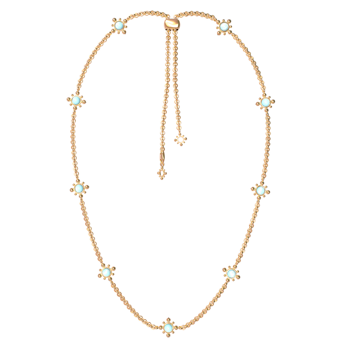 Изысканное колье из красного золота 585 пробы из коллекции De Luxe — Индия станет утонченным дополнением вашего образа. Это украшение вдохновлено традиционными мотивами, воплощенными в современном дизайне, и отражает яркий и запоминающийся стиль Индии. Тонкая и изящная цепочка из красного золота гармонично сочетается с девятью вставками из натуральной бирюзы, создавая эффектный контраст.